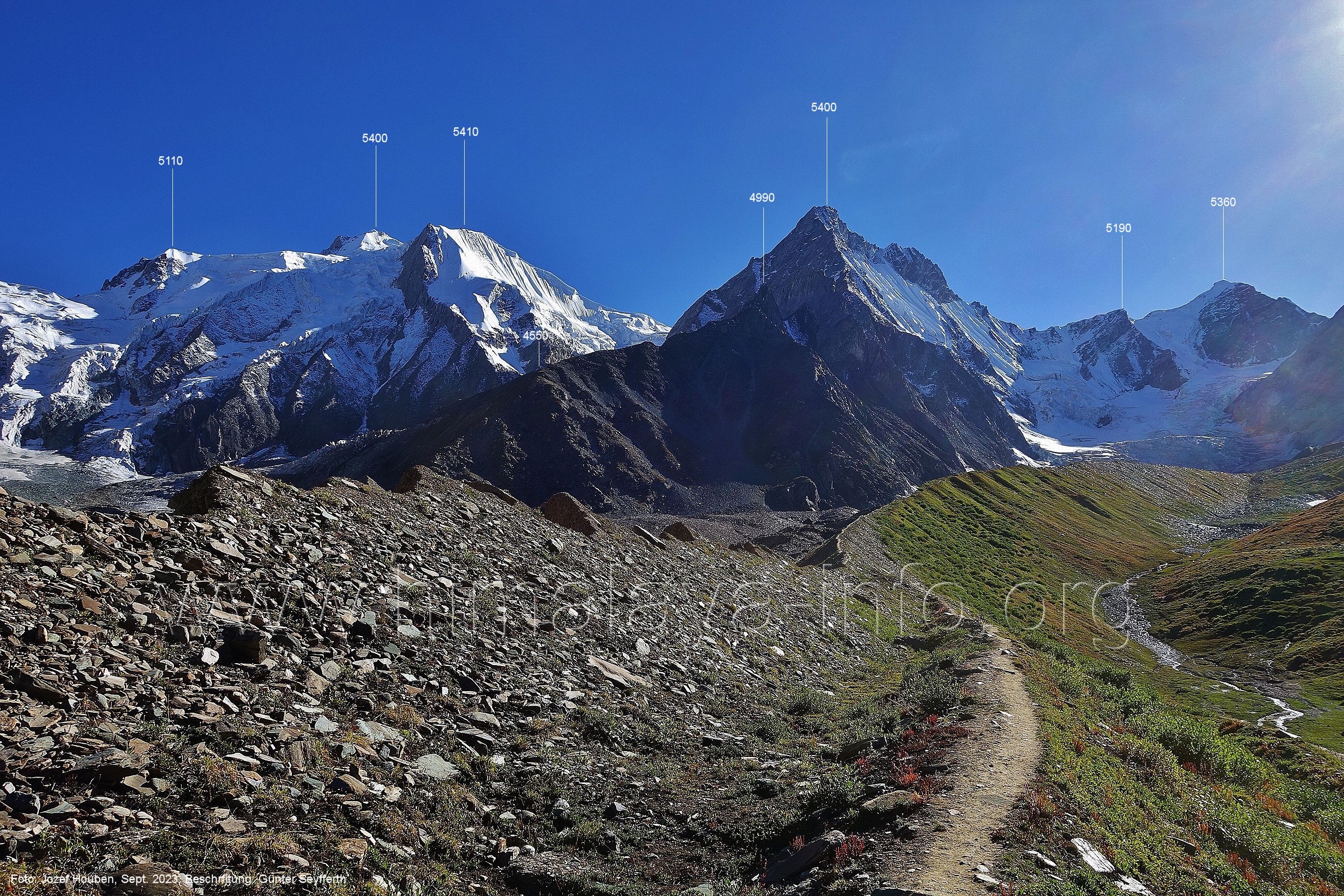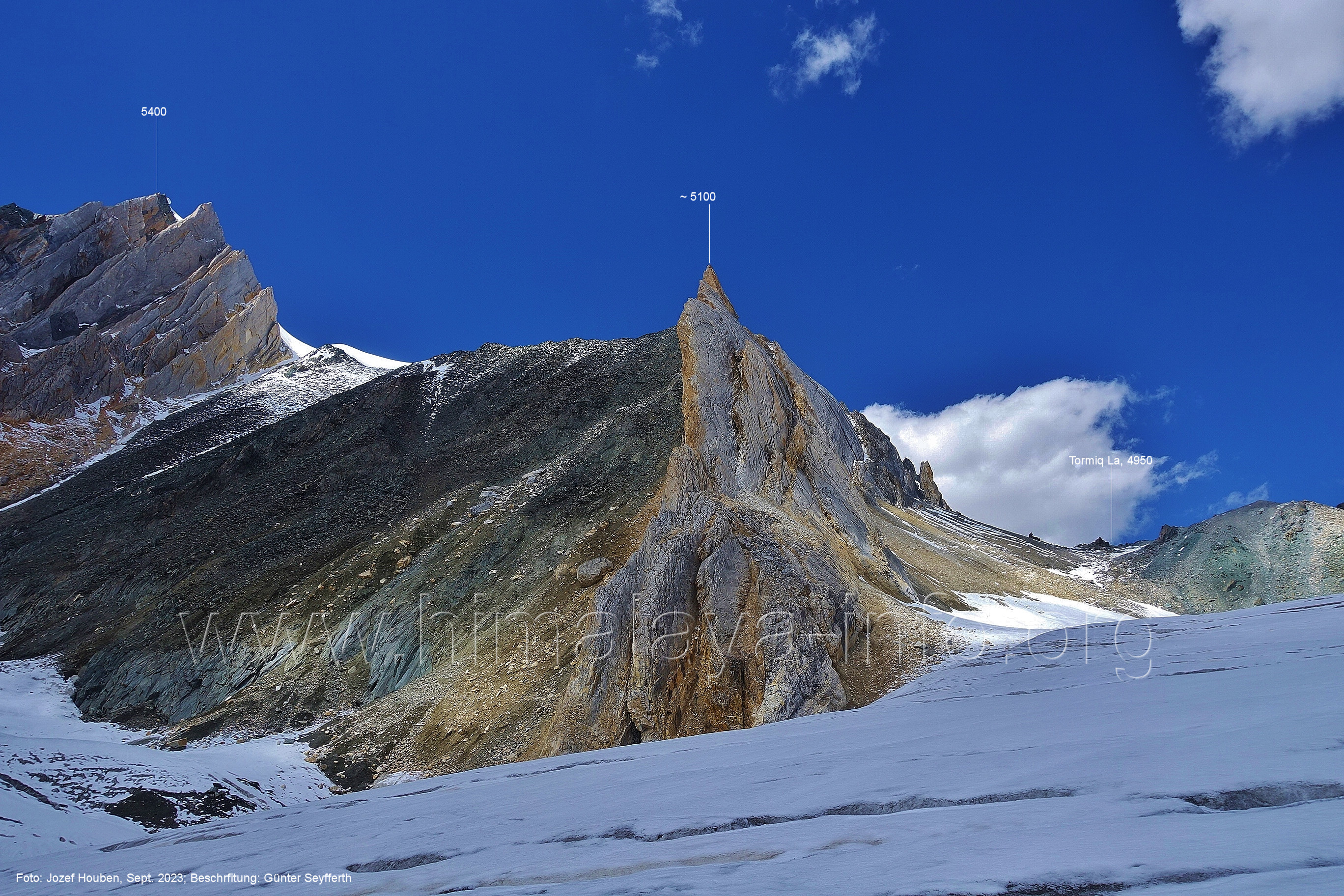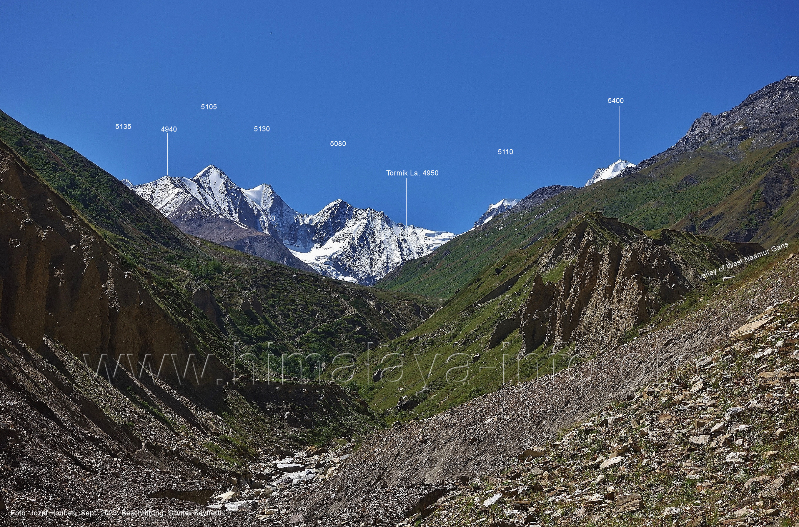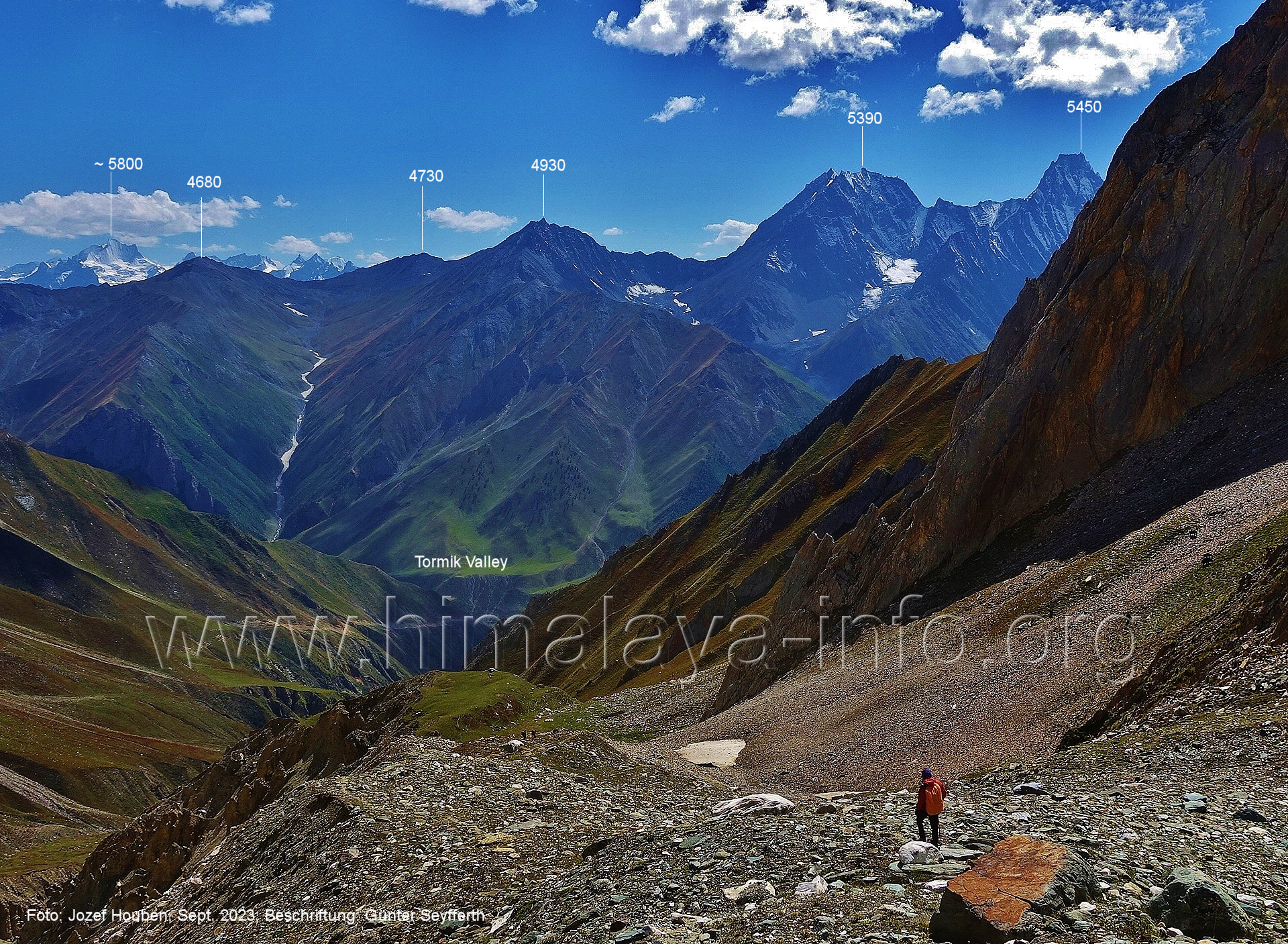 (70) Rückblick bei 75°05'40" in ca. 3930 m Höhe nach Osten Foto: Jozef Houben, Aug. 2023; Beschriftung: Günter Seyfferth (71) Blick bei 75°05'20" nach Süden mit Kapaltang Kun (6237 m) und Peak 5470