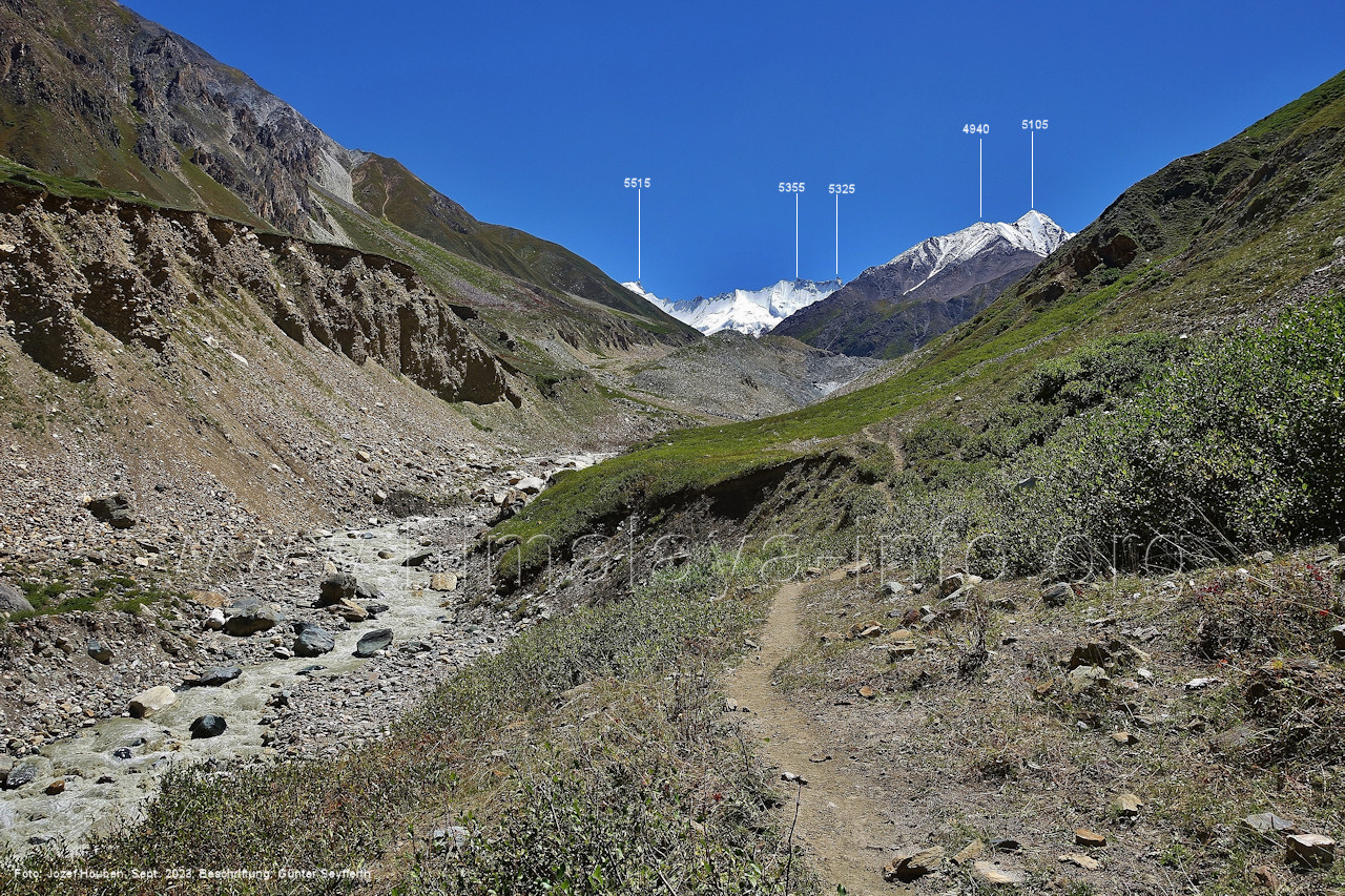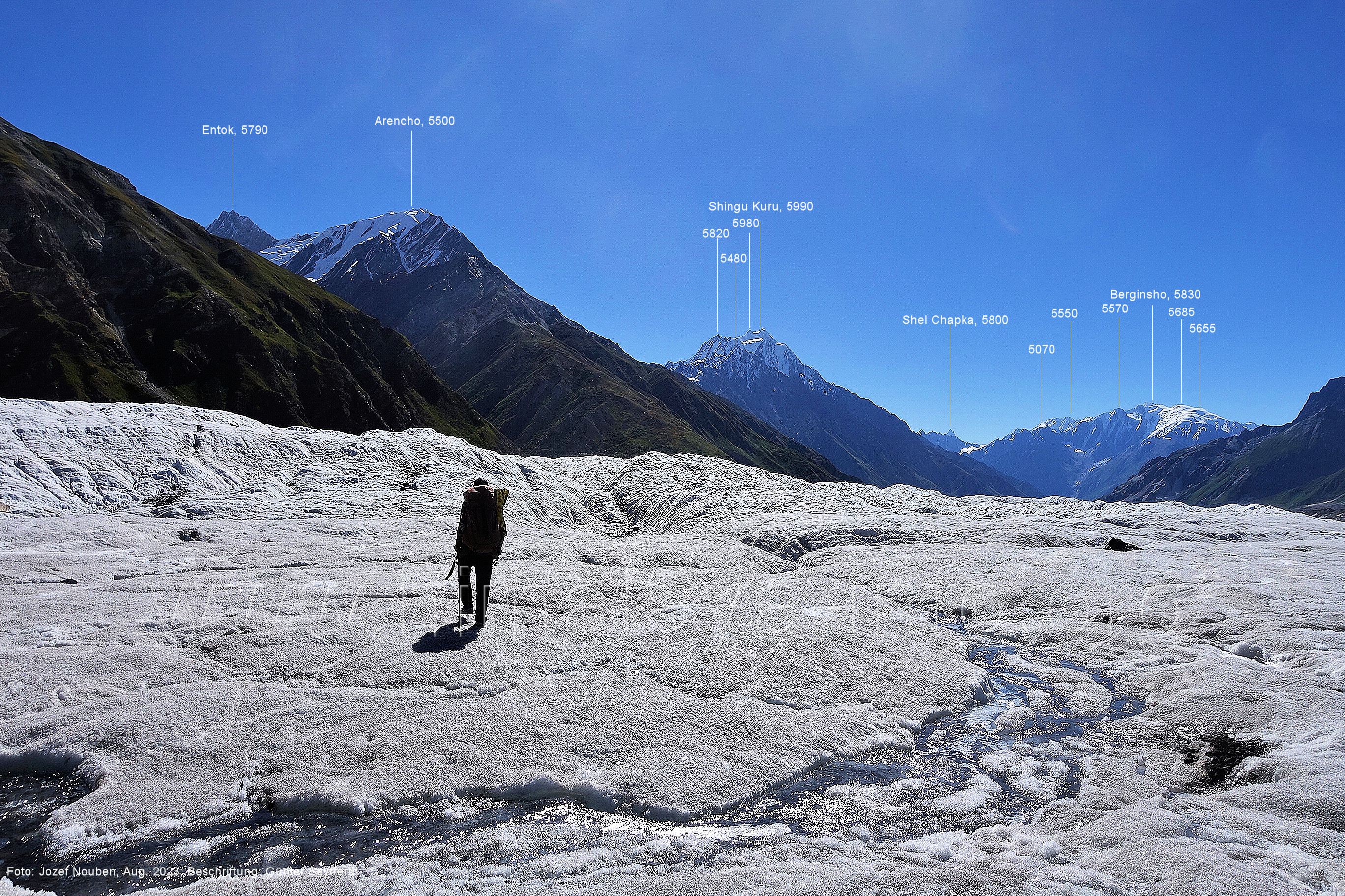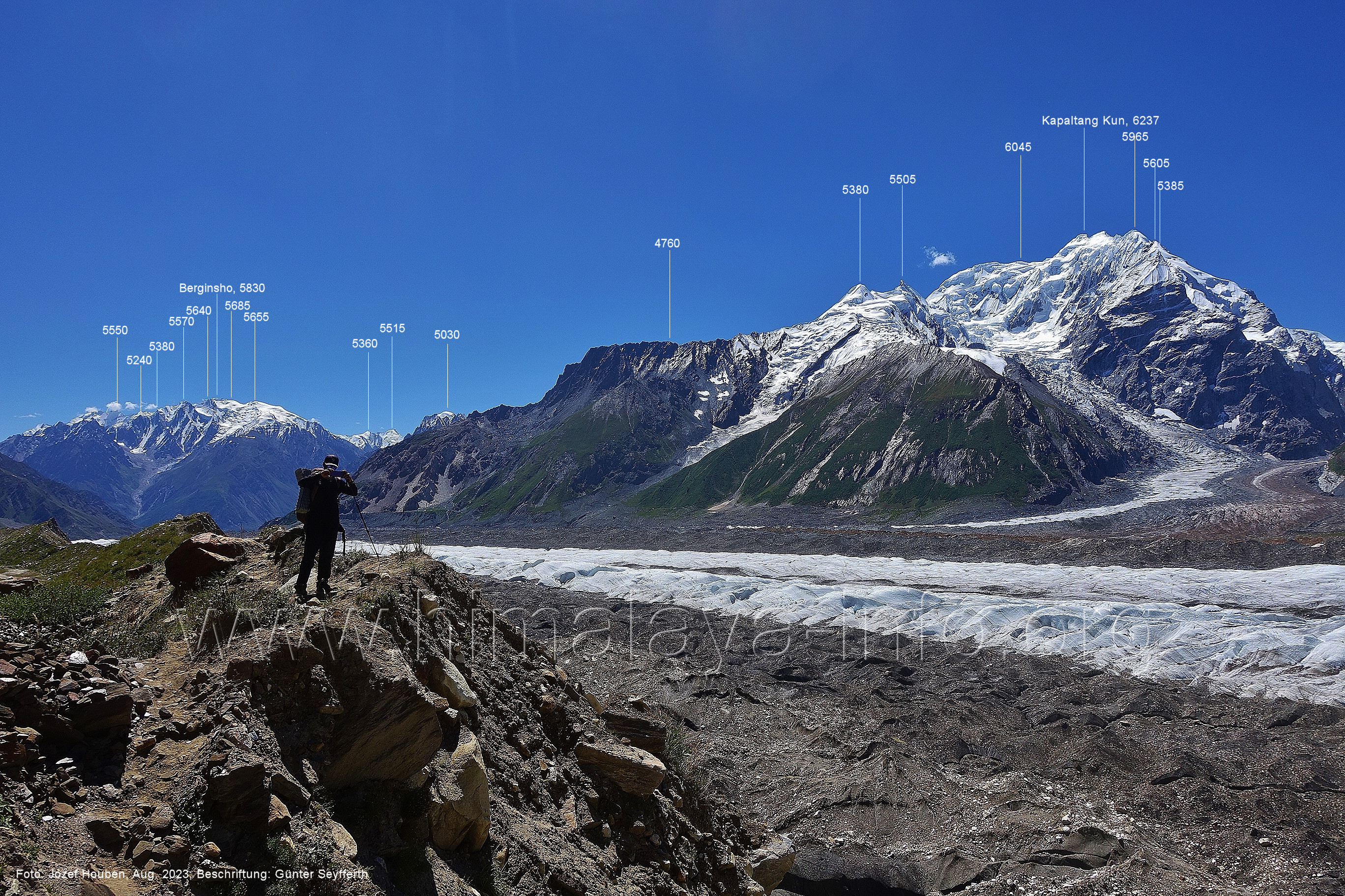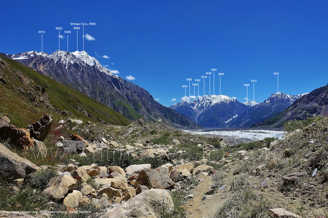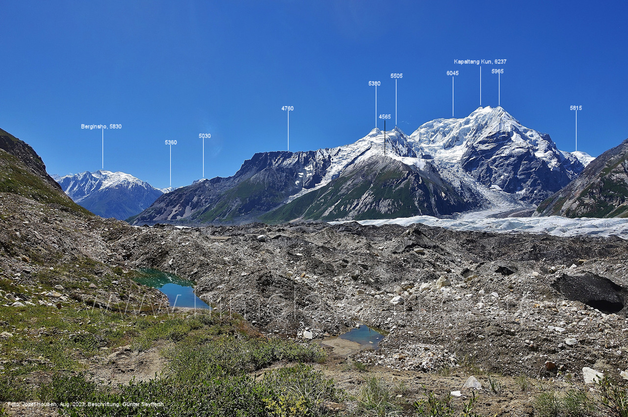 den Gipfeln über dem Trekking-Pfad sieht. Foto: Jozef Houben, Aug. 2023; Beschriftung: Günter Seyfferth (32) Blick bei 75°12'07" (Shing Kuru) nach Süd-Südwesten zum Kapaltang Kun (6237) und dem Marpoh-Gletscher