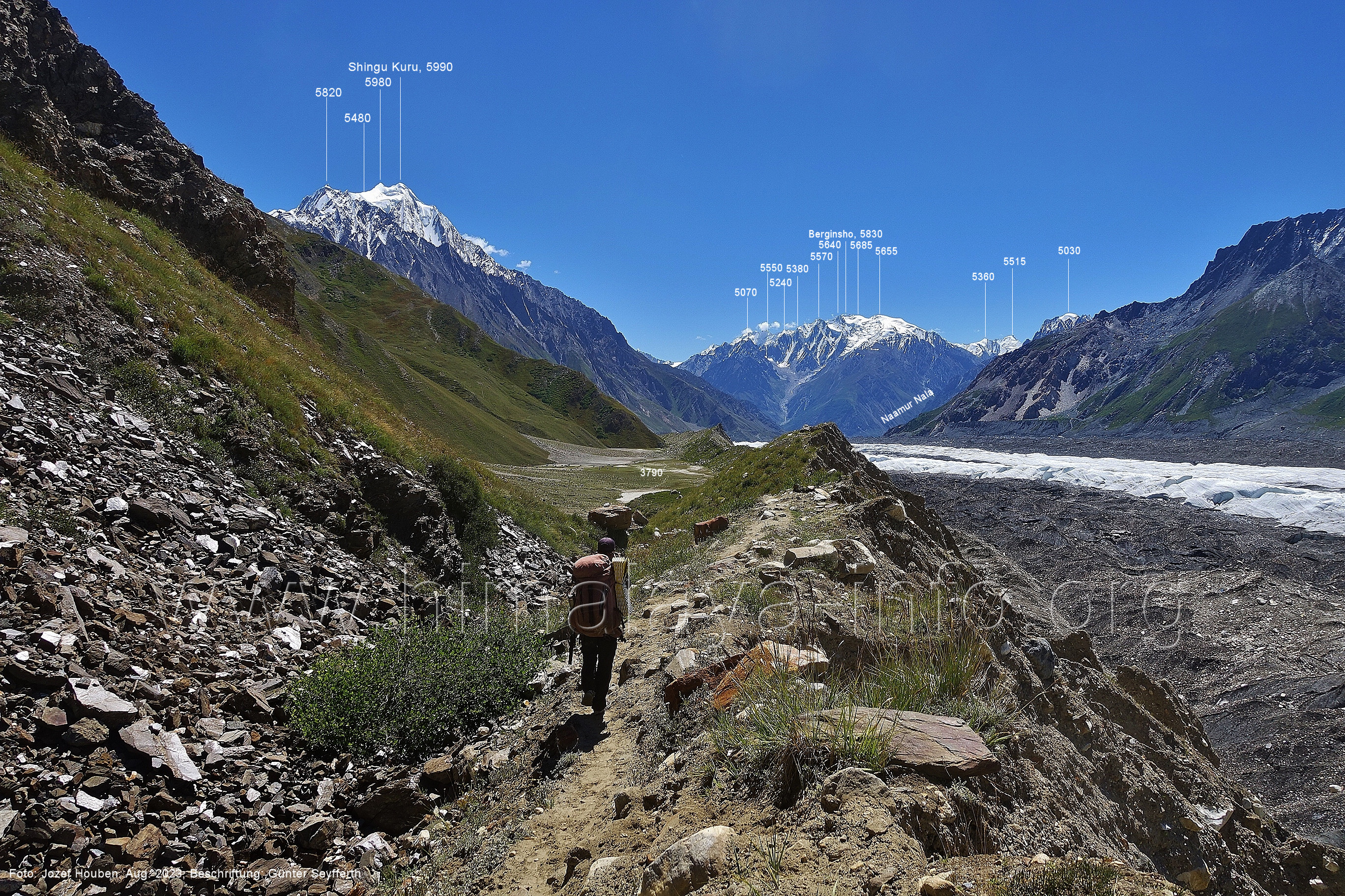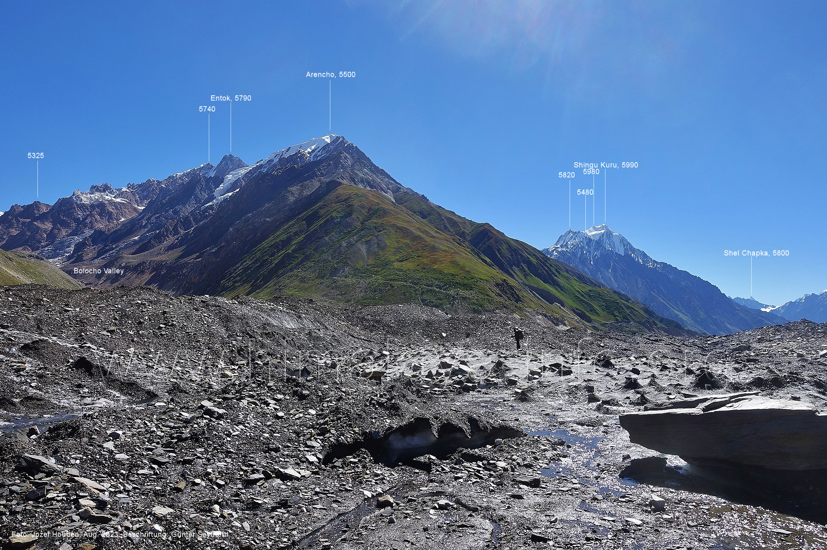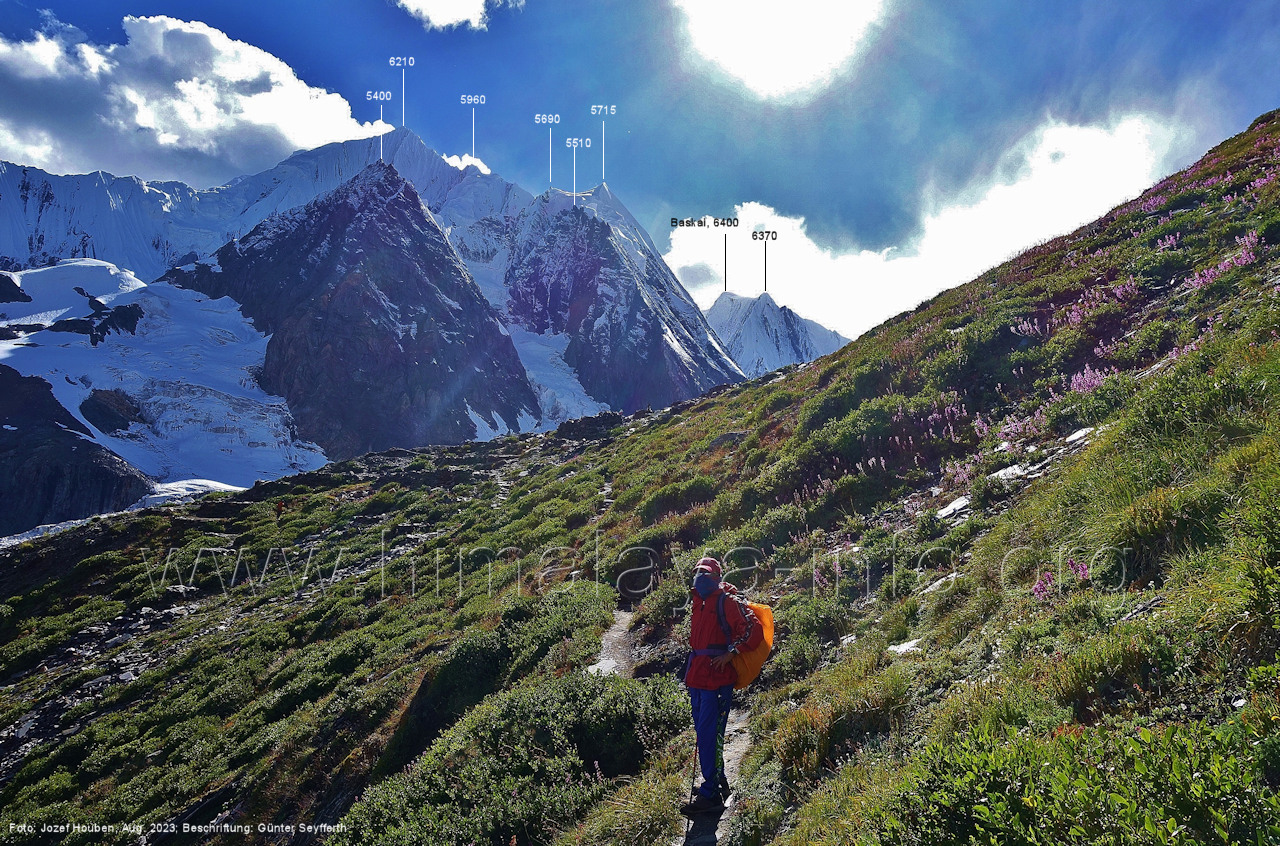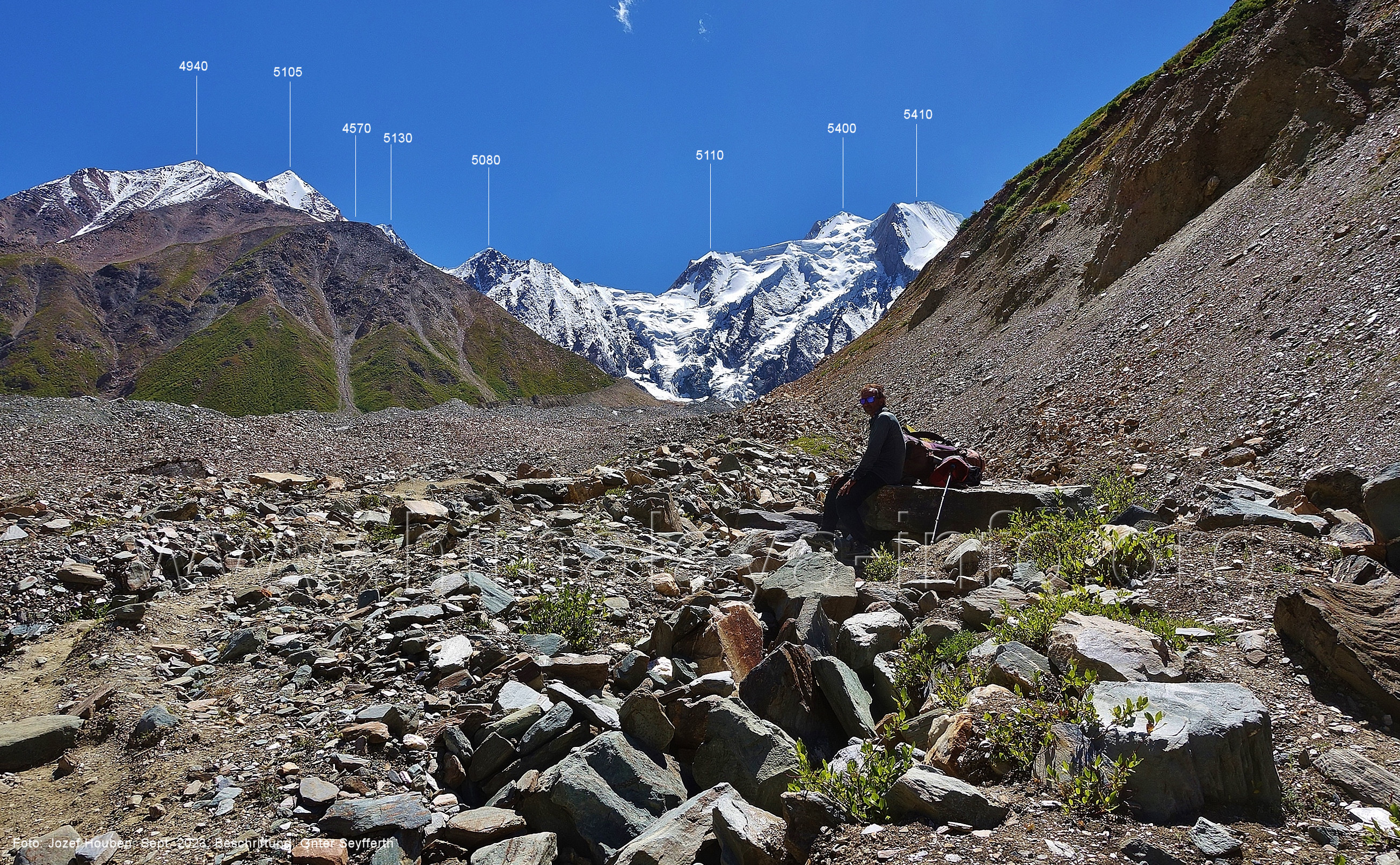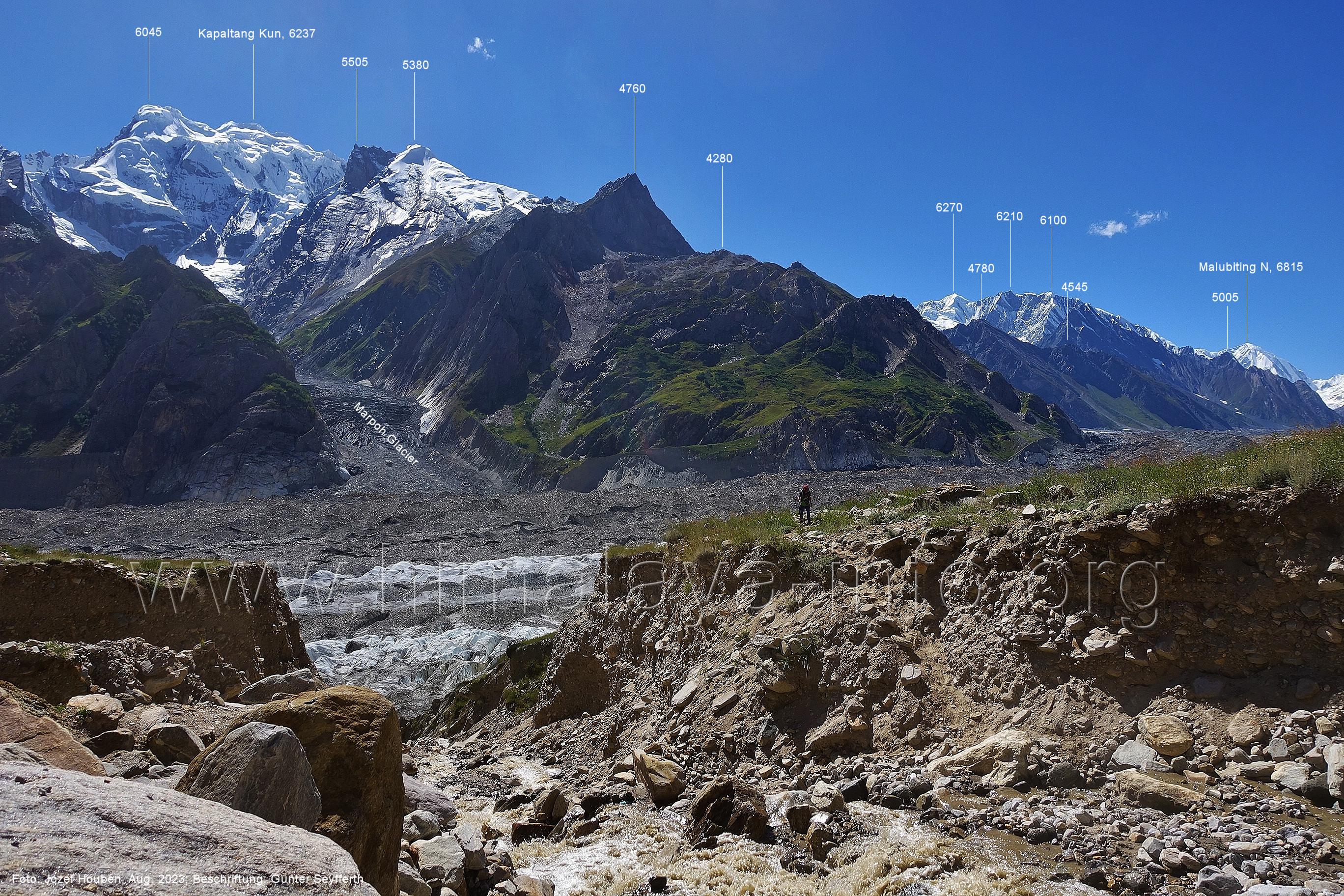 den Gipfeln über dem Trekking-Pfad sieht. Foto: Jozef Houben, Aug. 2023; Beschriftung: Günter Seyfferth (32) Blick bei 75°12'07" (Shing Kuru) nach Süd-Südwesten zum Kapaltang Kun (6237) und dem Marpoh-Gletscher