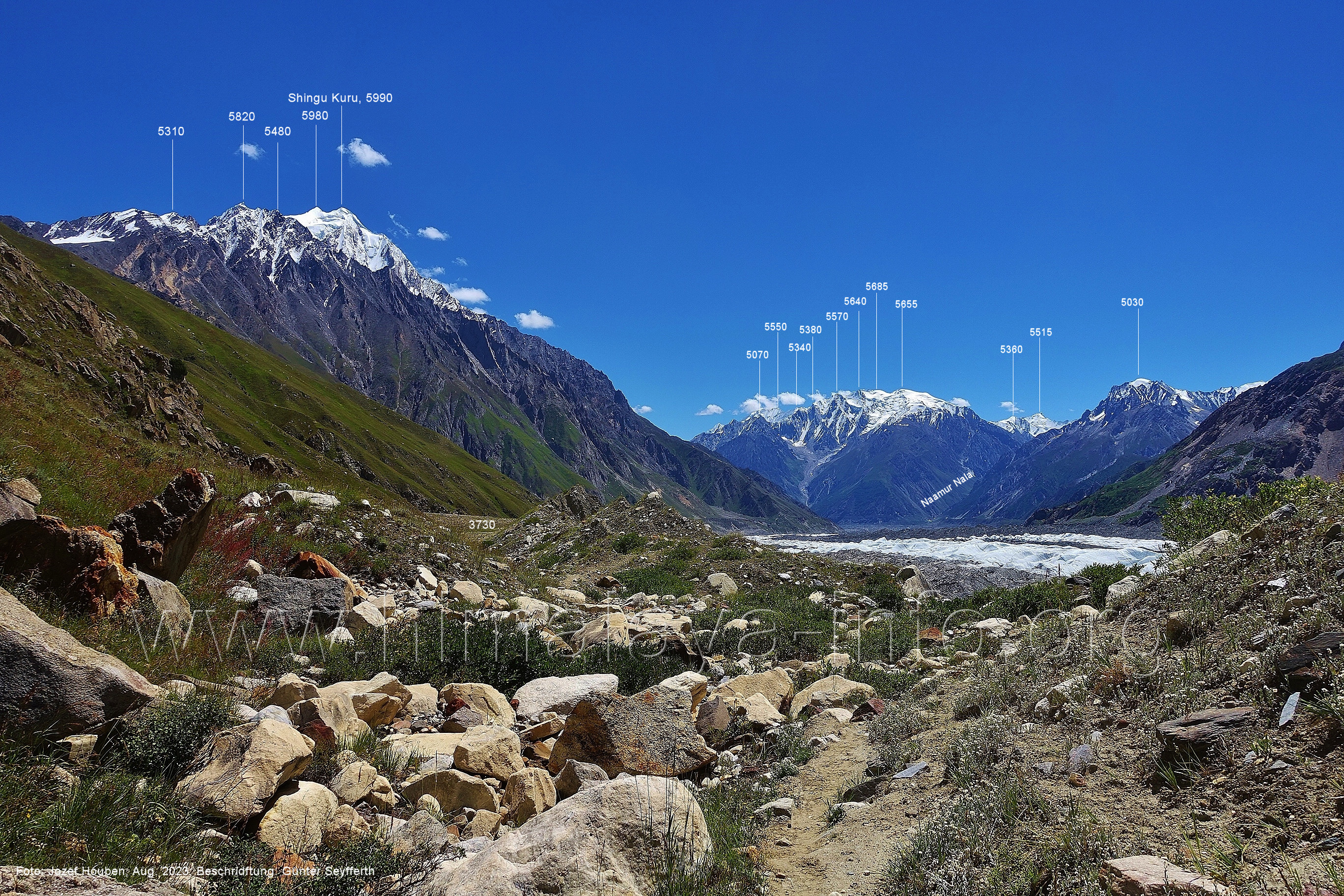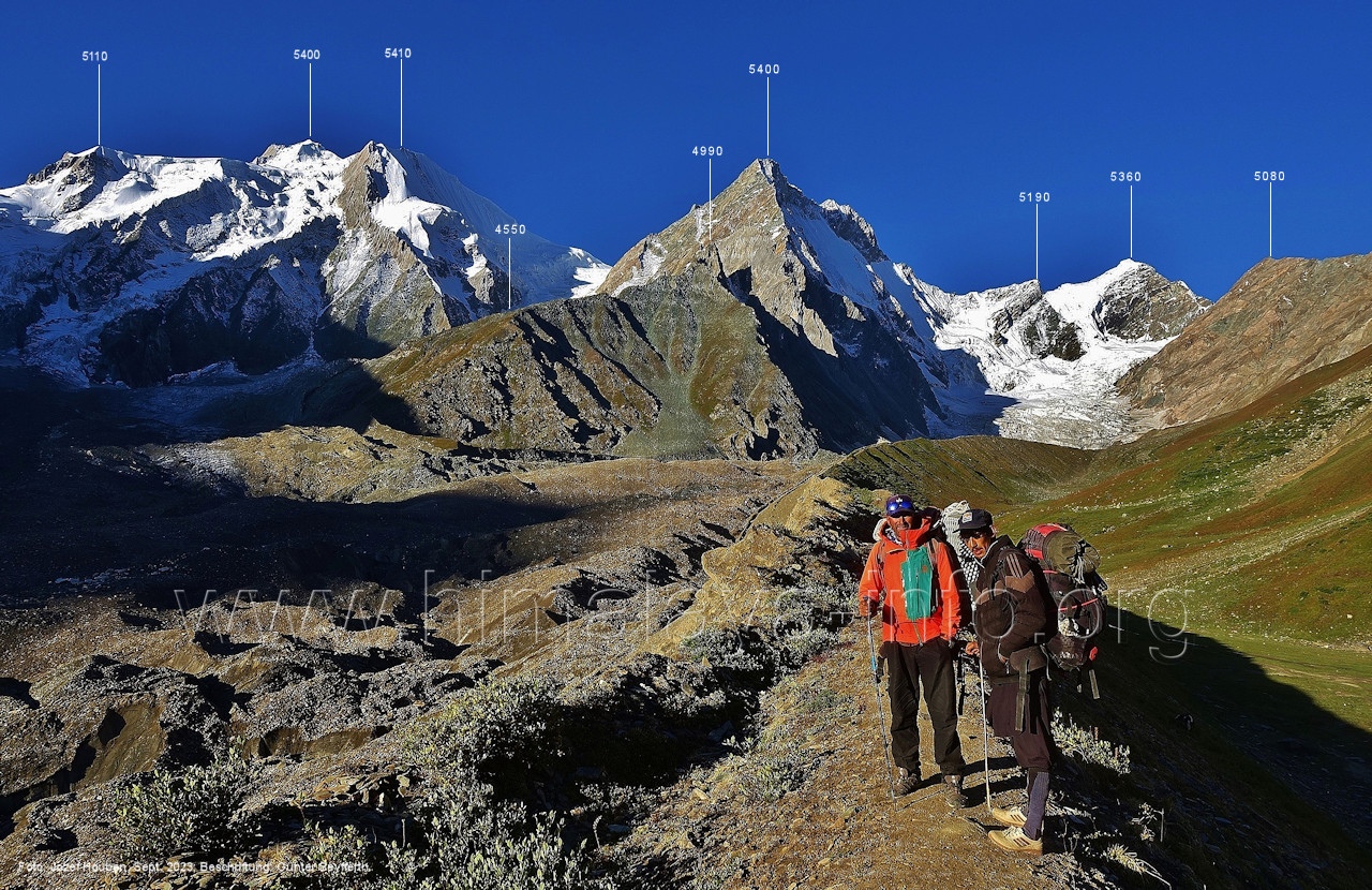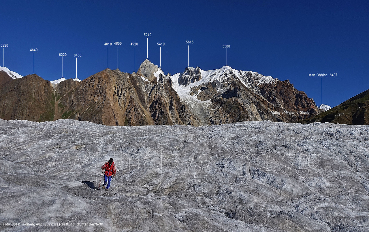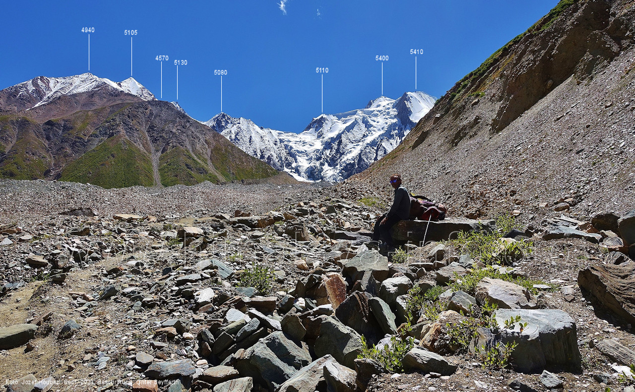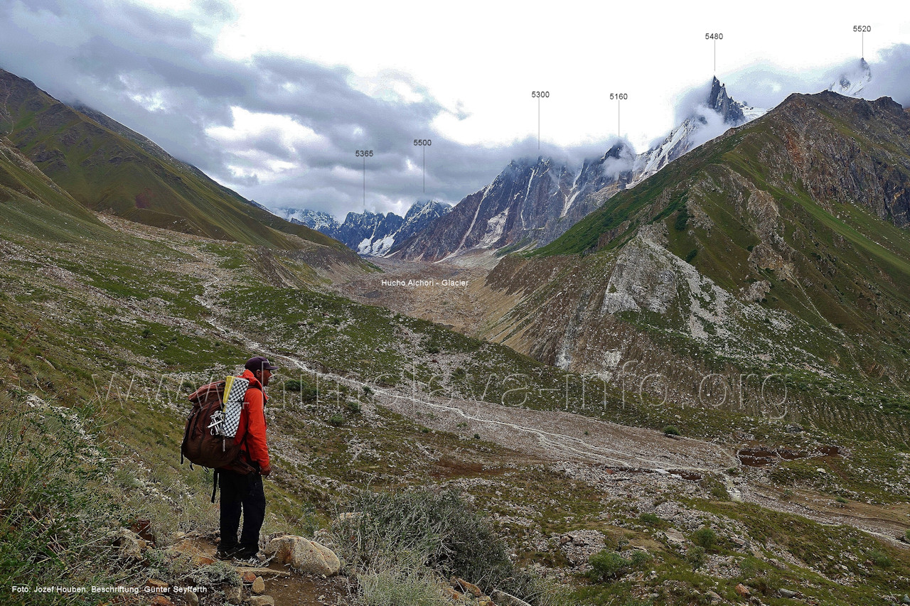 den Gipfeln über dem Trekking-Pfad sieht. Foto: Jozef Houben, Aug. 2023; Beschriftung: Günter Seyfferth (32) Blick bei 75°12'07" (Shing Kuru) nach Süd-Südwesten zum Kapaltang Kun (6237) und dem Marpoh-Gletscher