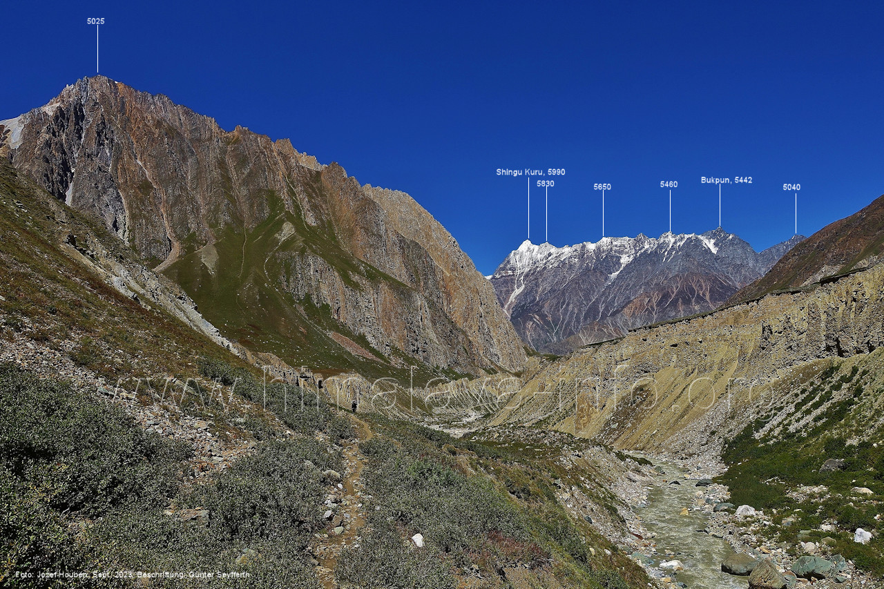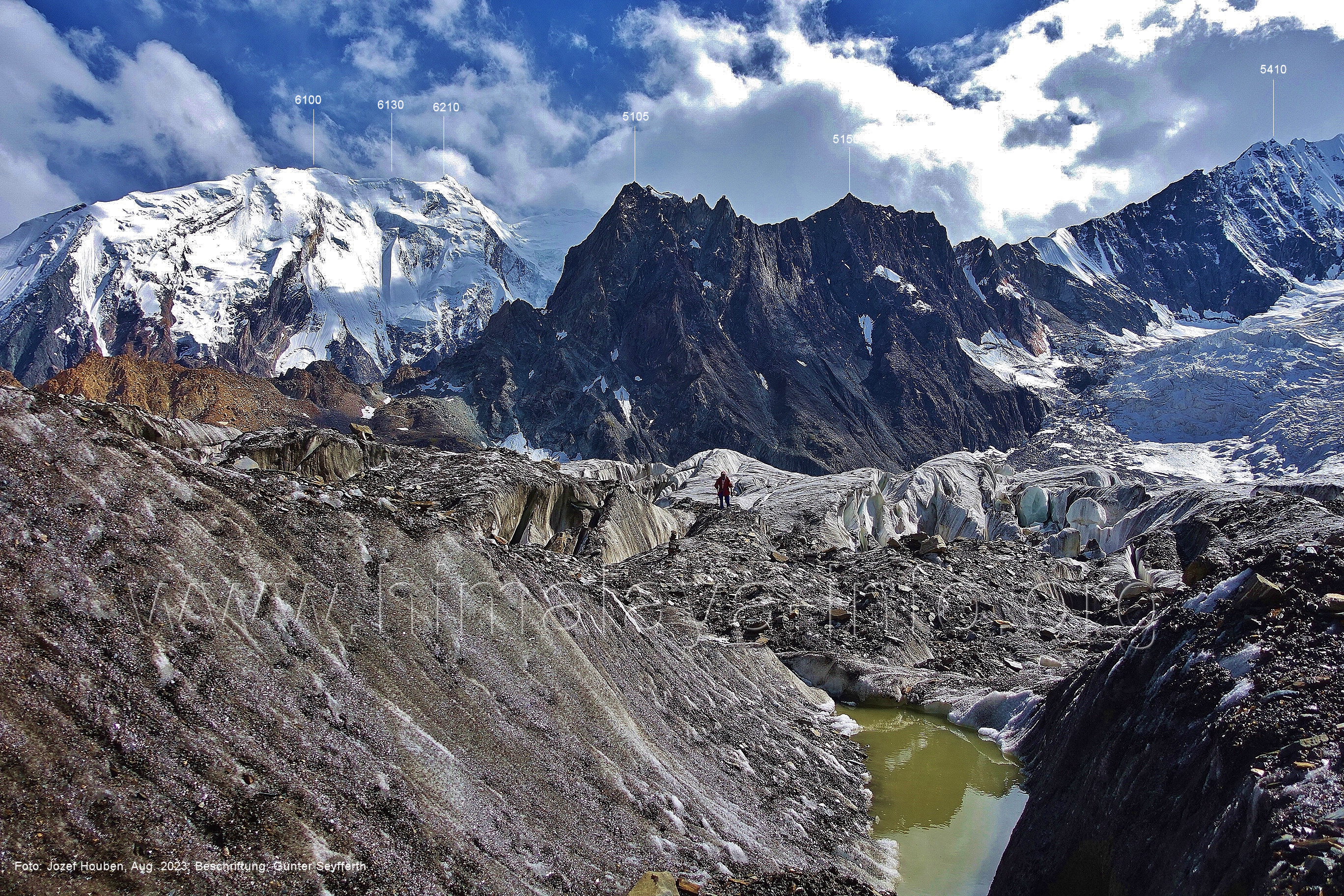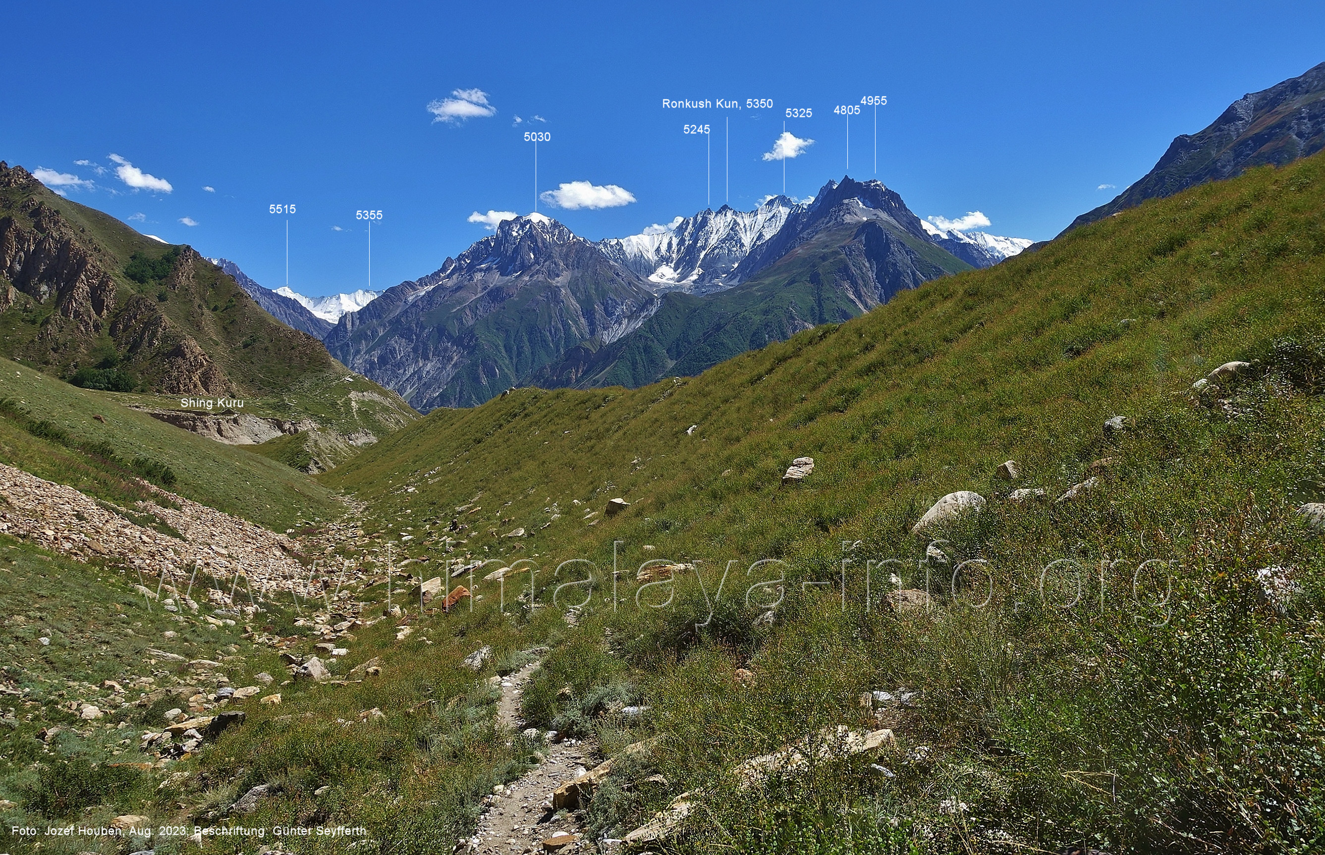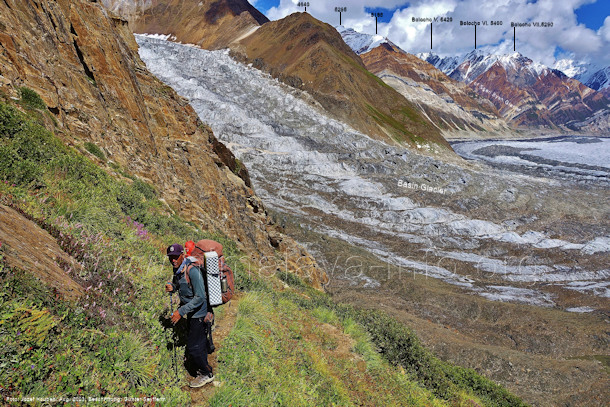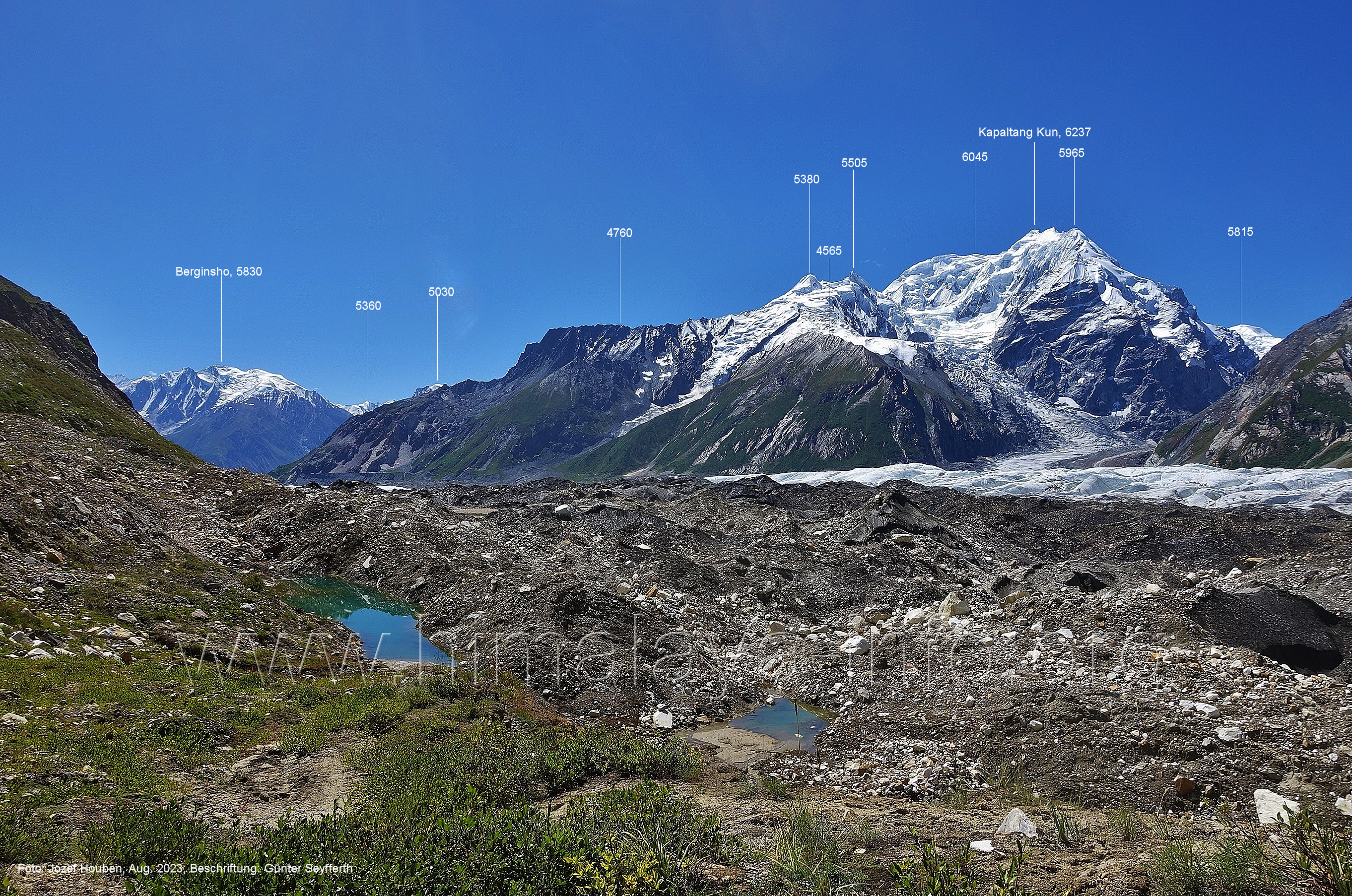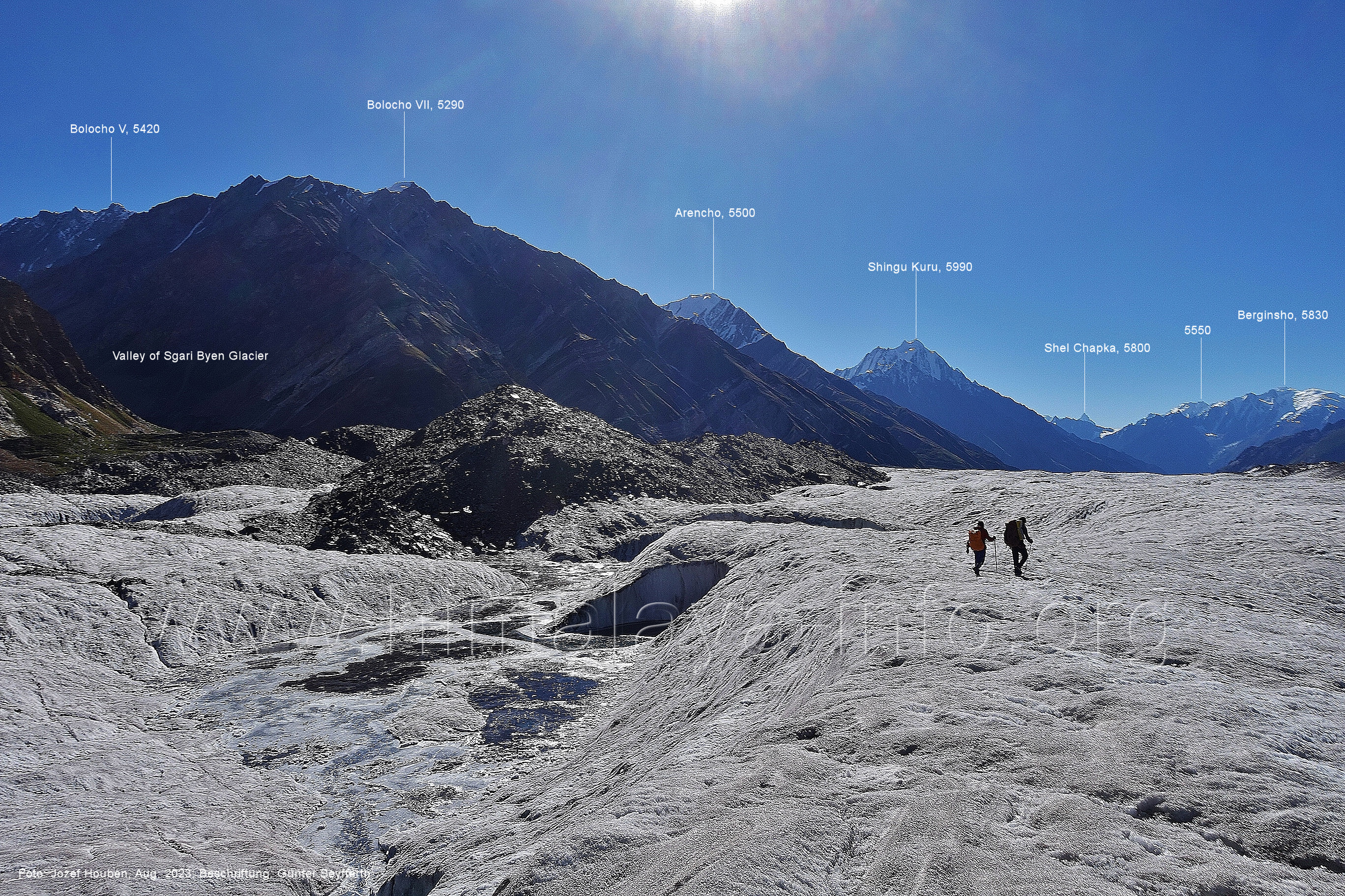 den Gipfeln über dem Trekking-Pfad sieht. Foto: Jozef Houben, Aug. 2023; Beschriftung: Günter Seyfferth (32) Blick bei 75°12'07" (Shing Kuru) nach Süd-Südwesten zum Kapaltang Kun (6237) und dem Marpoh-Gletscher