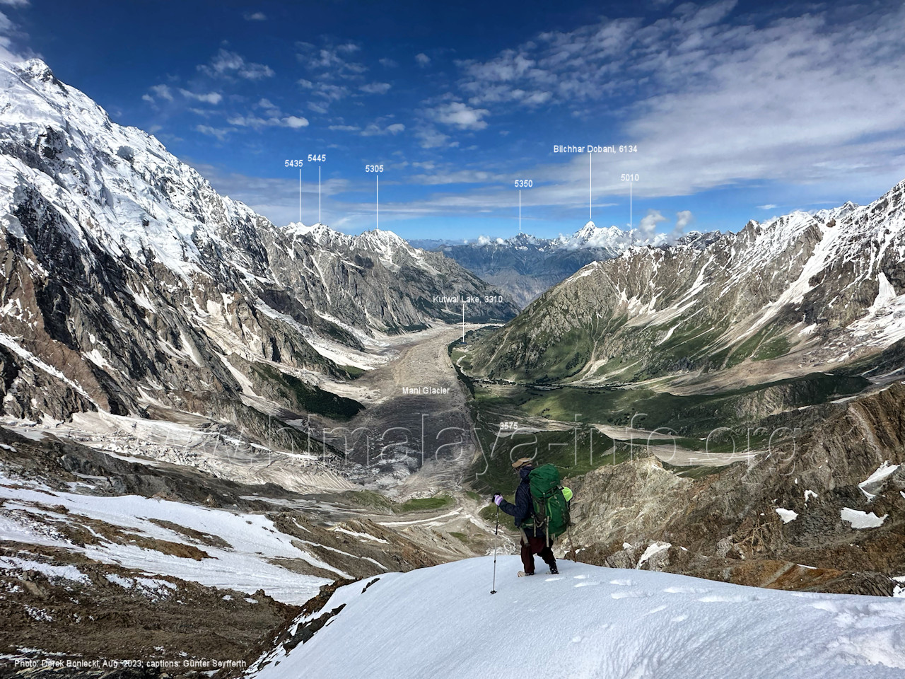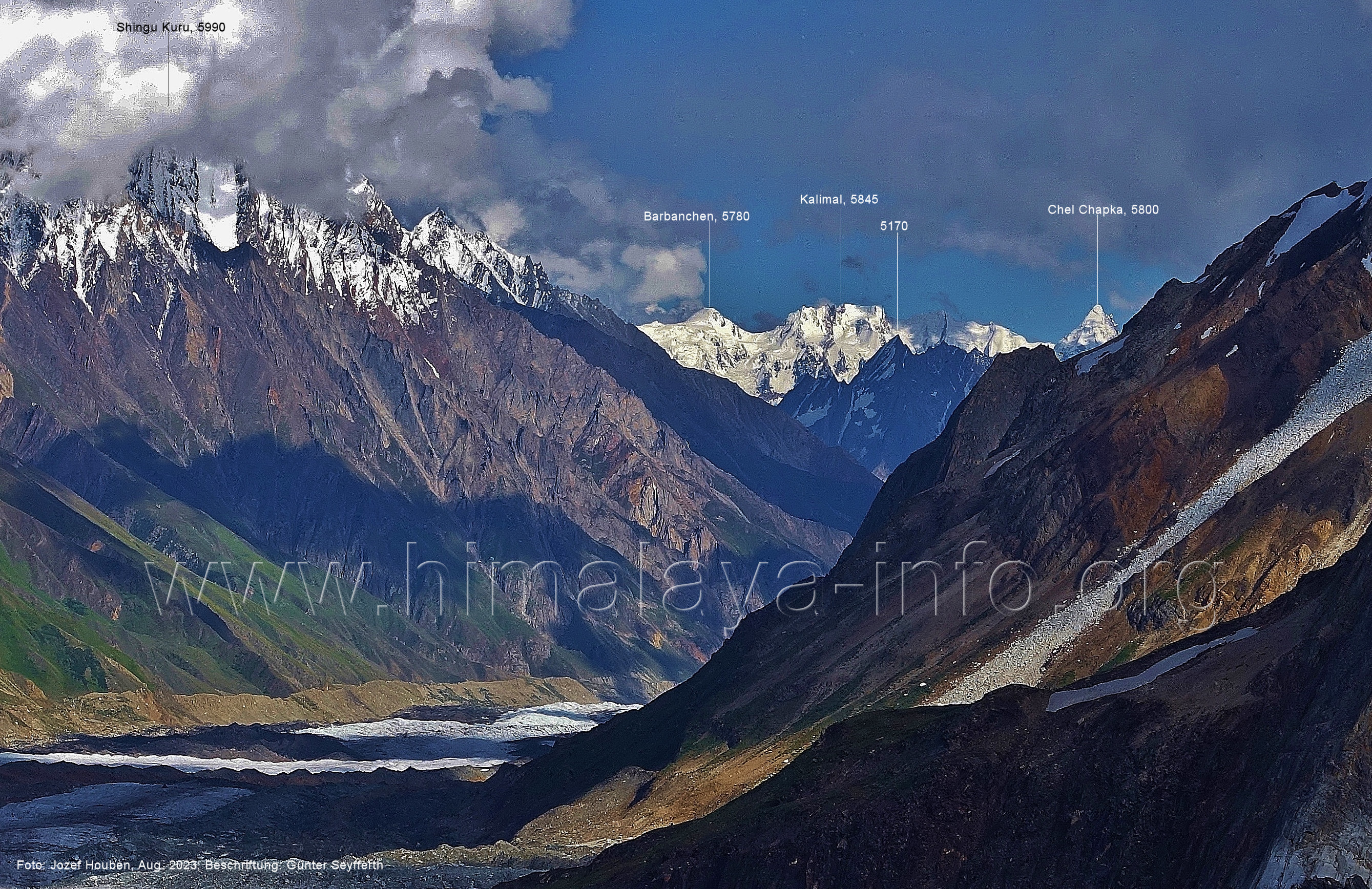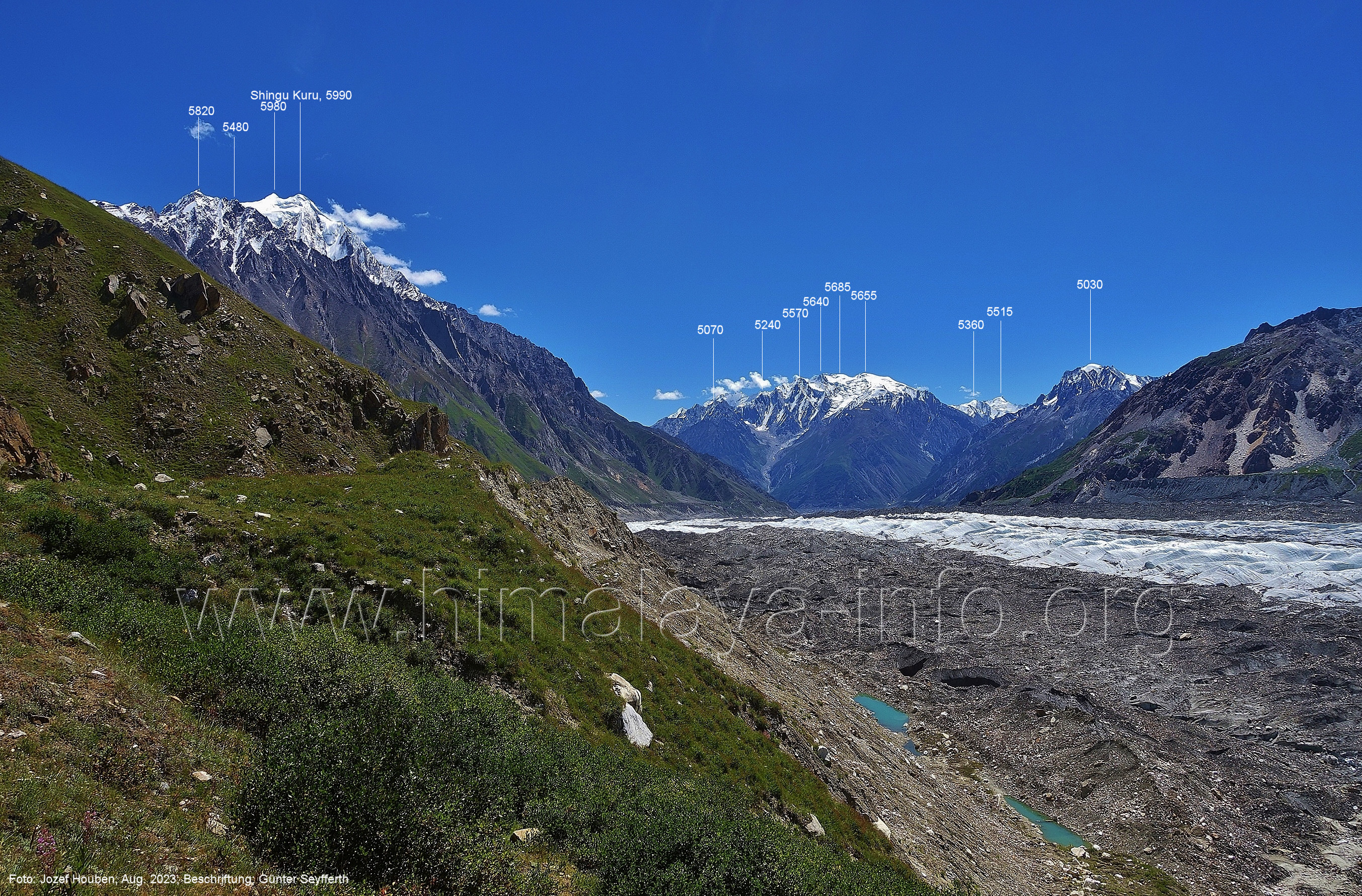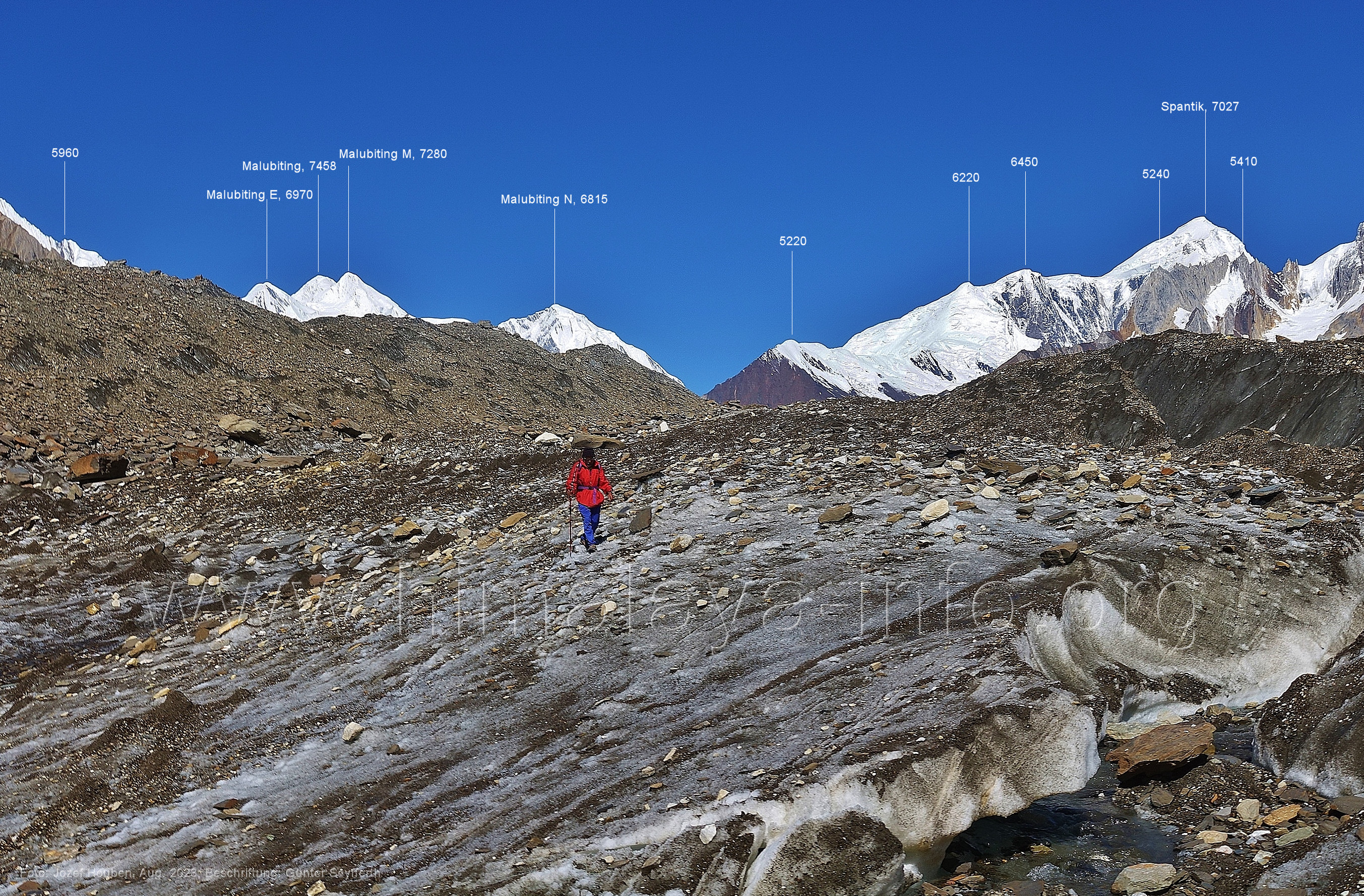 den Gipfeln über dem Trekking-Pfad sieht. Foto: Jozef Houben, Aug. 2023; Beschriftung: Günter Seyfferth (32) Blick bei 75°12'07" (Shing Kuru) nach Süd-Südwesten zum Kapaltang Kun (6237) und dem Marpoh-Gletscher