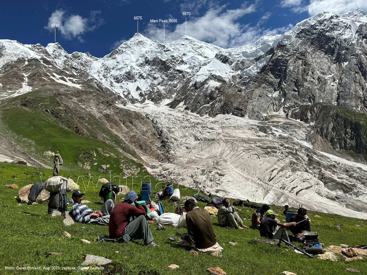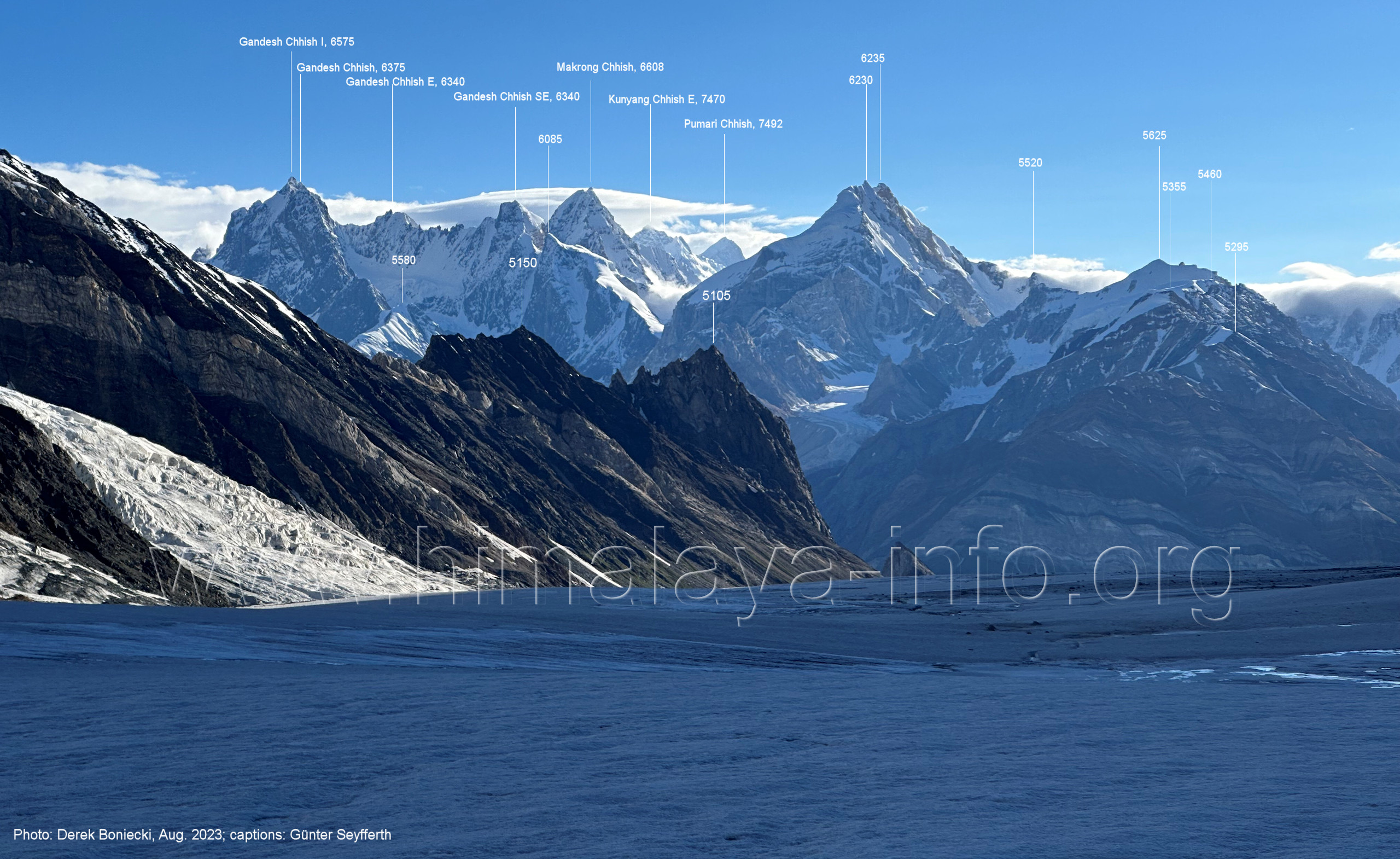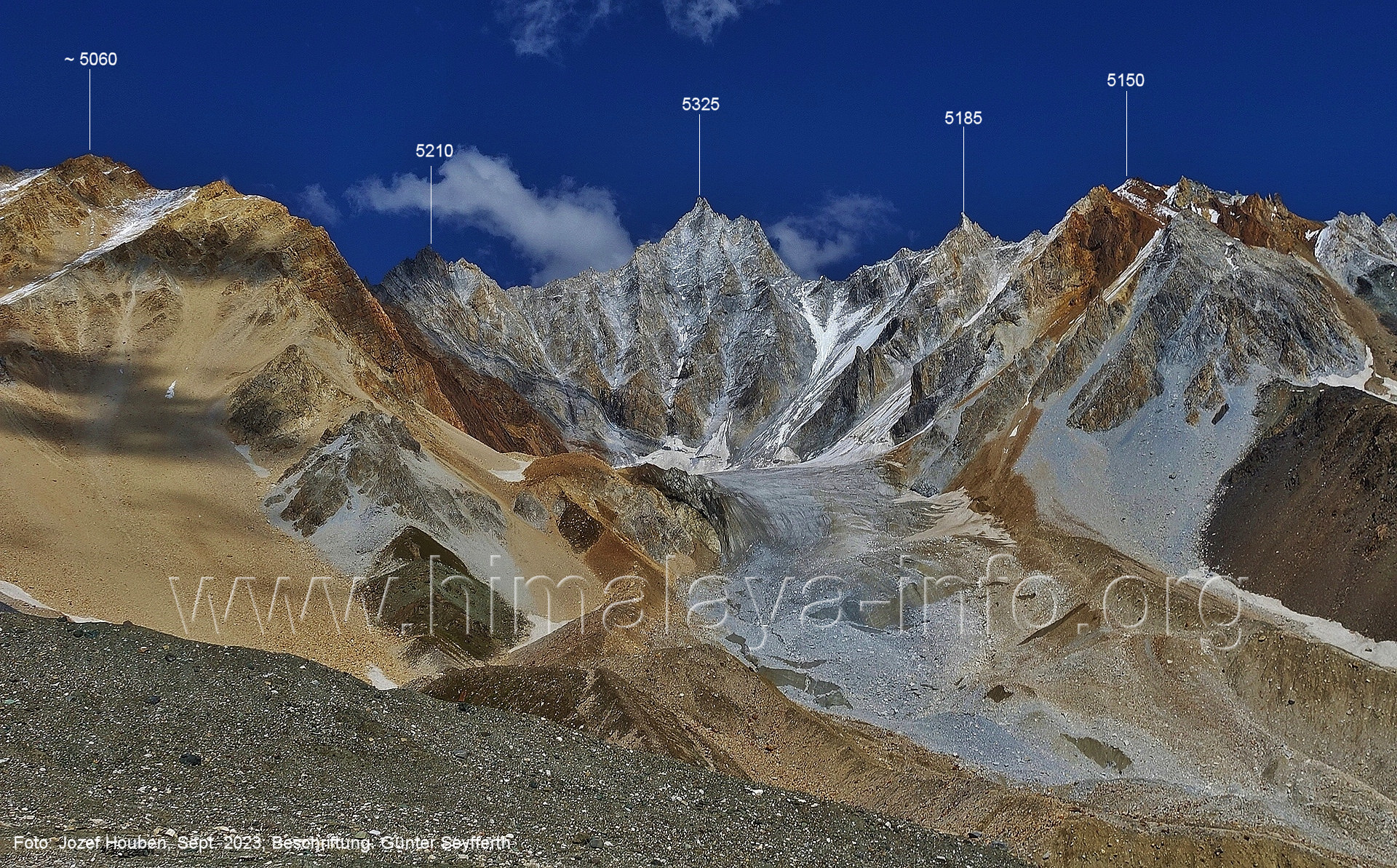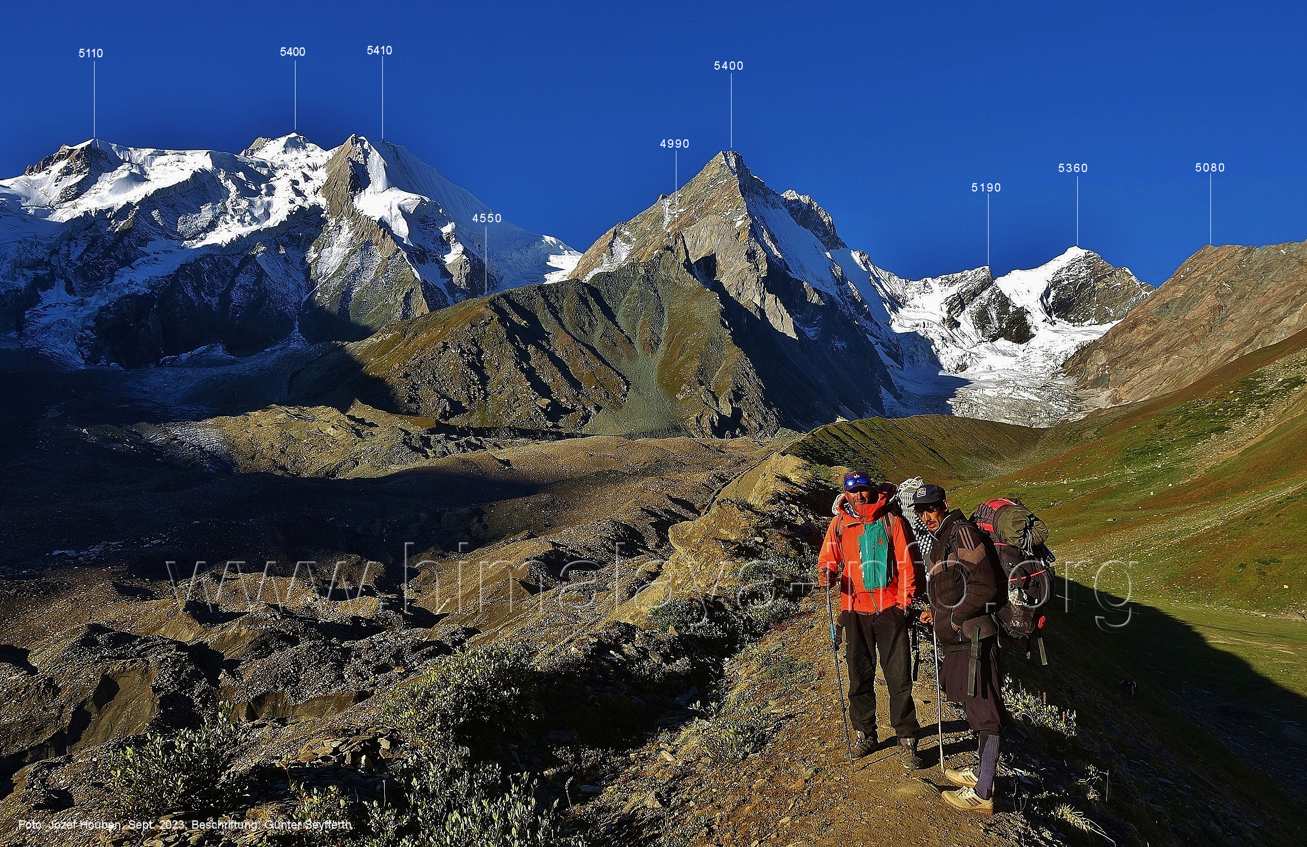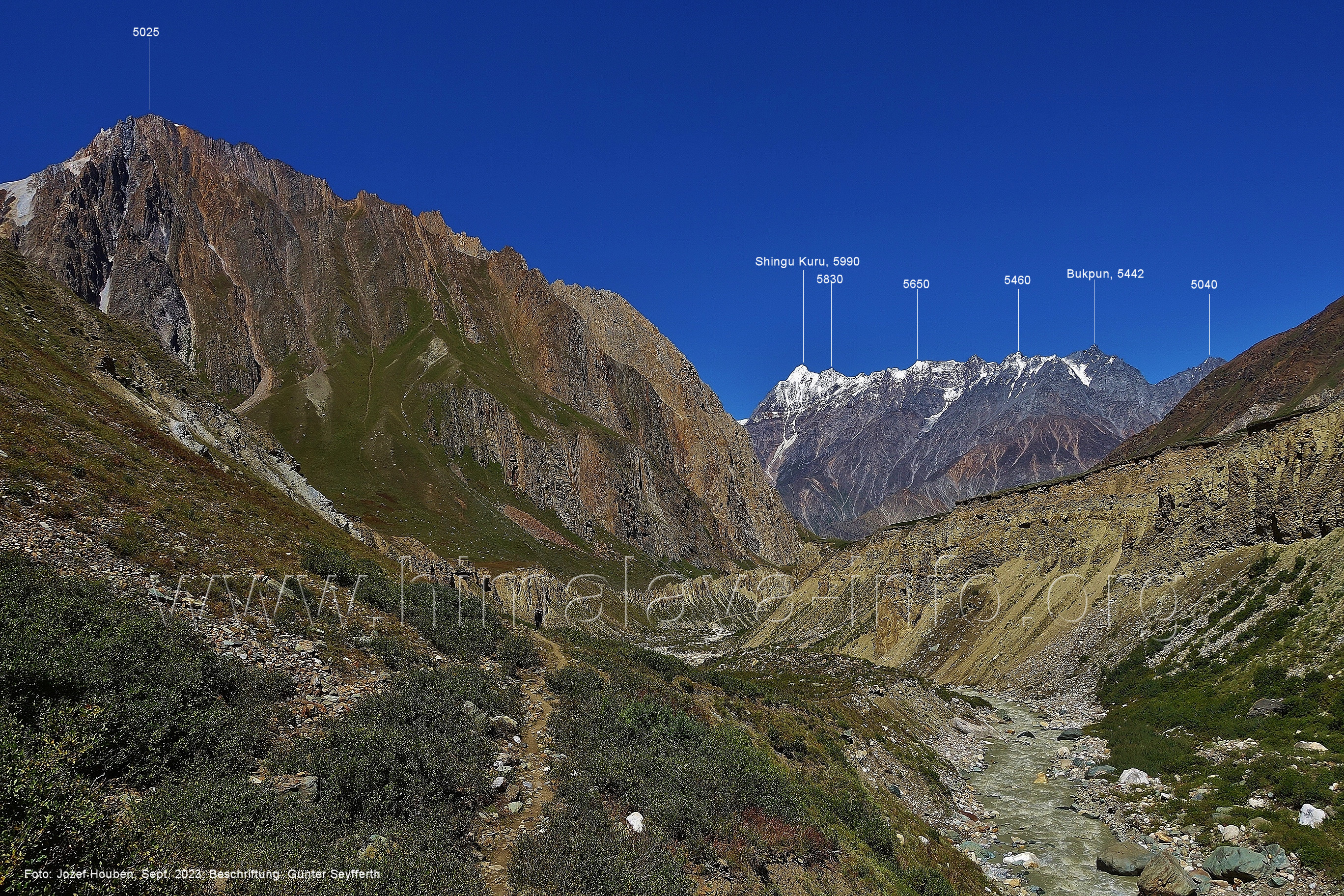 den Gipfeln über dem Trekking-Pfad sieht. Foto: Jozef Houben, Aug. 2023; Beschriftung: Günter Seyfferth (32) Blick bei 75°12'07" (Shing Kuru) nach Süd-Südwesten zum Kapaltang Kun (6237) und dem Marpoh-Gletscher