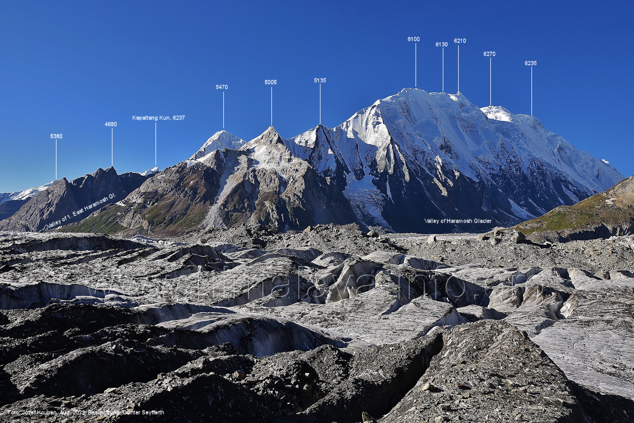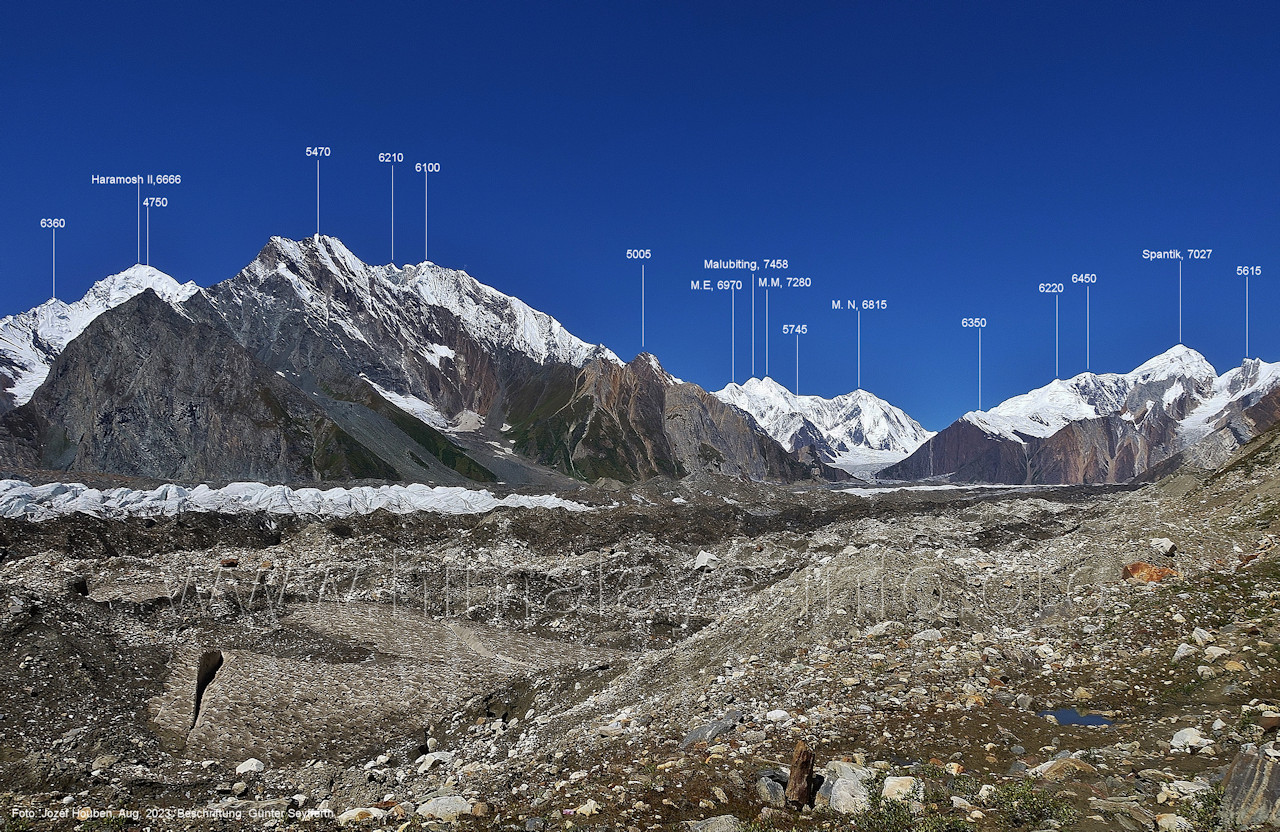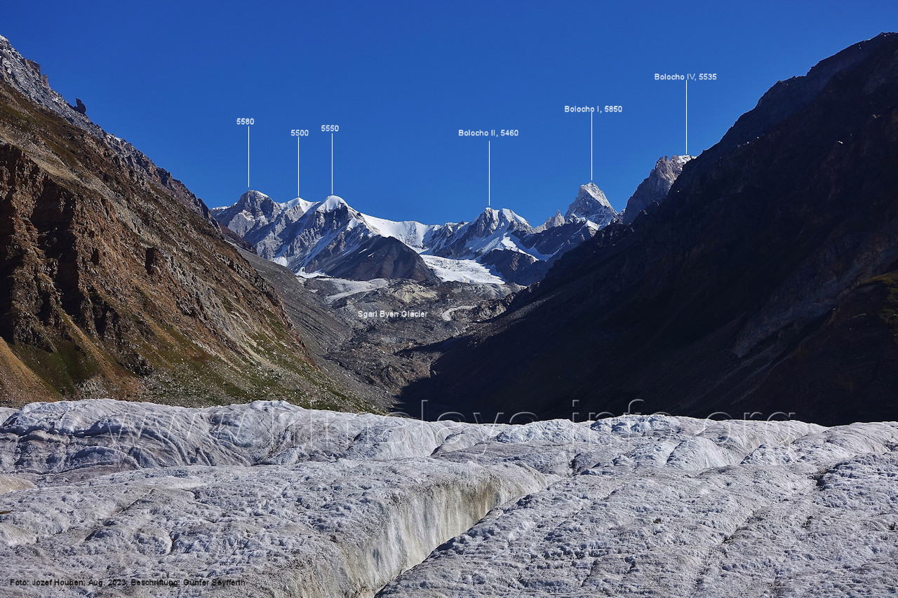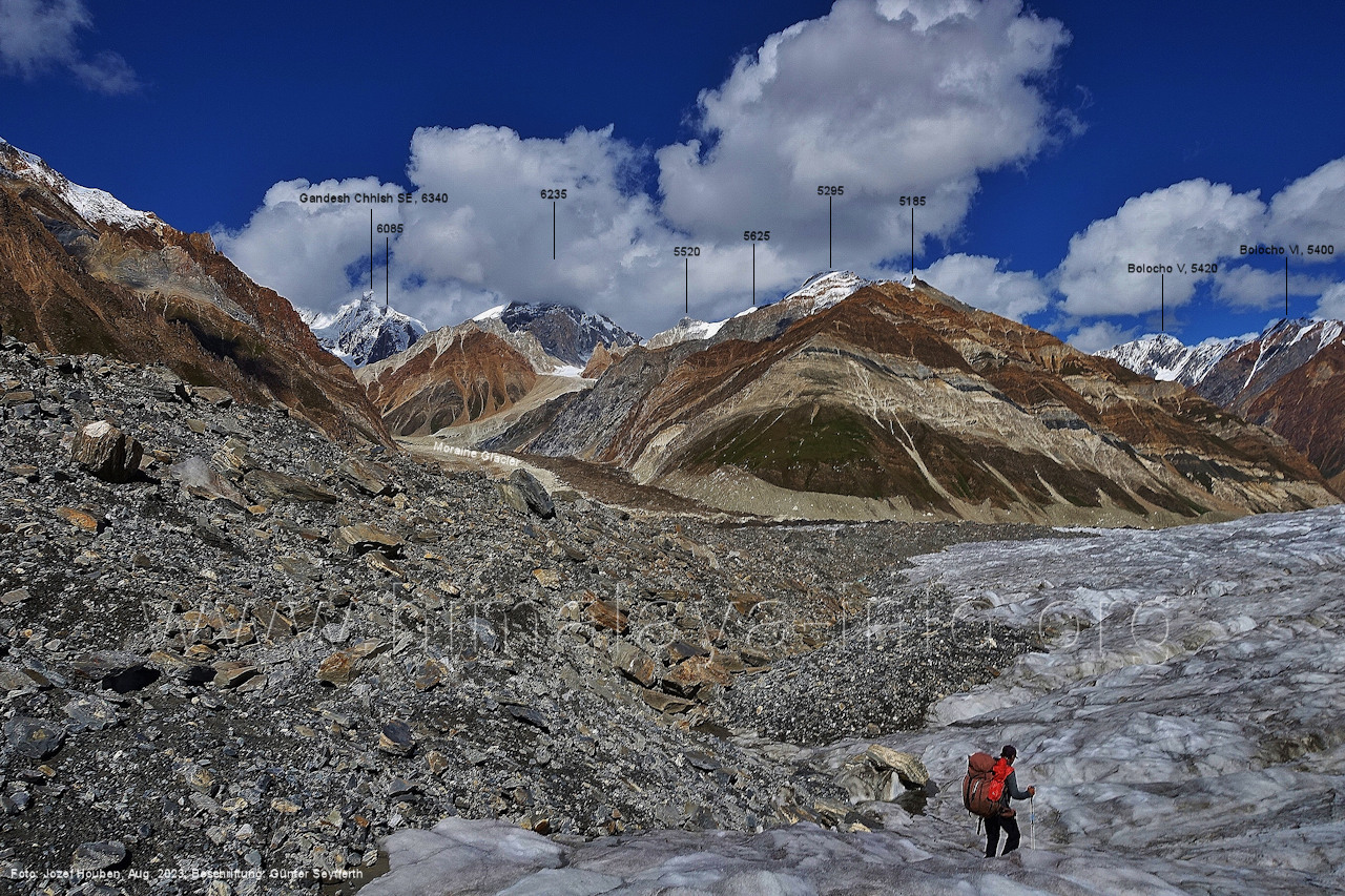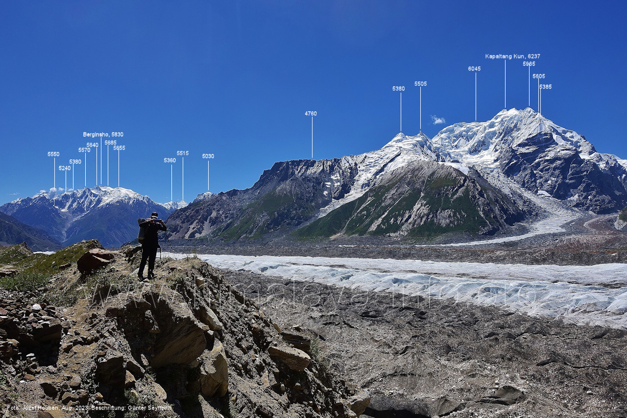 Gletscher herauf. Foto: Jozef Houben, Aug. 2023; Beschriftung: Günter Seyfferth (49) Blick bei 75°07'50" (H = 3820 m) talauswärts Foto: Jozef Houben, Aug. 2023; Beschriftung: Günter Seyfferth (50) Blick bei 75°07°35" nach Westen mit Haramosh II (6666 m), Malubiting (7458 m) und Spantik (7027 m) Noch kann man außerhalb des Gletschers gehen. Foto: Jozef Houben, Aug. 2023; Beschriftung: Günter Seyfferth (51) Blick bei 75°07'50" nach Süden zum Kapaltang Kun (6237 m) Foto: Jozef Houben, Aug. 2023; Beschriftung: Günter Seyfferth (52) Blick bei 75°07'40" nach Südosten mit Berginsho (5830 m) und Kapaltang Kun (6237 m) Foto: Jozef Houben, Aug. 2023; Beschriftung: Günter Seyfferth (53) Blick bei 75°07'35" nach Westen mit Haramosh II (6666 m), Malubiting (7458 m) und Spantik (7027 m) Foto: Jozef Houben, Aug. 2023; Beschriftung: Günter Seyfferth (54) Blick bei 75°07'20" nach West-Nordwesten zum Spantik (7027 m) Der Gipfel des Spantik ist immer noch 17,5 km entfernt. 10 km sind es bis zu den Gipfeln davor. Foto: Jozef Houben, Aug. 2023; Beschriftung: Günter Seyfferth (55) Blick bei 75°07'15" nach Nordosten ins Bolocho-Tal