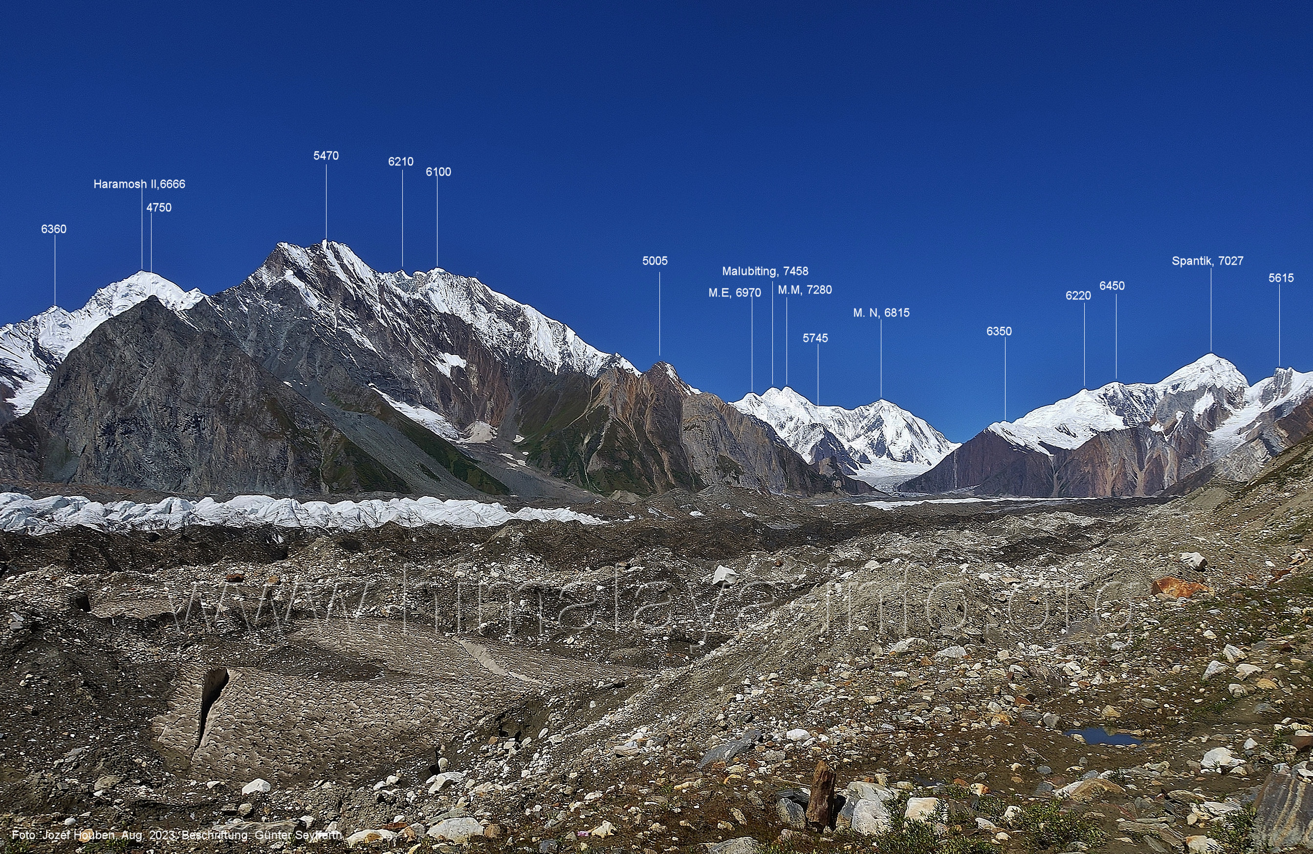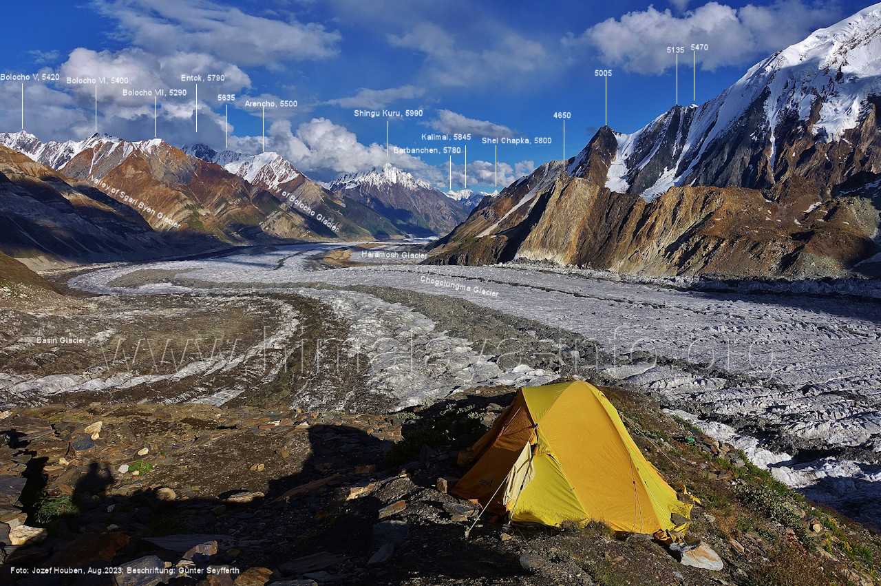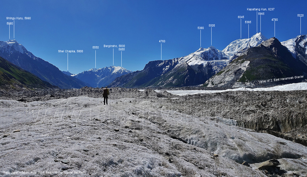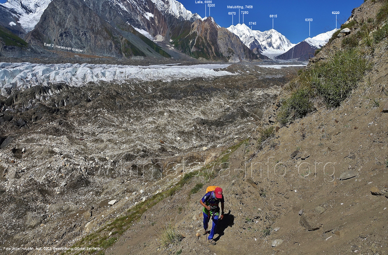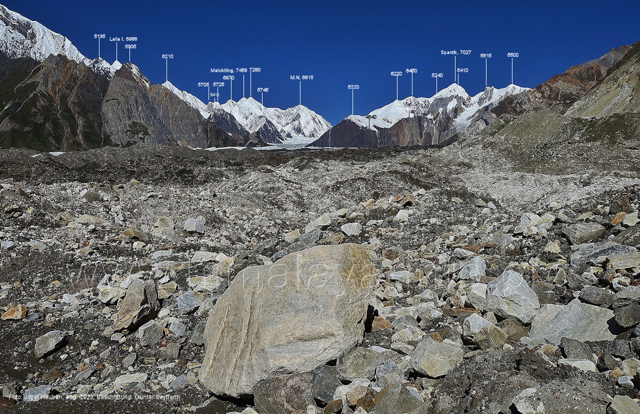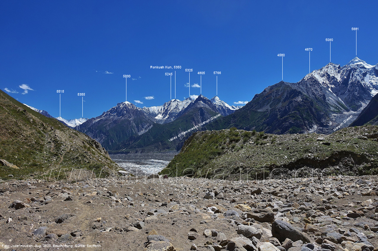Gletscher herauf. Foto: Jozef Houben, Aug. 2023; Beschriftung: Günter Seyfferth (49) Blick bei 75°07'50" (H = 3820 m) talauswärts Foto: Jozef Houben, Aug. 2023; Beschriftung: Günter Seyfferth (50) Blick bei 75°07°35" nach Westen mit Haramosh II (6666 m), Malubiting (7458 m) und Spantik (7027 m) Noch kann man außerhalb des Gletschers gehen. Foto: Jozef Houben, Aug. 2023; Beschriftung: Günter Seyfferth (51) Blick bei 75°07'50" nach Süden zum Kapaltang Kun (6237 m) Foto: Jozef Houben, Aug. 2023; Beschriftung: Günter Seyfferth (52) Blick bei 75°07'40" nach Südosten mit Berginsho (5830 m) und Kapaltang Kun (6237 m) Foto: Jozef Houben, Aug. 2023; Beschriftung: Günter Seyfferth (53) Blick bei 75°07'35" nach Westen mit Haramosh II (6666 m), Malubiting (7458 m) und Spantik (7027 m) Foto: Jozef Houben, Aug. 2023; Beschriftung: Günter Seyfferth (54) Blick bei 75°07'20" nach West-Nordwesten zum Spantik (7027 m) Der Gipfel des Spantik ist immer noch 17,5 km entfernt. 10 km sind es bis zu den Gipfeln davor. Foto: Jozef Houben, Aug. 2023; Beschriftung: Günter Seyfferth (55) Blick bei 75°07'15" nach Nordosten ins Bolocho-Tal