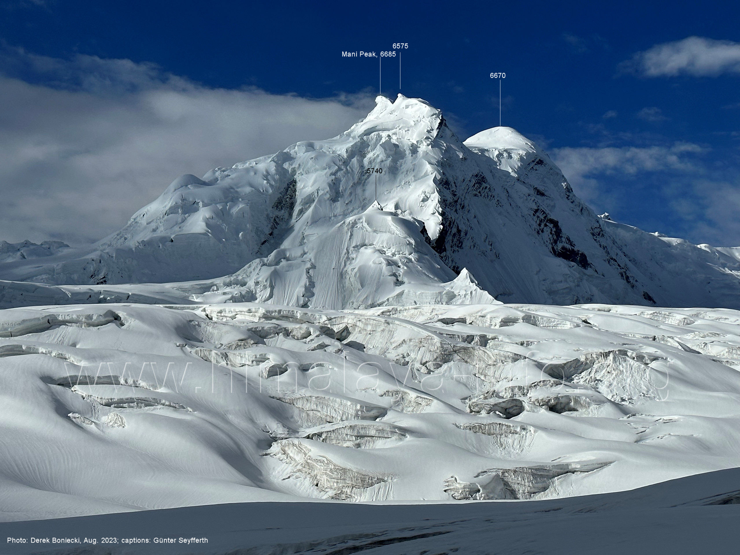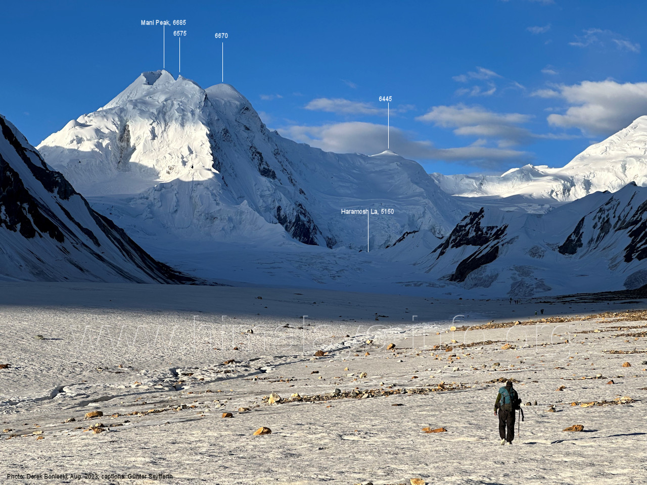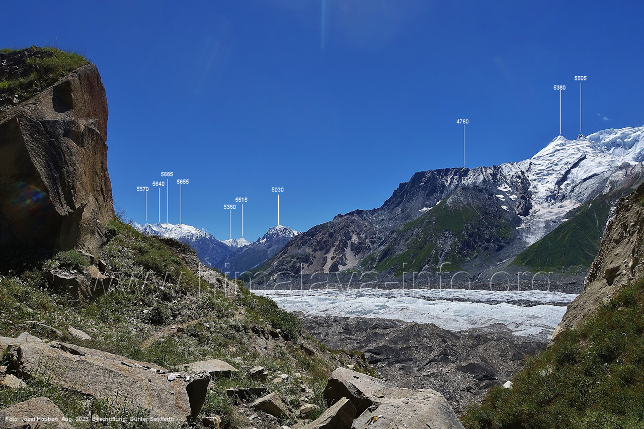 (60) Blick bei 75°06'50" in ca. 3850 m Höhe nach West-Nordwesten Foto: Jozef Houben, Aug. 2023; Beschriftung: Günter Seyfferth (61) Blick bei 75°06'30" zum Malubiting (7458 m) und Spantik (7027 m)