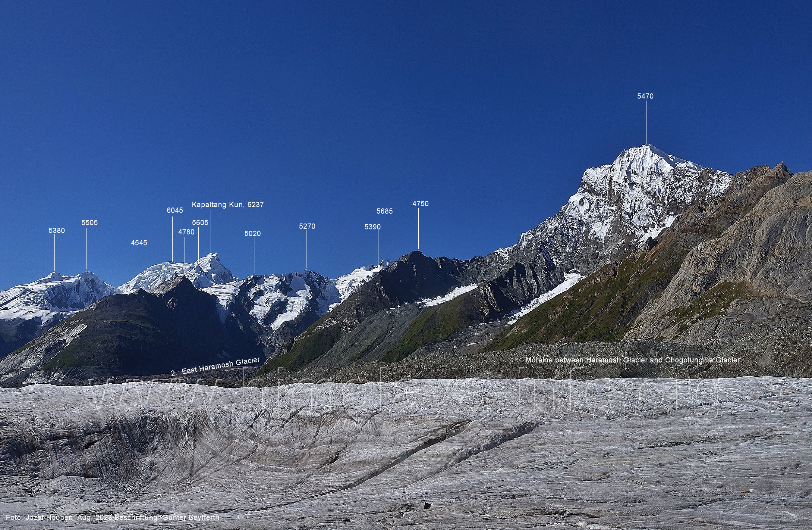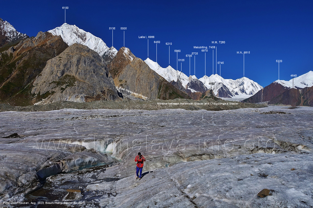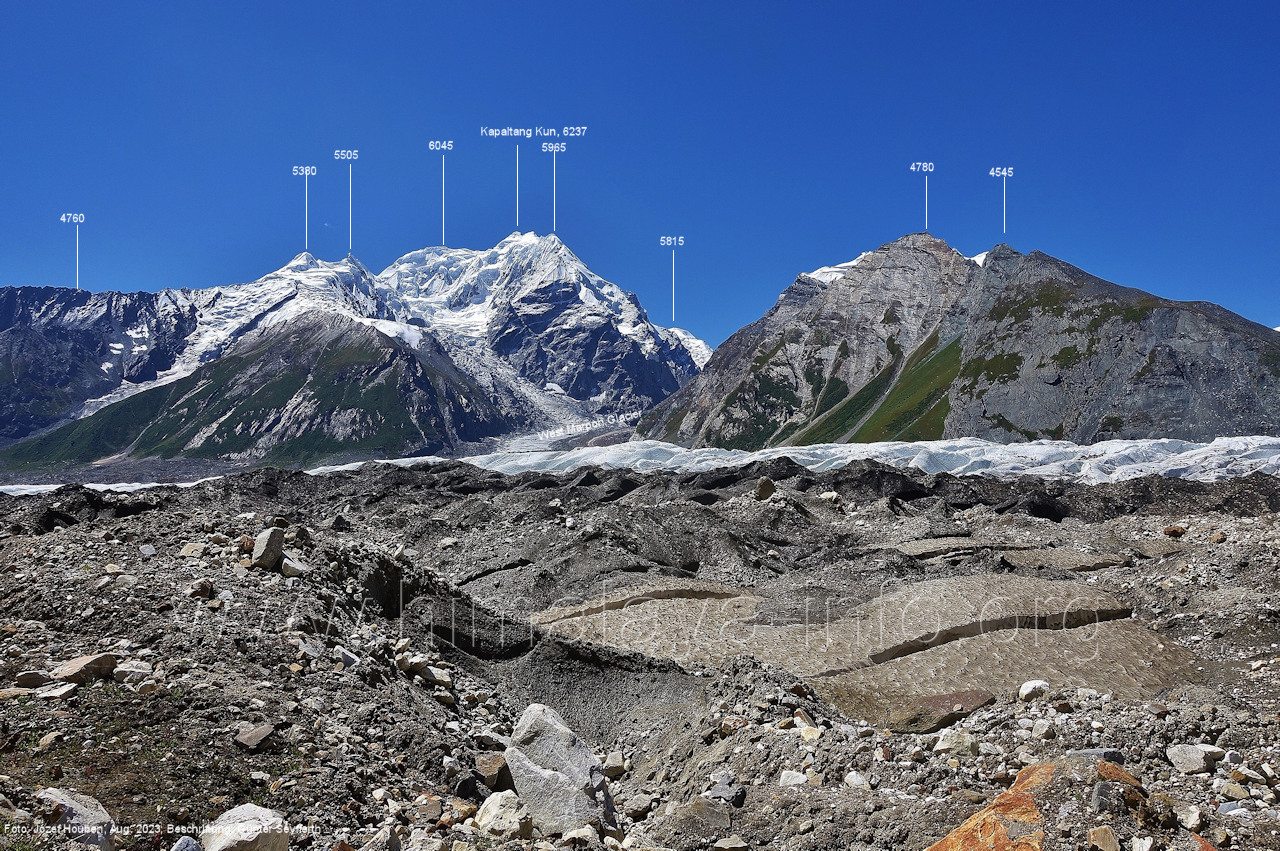 Mittelmoräne zwischen dem Eis des Chogolungma-Gletschers (vorne) Foto: Jozef Houben, Aug. 2023; Beschriftung: Günter Seyfferth (72) Blick bei 75°05'20" nach Westen zum Malubiting (7458 m)