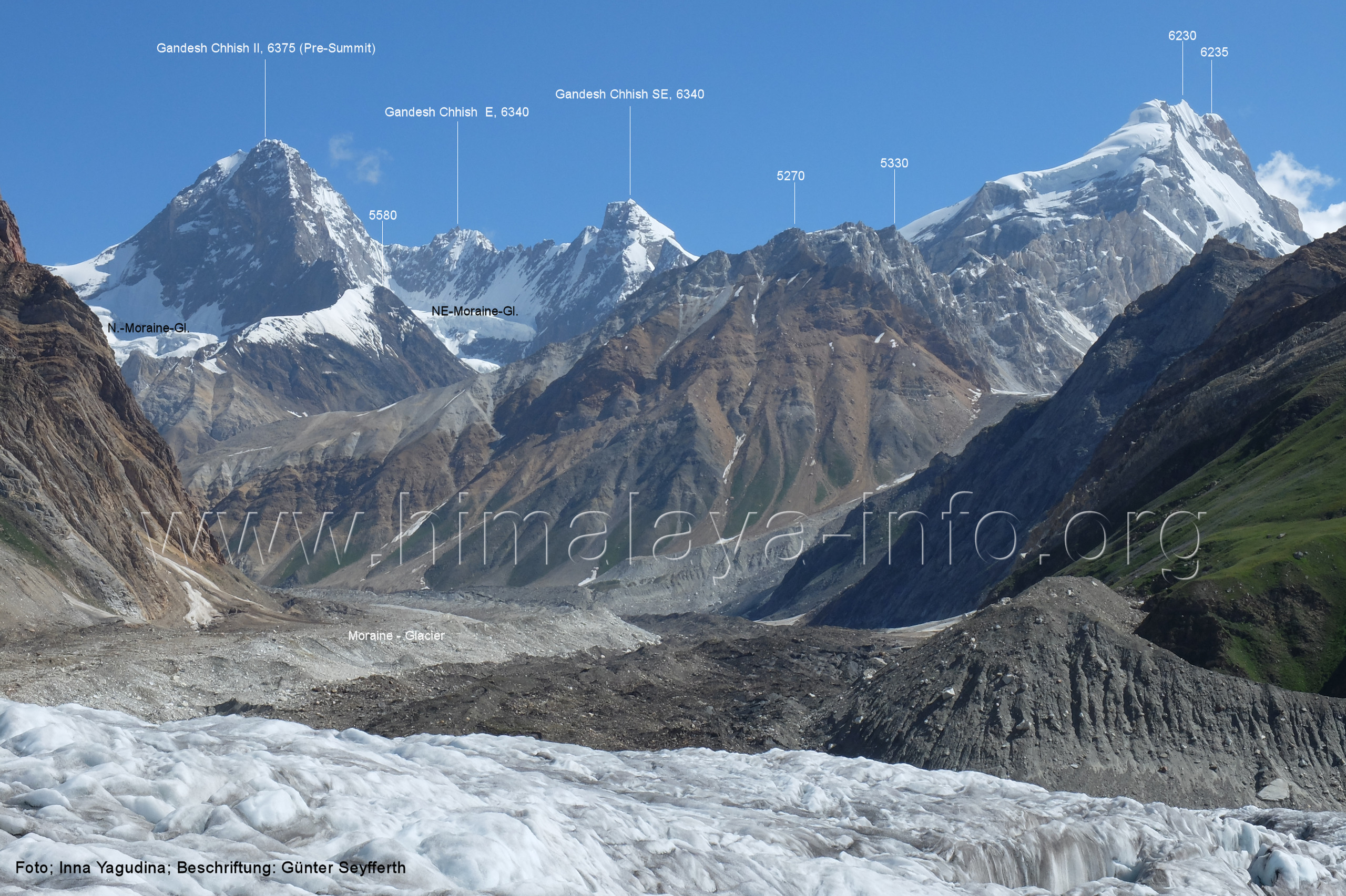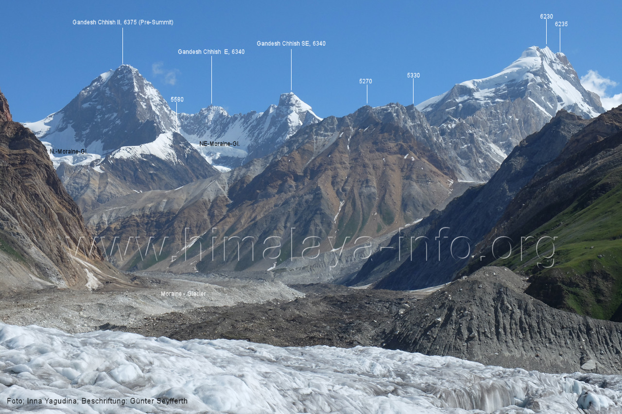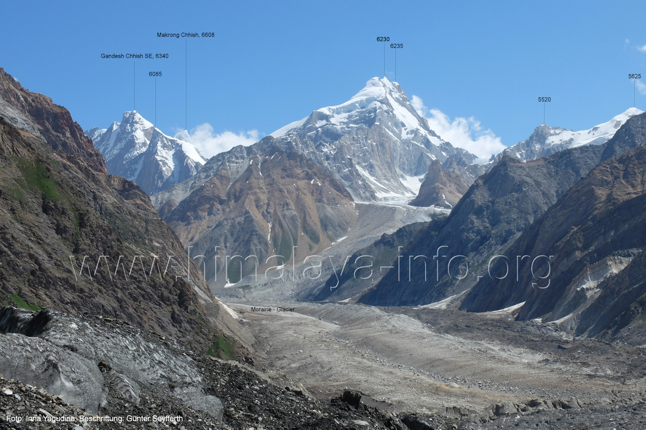 Mittelmoräne zwischen dem Eis des Chogolungma-Gletschers (vorne) Foto: Jozef Houben, Aug. 2023; Beschriftung: Günter Seyfferth (72) Blick bei 75°05'20" nach Westen zum Malubiting (7458 m)