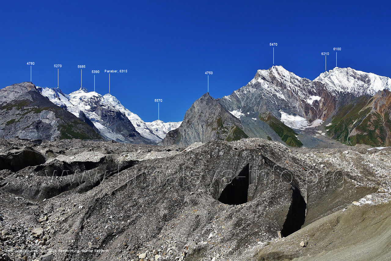 Kapaltang Kun (6237 m), Paraber (6315 m) und Mani Peak (6685 m) Links sieht man erneut die Gipfel, die auch die Bilder Nr. 280 und 281 auf der linken Seite zeigen. Foto: Bernhard Krainer, Juli 2007; Beschriftung: Günter Seyfferth