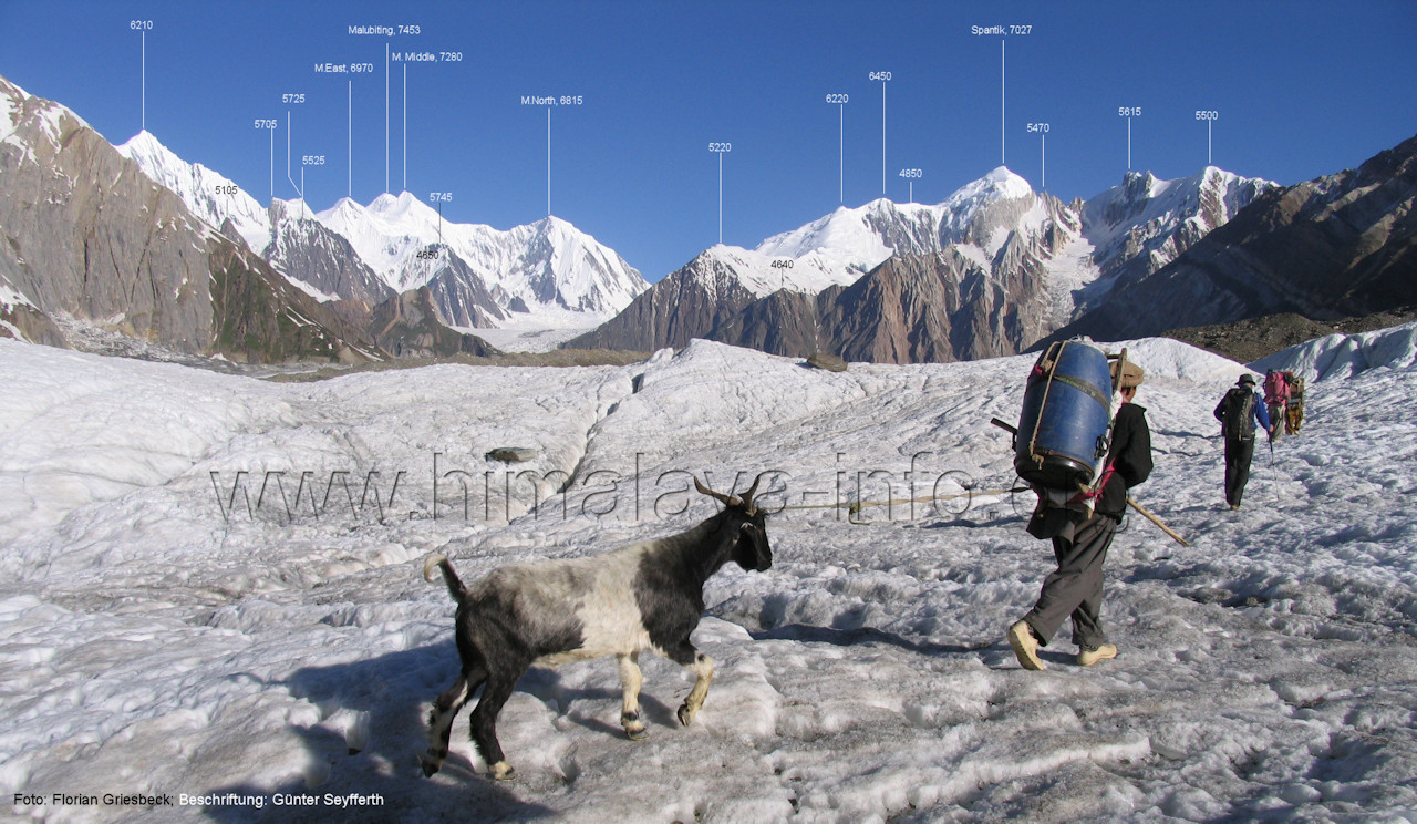 mündet der Haramosh-Gletscher. Foto: Florian Griesbeck; Beschriftung: Günter Seyfferth (69) Blick bei 75°05'45" in ca. 3925 m Höhe zum Spantik (7027 m)