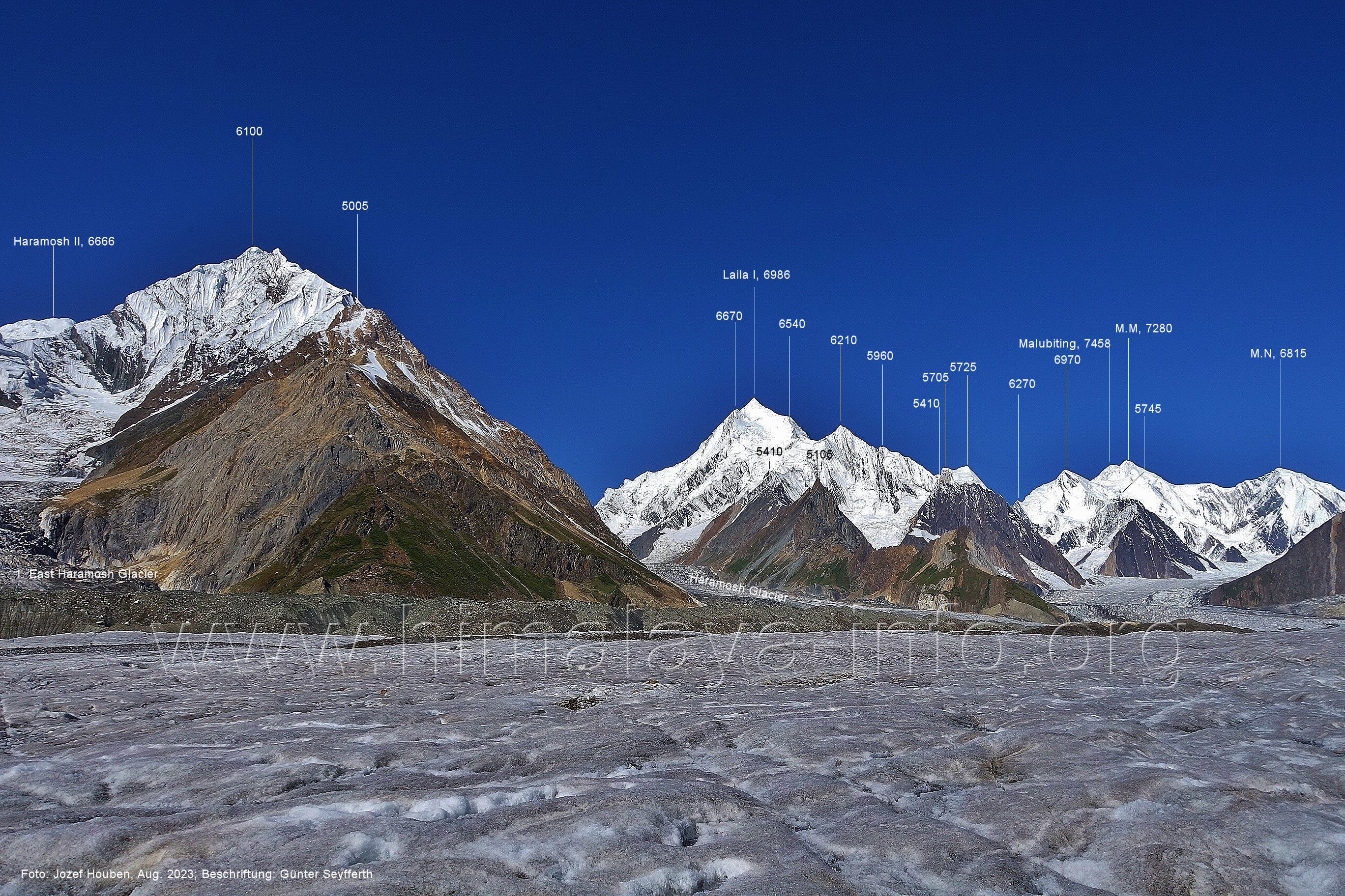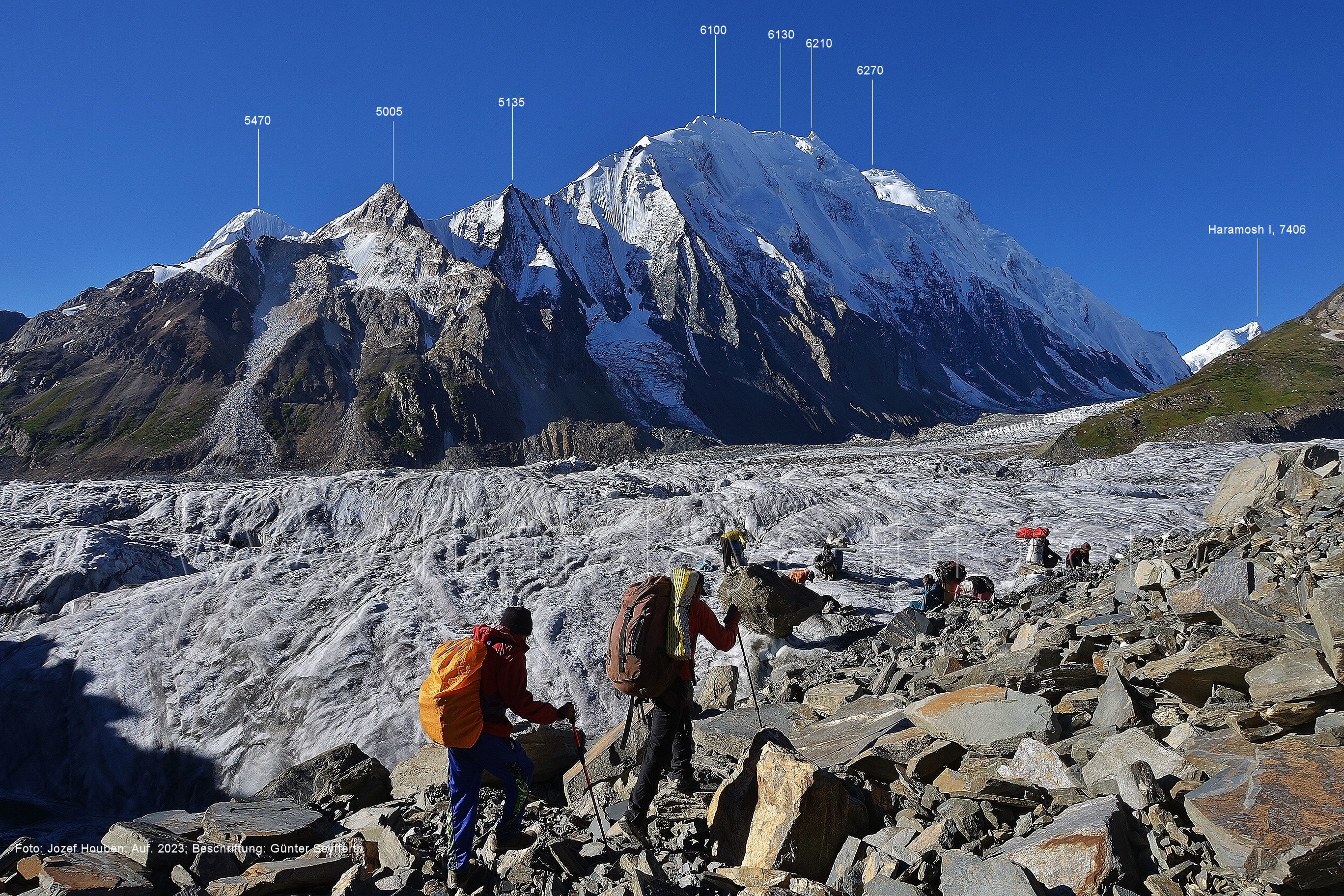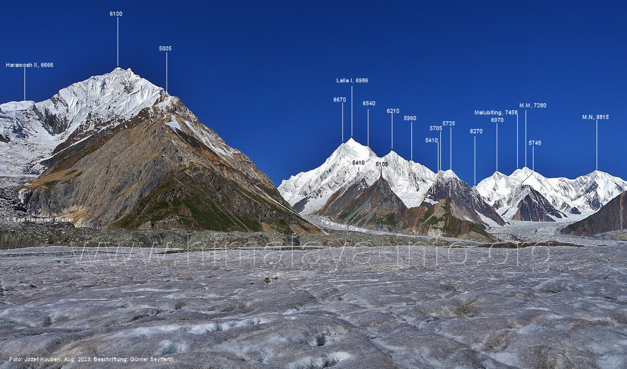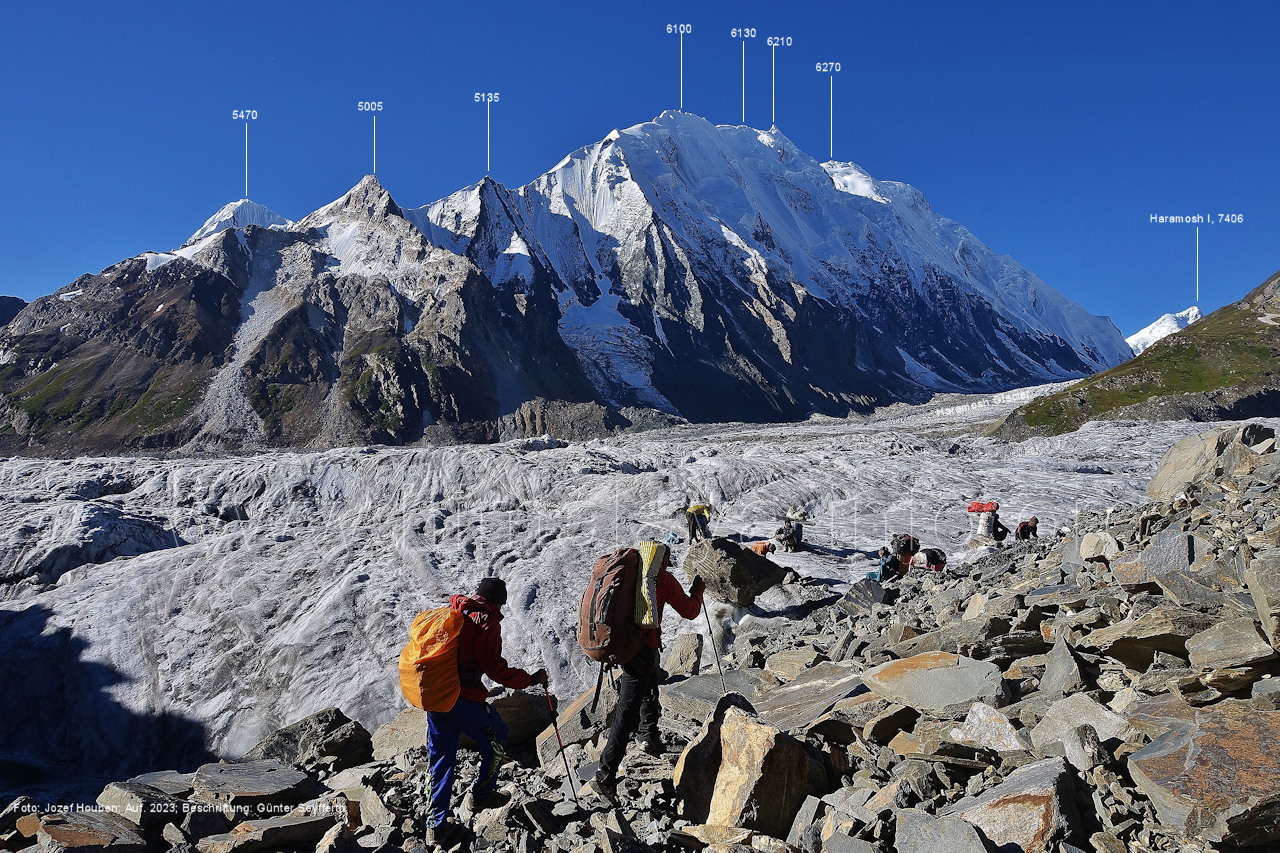 befindet sich der Haramosh La (5150 m). Foto: Jozef Houben, Aug. 2023; Beschriftung: Günter Seyfferth (82) Blick bei 75°03'20" nach Südwesten entlang des Haramosh-Gletschers mit Haramosh I (7406 m) und Laila I (6986 m) Foto: Jozef Houben, Aug. 2023; Beschriftung: Günter Seyfferth (83) Blick bei 75°03'10" nach Südwesten mit Haramosh I (7406 m) und Laila I (6986 m) Der Haramosh La liegt im Bereich des tiefsten Punktes des Grats, der vom Peak 5540 nach links abfällt. Foto: Jozef Houben, Aug. 2023; Beschriftung: Günter Seyfferth (84) Tele-Blick bei 75°03'05" nach Südwesten zum Haramosh I (7406 m) Foto: Jozef Houben, Aug. 2023; Beschriftung: Günter Seyfferth (84a) Blick bei 75°02'50" in der Mitte des Gletschers in ca. 4100 m Höhe nach Südwesten zur Laila I (6986 m) Beim Aufstieg ging die Gruppe von Jozef Houben in der