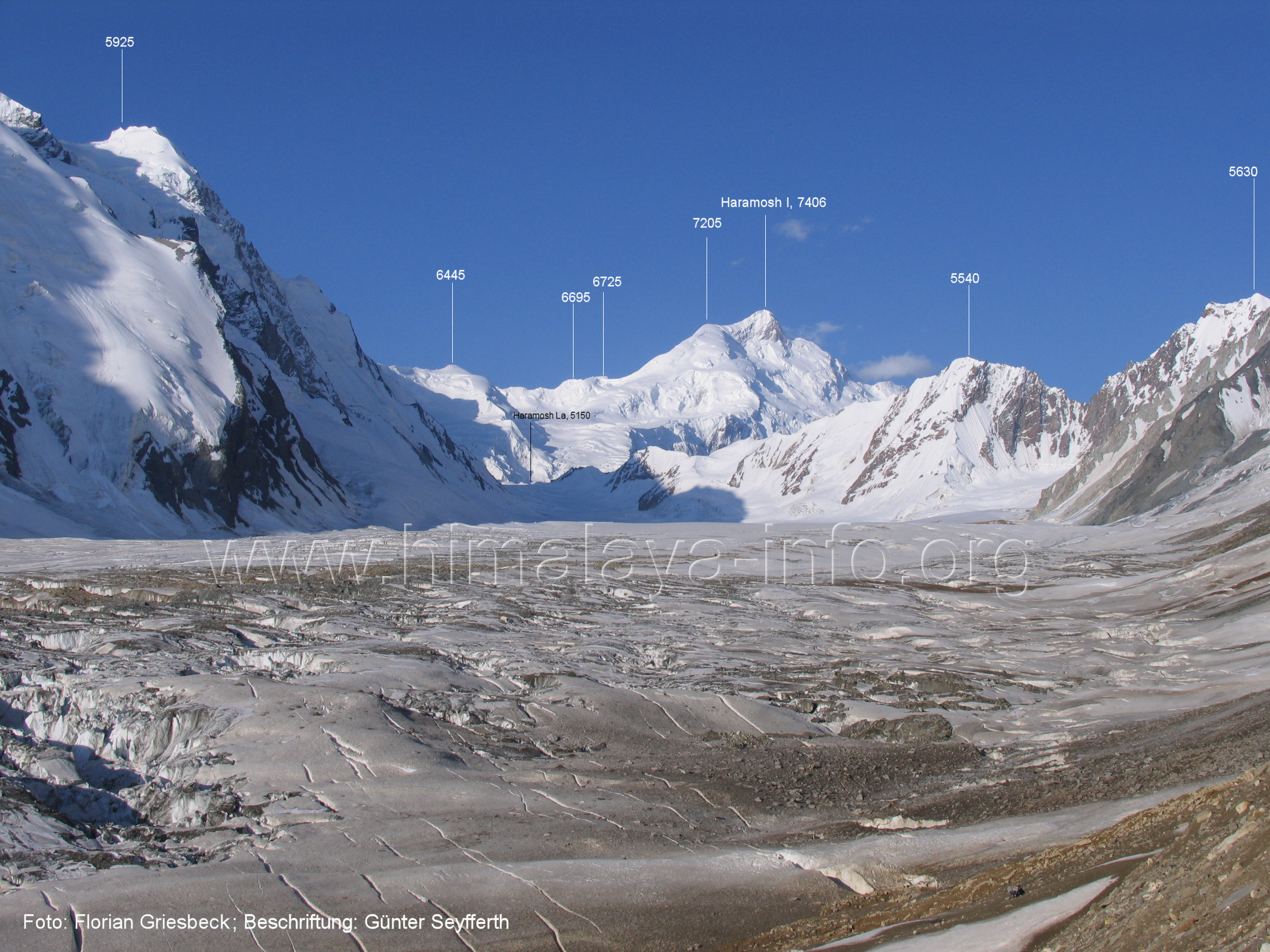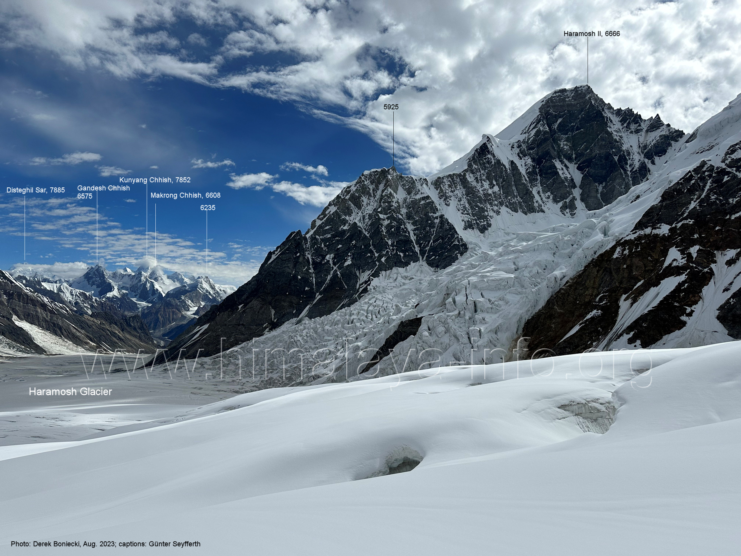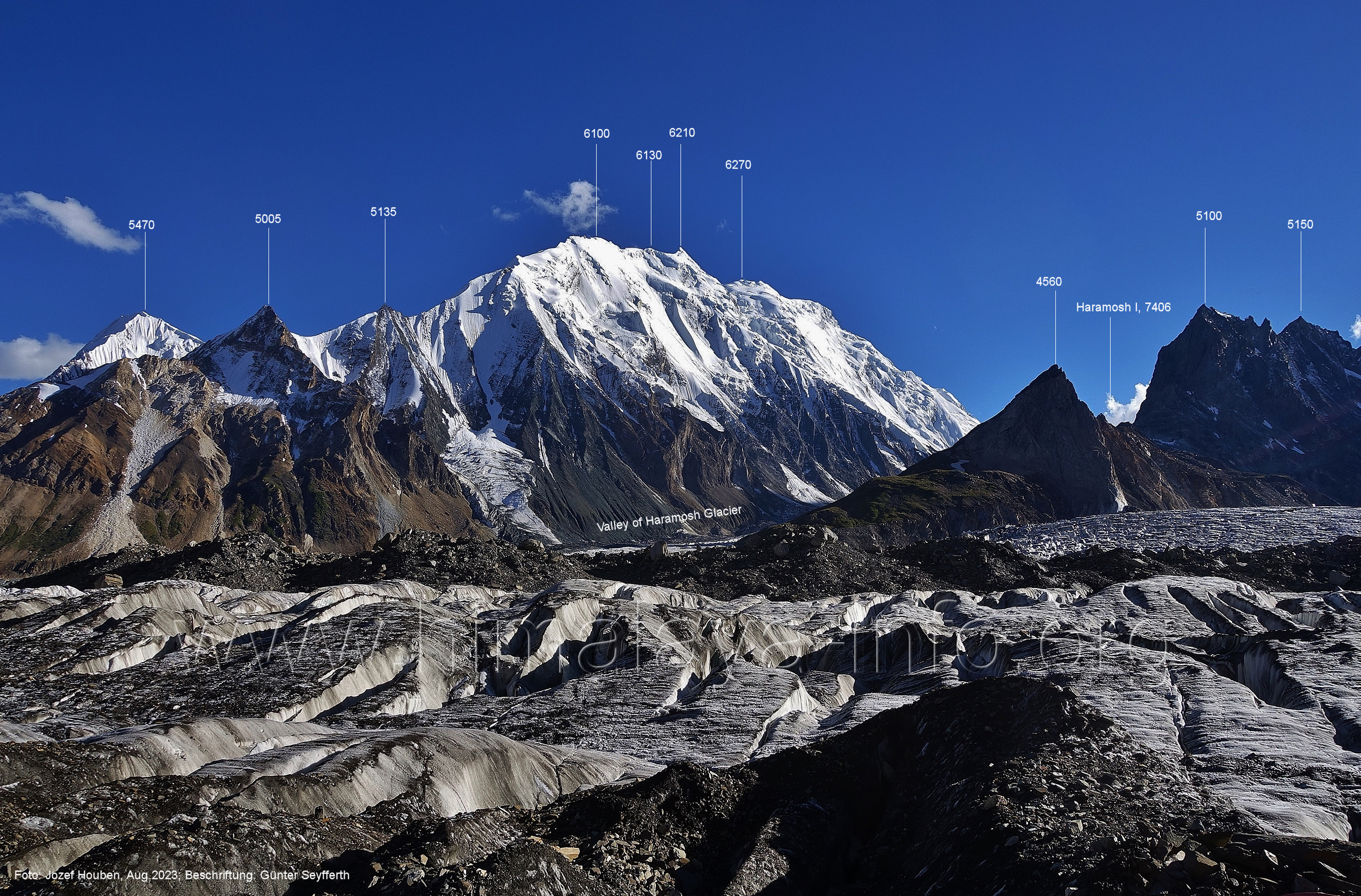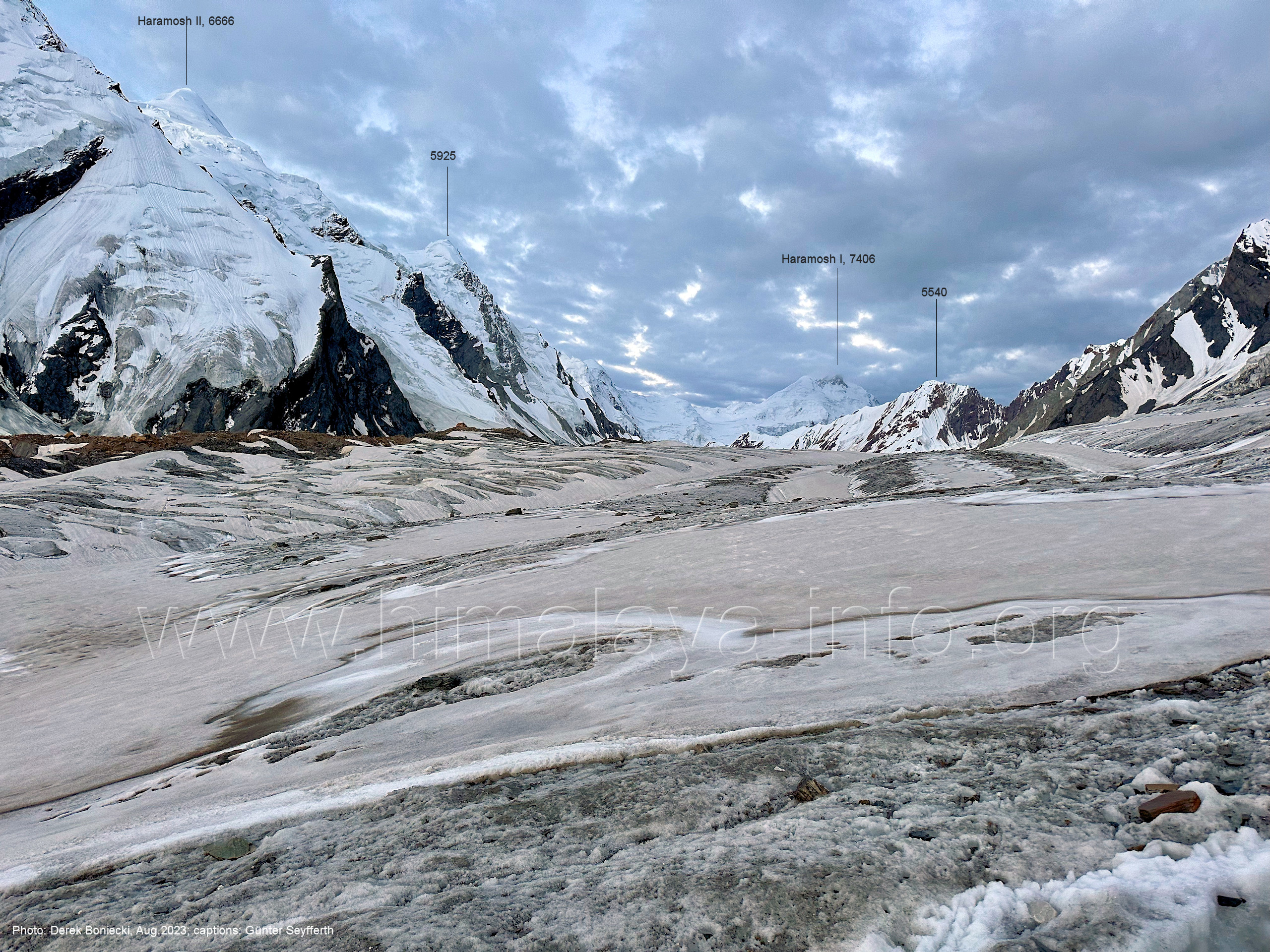 befindet sich der Haramosh La (5150 m). Foto: Jozef Houben, Aug. 2023; Beschriftung: Günter Seyfferth (82) Blick bei 75°03'20" nach Südwesten entlang des Haramosh-Gletschers mit Haramosh I (7406 m) und Laila I (6986 m) Foto: Jozef Houben, Aug. 2023; Beschriftung: Günter Seyfferth (83) Blick bei 75°03'10" nach Südwesten mit Haramosh I (7406 m) und Laila I (6986 m) Der Haramosh La liegt im Bereich des tiefsten Punktes des Grats, der vom Peak 5540 nach links abfällt. Foto: Jozef Houben, Aug. 2023; Beschriftung: Günter Seyfferth (84) Tele-Blick bei 75°03'05" nach Südwesten zum Haramosh I (7406 m) Foto: Jozef Houben, Aug. 2023; Beschriftung: Günter Seyfferth (84a) Blick bei 75°02'50" in der Mitte des Gletschers in ca. 4100 m Höhe nach Südwesten zur Laila I (6986 m) Beim Aufstieg ging die Gruppe von Jozef Houben in der