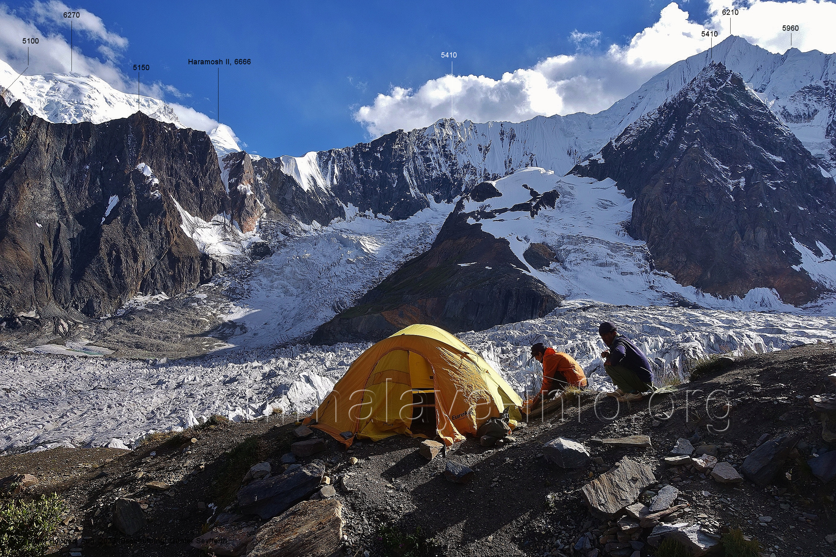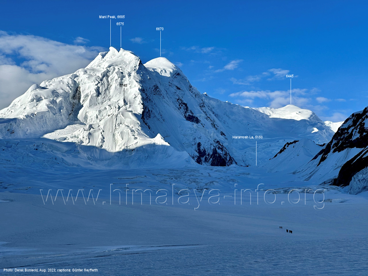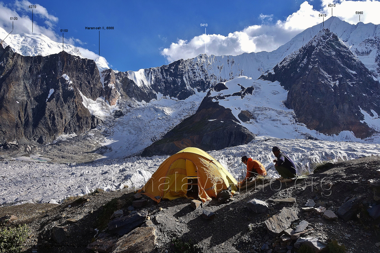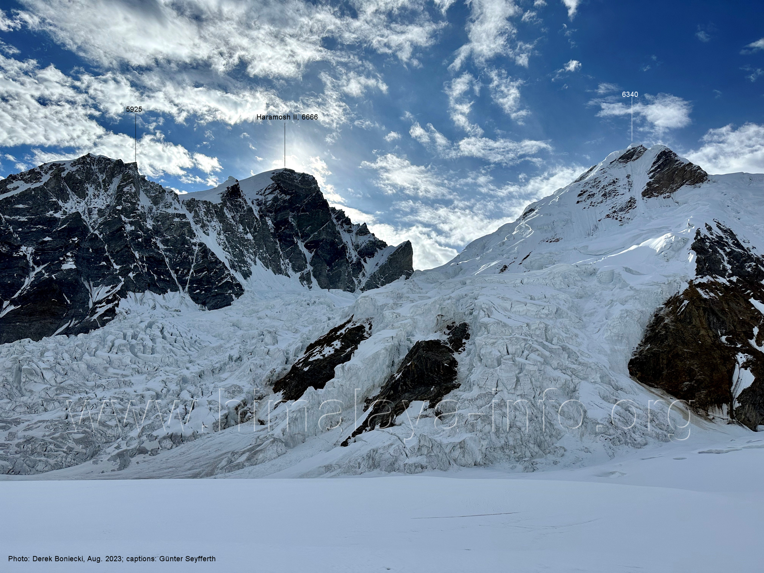 befindet sich der Haramosh La (5150 m). Foto: Jozef Houben, Aug. 2023; Beschriftung: Günter Seyfferth (82) Blick bei 75°03'20" nach Südwesten entlang des Haramosh-Gletschers mit Haramosh I (7406 m) und Laila I (6986 m) Foto: Jozef Houben, Aug. 2023; Beschriftung: Günter Seyfferth (83) Blick bei 75°03'10" nach Südwesten mit Haramosh I (7406 m) und Laila I (6986 m) Der Haramosh La liegt im Bereich des tiefsten Punktes des Grats, der vom Peak 5540 nach links abfällt. Foto: Jozef Houben, Aug. 2023; Beschriftung: Günter Seyfferth (84) Tele-Blick bei 75°03'05" nach Südwesten zum Haramosh I (7406 m) Foto: Jozef Houben, Aug. 2023; Beschriftung: Günter Seyfferth (84a) Blick bei 75°02'50" in der Mitte des Gletschers in ca. 4100 m Höhe nach Südwesten zur Laila I (6986 m) Beim Aufstieg ging die Gruppe von Jozef Houben in der
