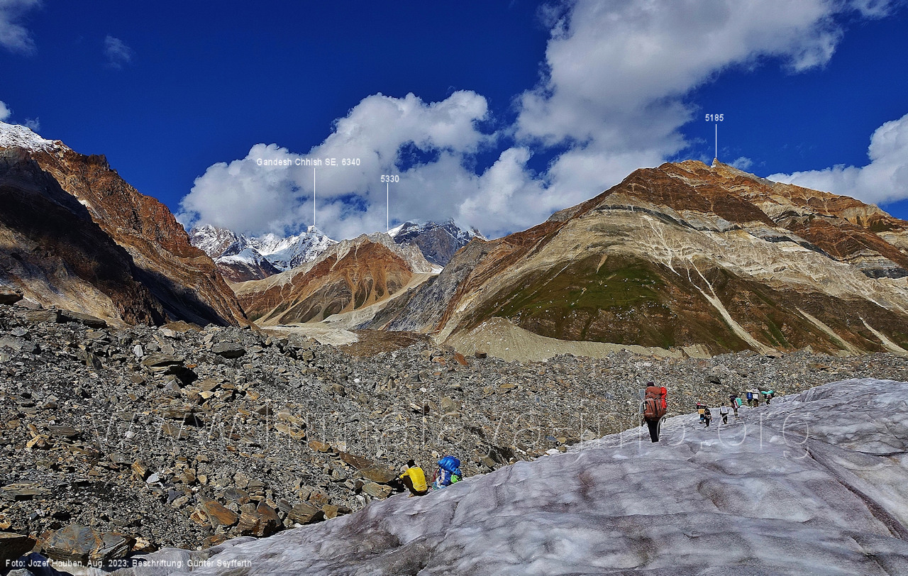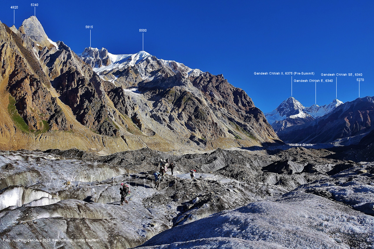 Moraine-Gletscher, Bilder vom Aufstieg am Spantik und von dessen Gipfel finden Sie hier. Foto: Jozef Houben, Aug. 2023; Beschriftung: Günter Seyfferth (25) Blick bei 75°13'20" nach Süden zu den Bergen westlich des Naamur Nala Bild Nr. 19 hat die Sicht gegen den Fuß dieser Berge gezeigt.