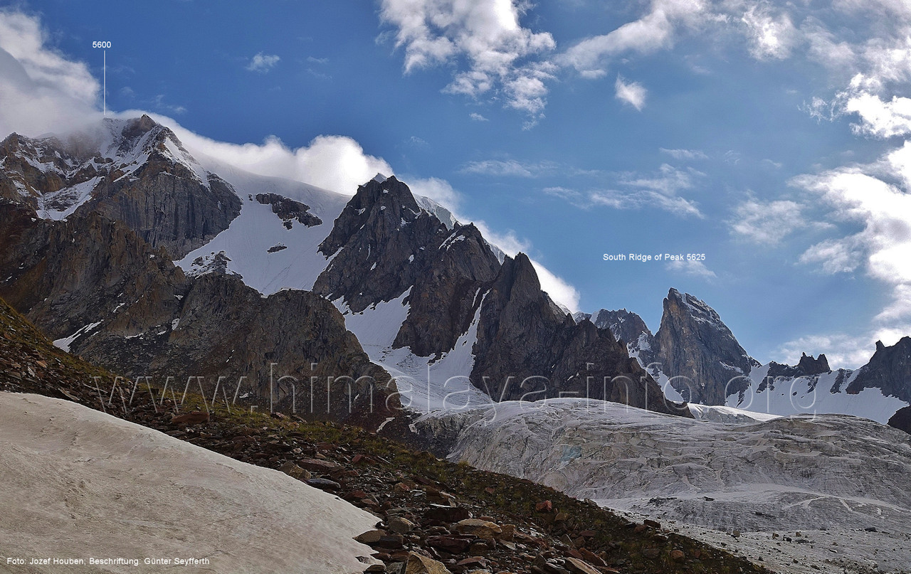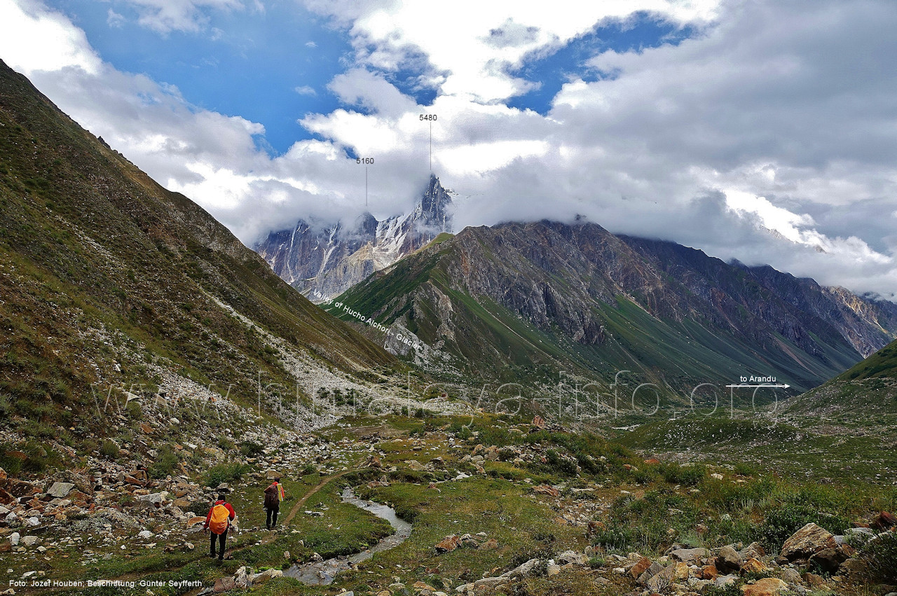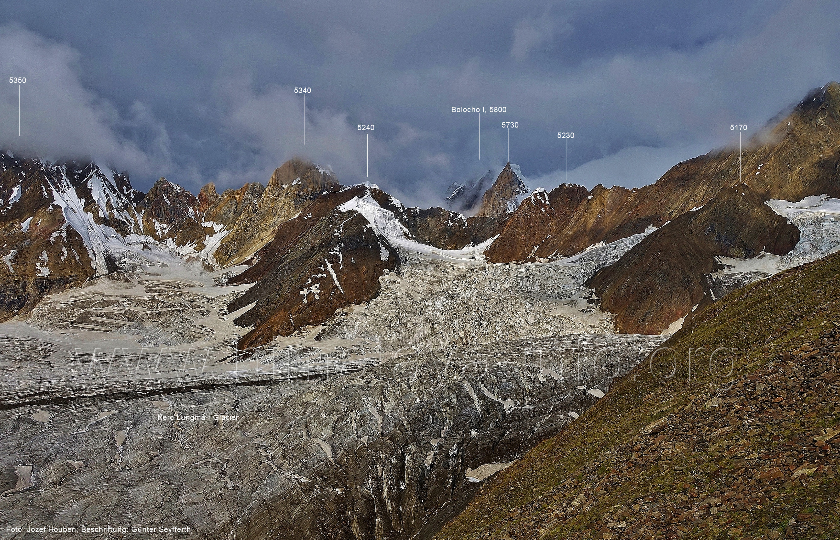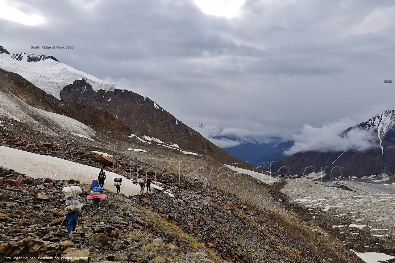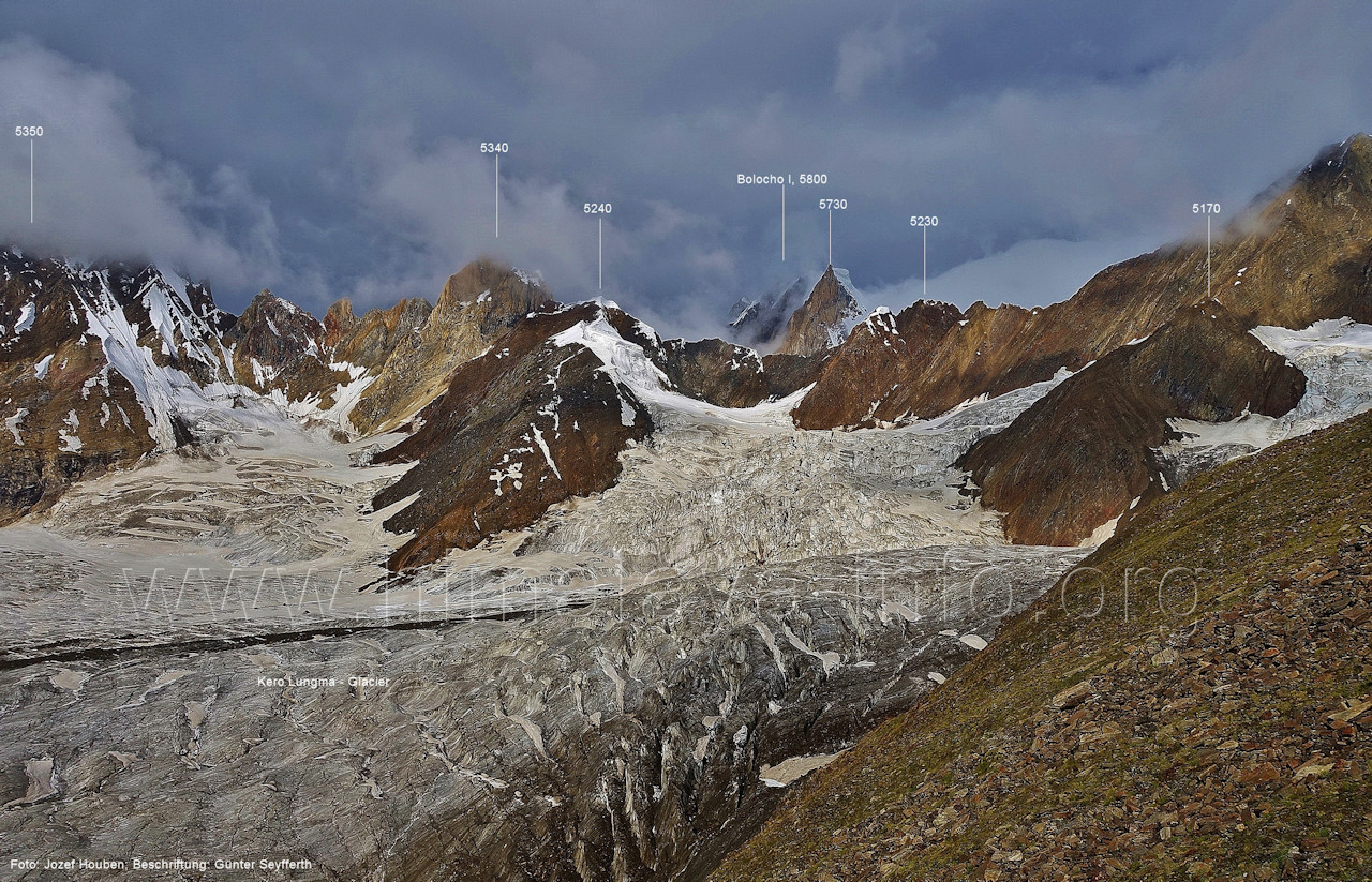 geht in den oberen Bereich des Getschers, Foto: Collin Wells, flickr.com; Beschriftung: Günter Seyfferth Es folgen weitere Fotos von Jozef Houben. Kurz vor der Mündung des Tals des Hucho Alchori-Gletschers stiegen die Wolken auf und machten die folgenden 3 Bilder möglich: (218) Blick aus ca. 3650 m Höhe im Kero Lungma-Tal nach Süden zum Shingu Kuru (5990 m)