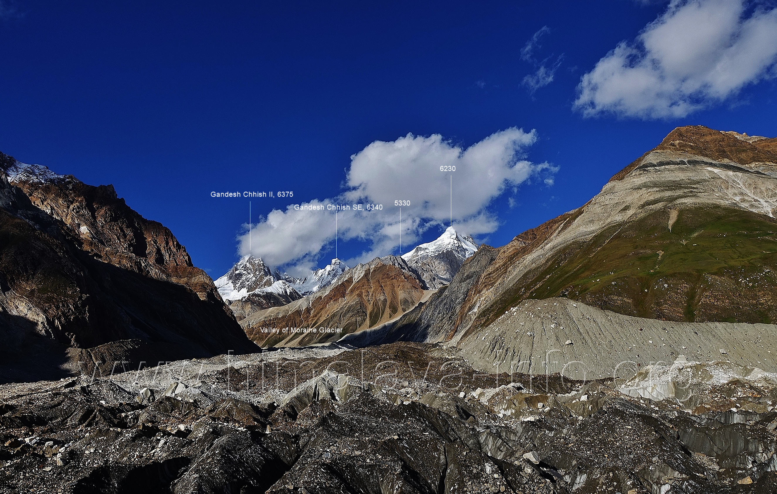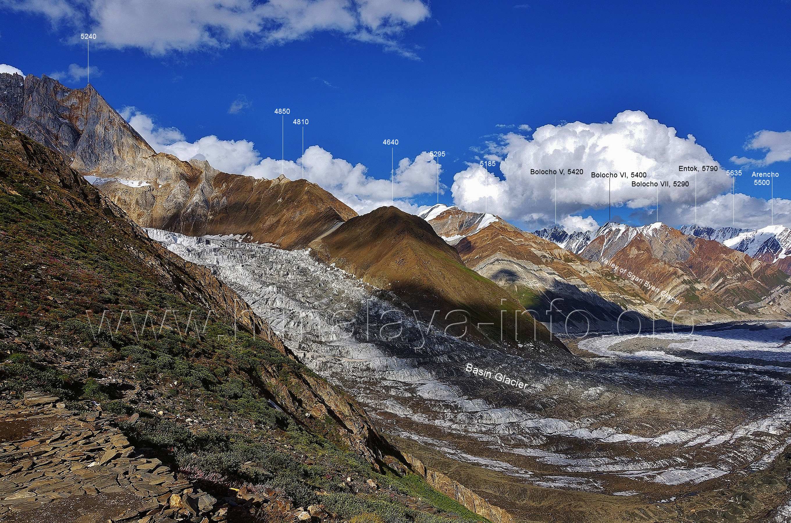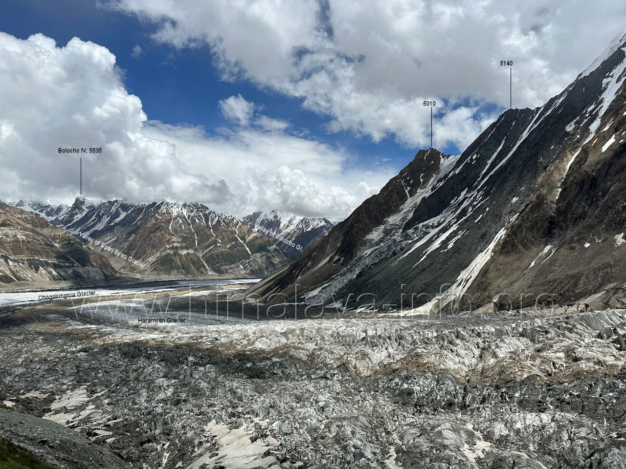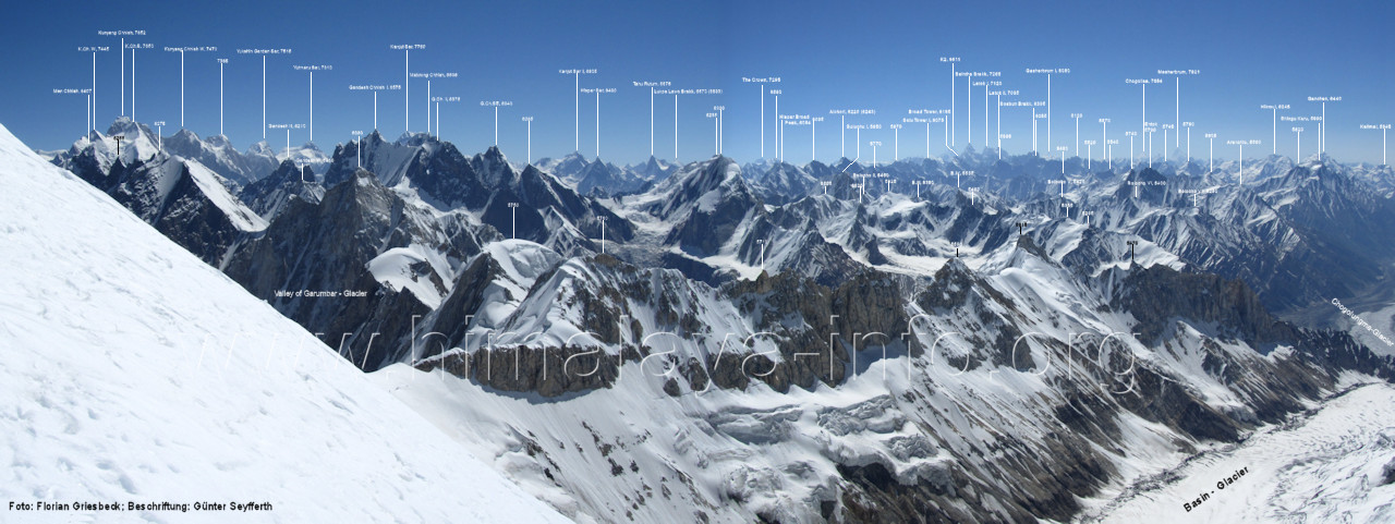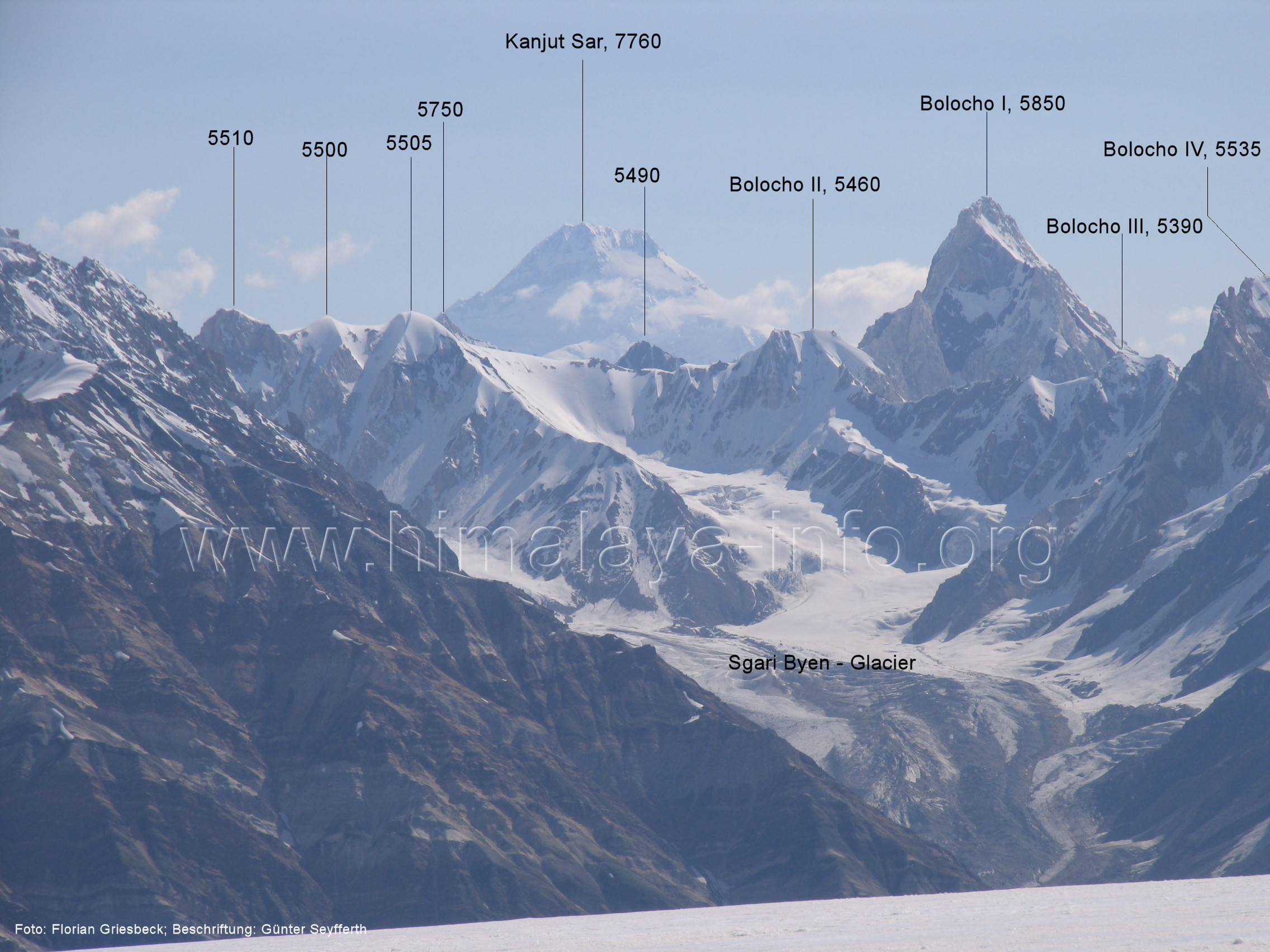 geht in den oberen Bereich des Getschers, Foto: Collin Wells, flickr.com; Beschriftung: Günter Seyfferth Es folgen weitere Fotos von Jozef Houben. Kurz vor der Mündung des Tals des Hucho Alchori-Gletschers stiegen die Wolken auf und machten die folgenden 3 Bilder möglich: (218) Blick aus ca. 3650 m Höhe im Kero Lungma-Tal nach Süden zum Shingu Kuru (5990 m)