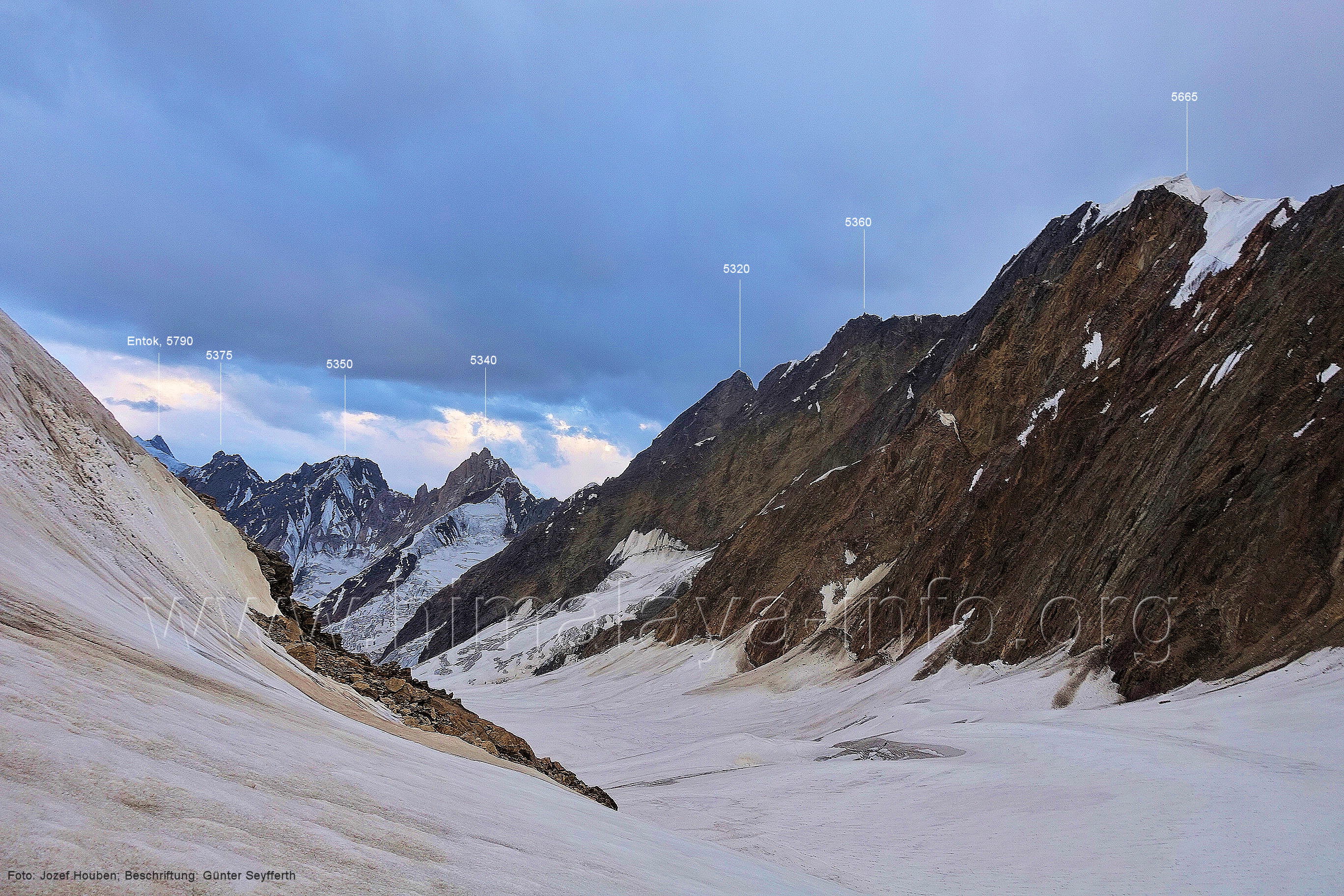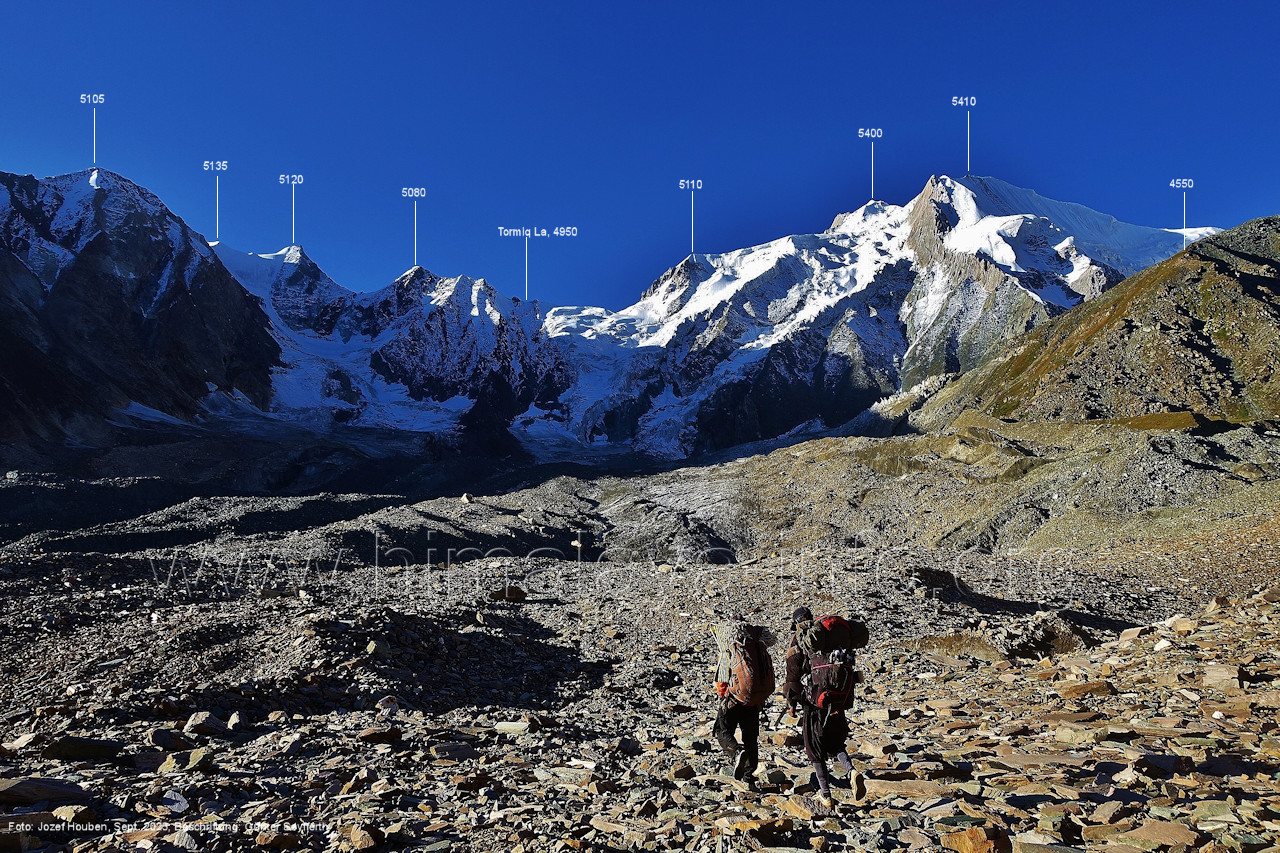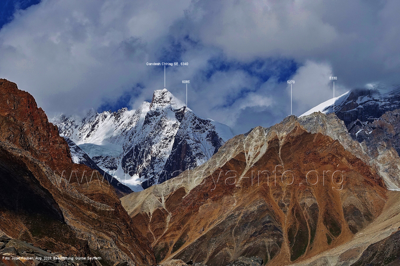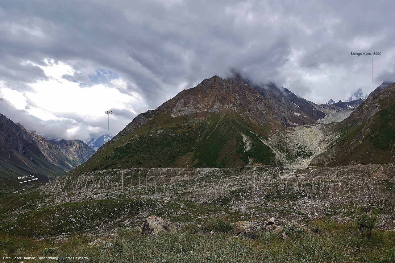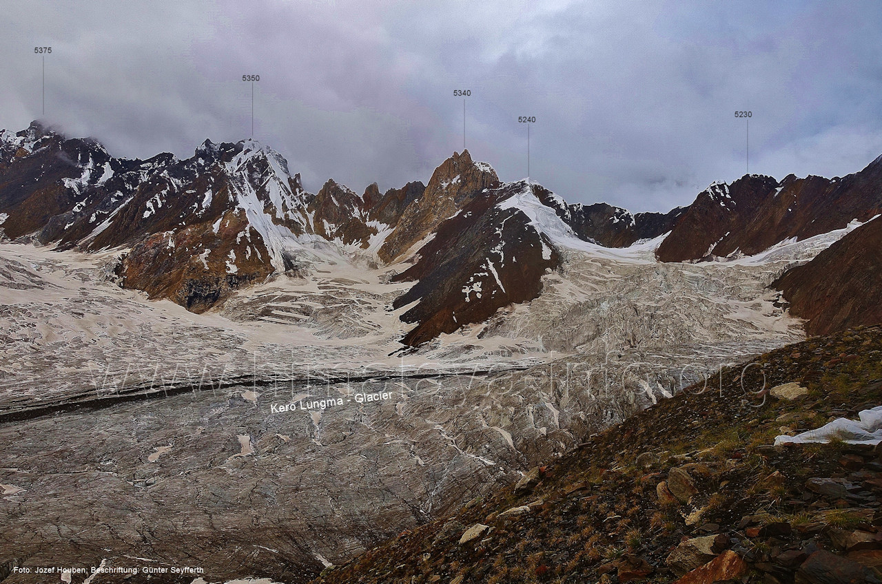 und Kero Lungma-Gletscher, Foto: Jozef Houben, Aug. 2023; Beschriftung: Günter Seyfferth (216) Blick aus ca. 4650 m Höhe am Nordhang des Kero-Lungma-Tals nach Osten Man ist soeben vom Lager in 4670 m Höhe aufgebrochen. Foto: Jozef Houben, Aug. 2023; Beschriftung: Günter Seyfferth Regenwolken verhüllten zeitweise die Berge, so dass erst am Nachmittag und ca. 1000 m tiefer wieder die Konturen der Berge sichtbar wurden. An dieser Stelle der Beschreibung wird das folgende
