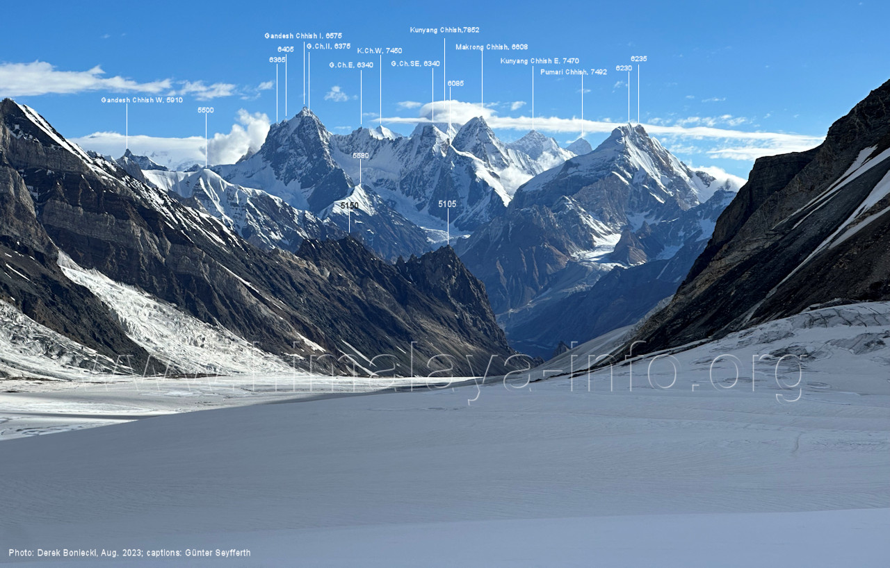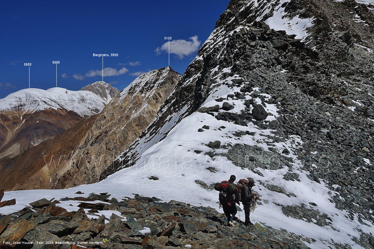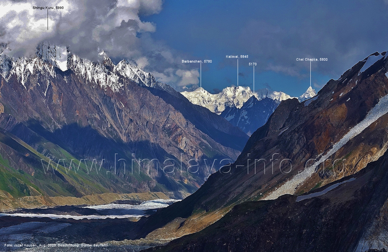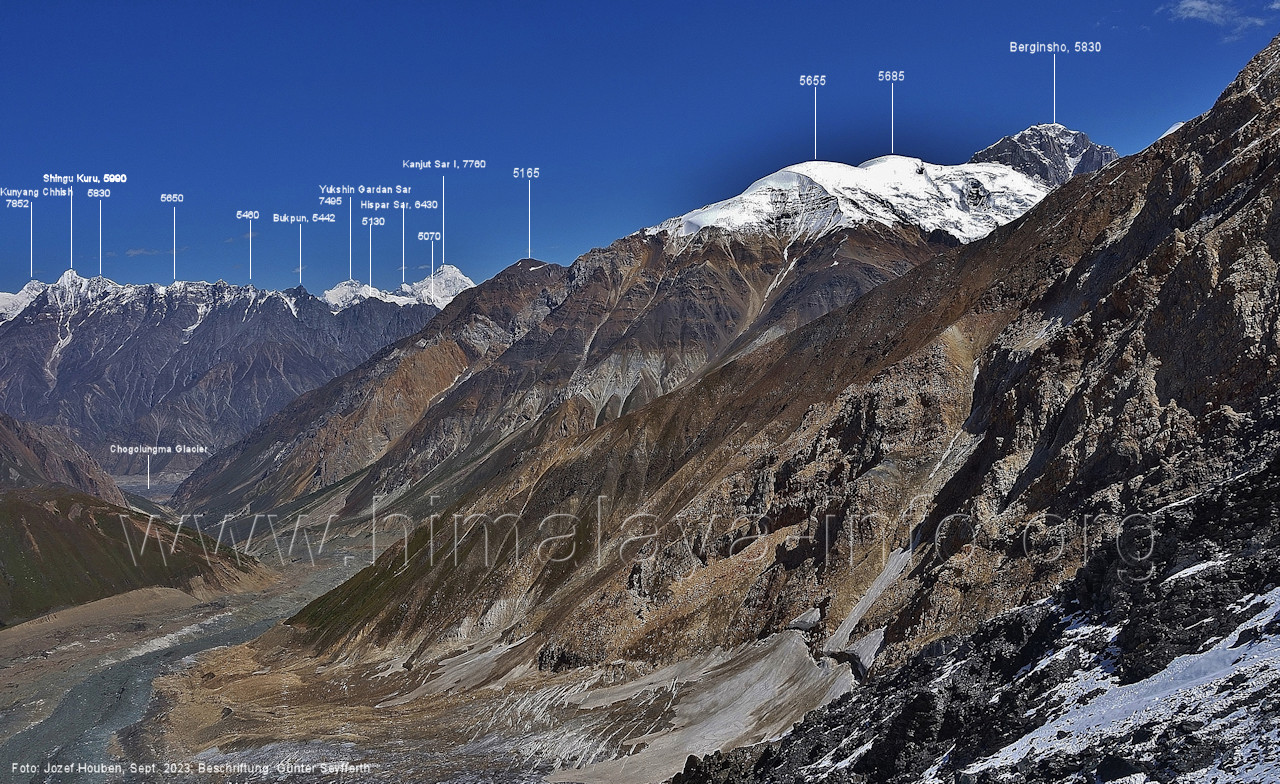 der für den weiteren Anstieg bessere Verhältnisse bietet. Foto: Jozef Houben, Aug. 2023; Beschriftung: Günter Seyfferth Das folgende Foto zeigt die Mündung des Bolocho-Tals, wo man den Gletscher betreten hat: (62) Rückblick bei 75°06'27" nach Osten zur Mündung des Bolocho-Tals und zum Shingu Kuru (5990 m) Foto: Jozef Houben, Aug. 2023; Beschriftung: Günter Seyfferth (63) Rückblick bei 75°06'16" nach Südosten mit Shingu Kuru (5990 m), Berginsho (5830 m) und Kapaltang Kun (6237 m) Foto: Jozef Houben, Aug. 2023; Beschriftung: Günter Seyfferth (64) Blick bei 75°06'15" nach Süden mit Kapaltang Kun (6237 m) und Paraber (6315 m) Foto: Jozef Houben, Aug. 2023; Beschriftung: Günter Seyfferth