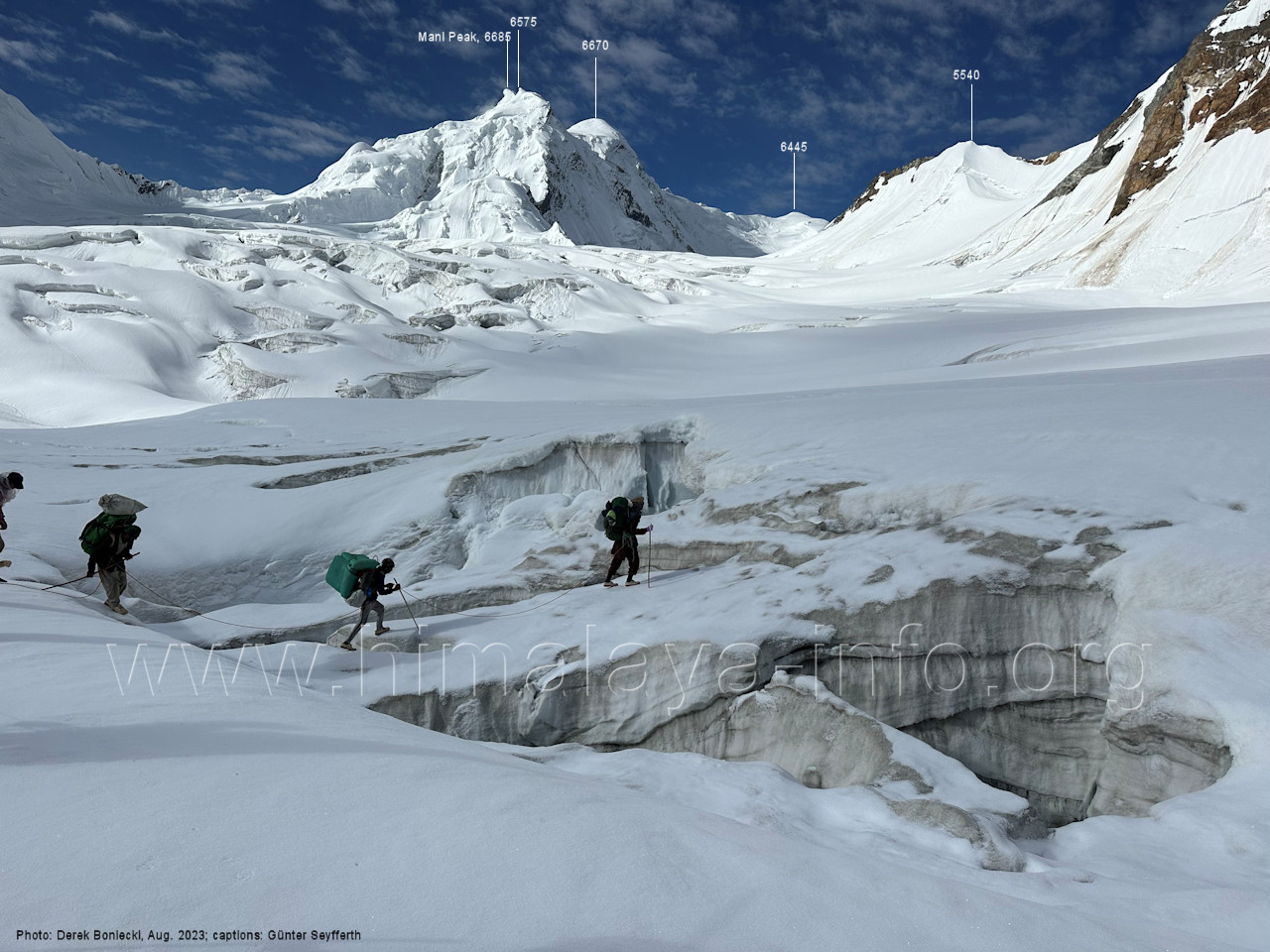 Nr. 79 erwähnten Gletscherquerung gemäß der gewählten Routenvariante. Foto: Jozef Houben, Aug. 2023; Beschriftung: Günter Seyfferth (86) Blick bei 75°02'45" in ca. 4100 m Höhe nach Südwesten mit Laila I (6986 m) und Malubiting (7458 m) Foto: Jozef Houben, Aug. 2023; Beschriftung: Günter Seyfferth Im nördlichen Bereich des Gletschers trifft man auf mehr Querspalten,,die einige Umwege erzwingen: (87) Blick bei 75°02'45" in ca. 4100 m Höhe nach Südosten