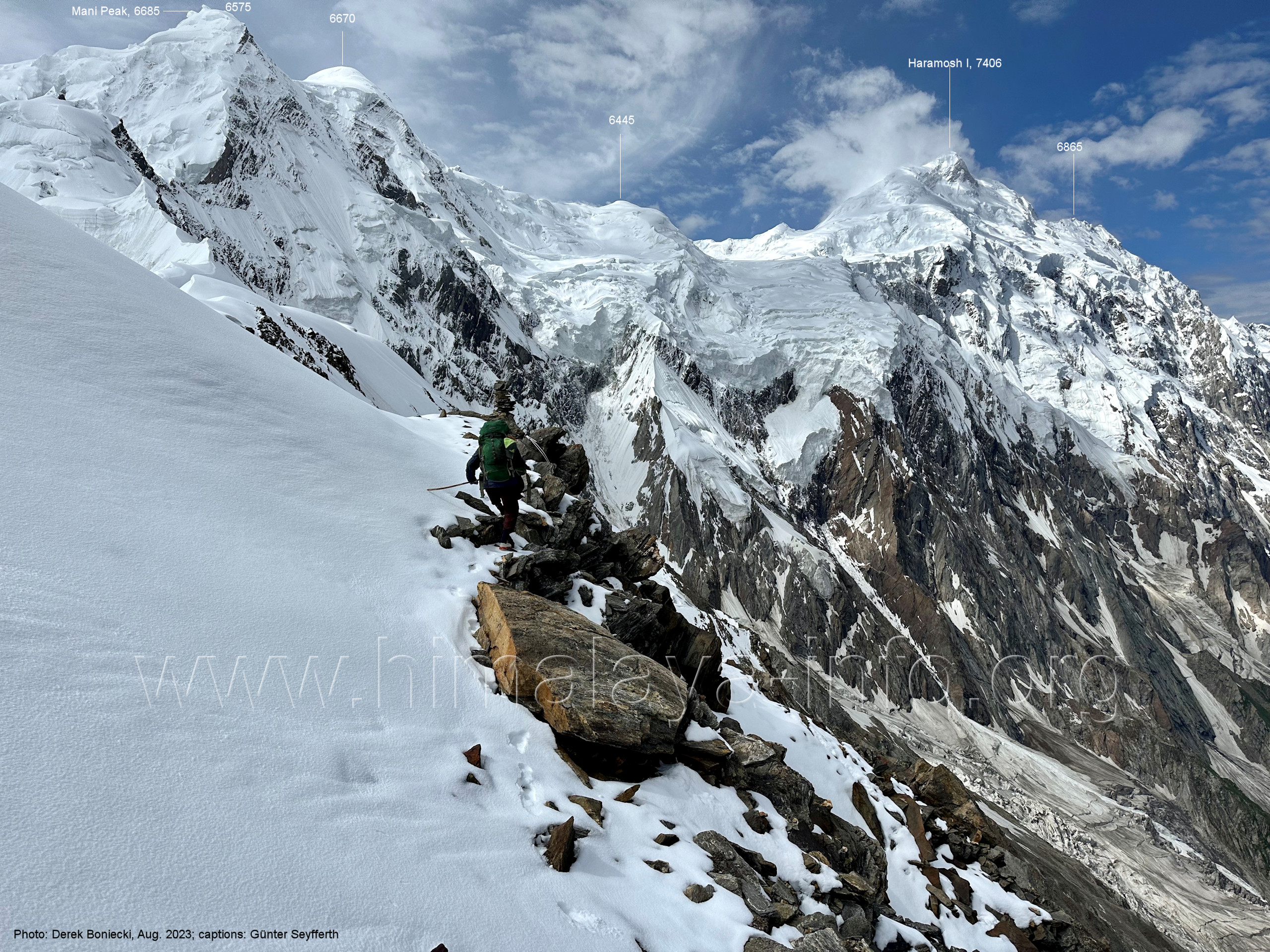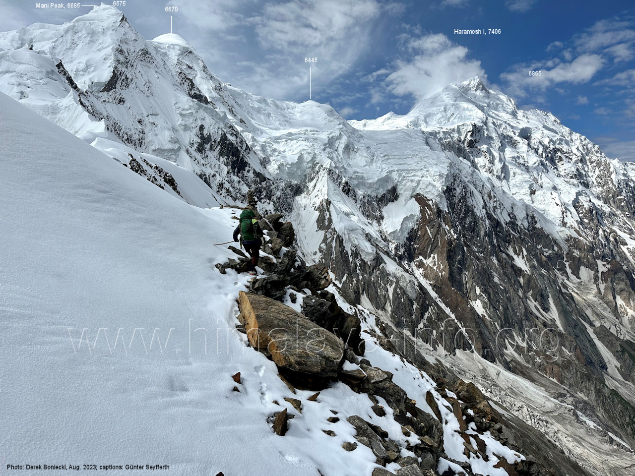 Chogolungma-Gletschers immer vor dem Spantik gesehen hat. Foto: Jozef Houben, Aug. 2023; Beschriftung: Günter Seyfferth Beim Blick nach Südwesten kommt nun auch der Haramosh I (7406 m) in Sicht: (81) Blick bei 75°03'30" nach Südwesten mit Haramosh I (7406 m) und Laila I (6986 m)
