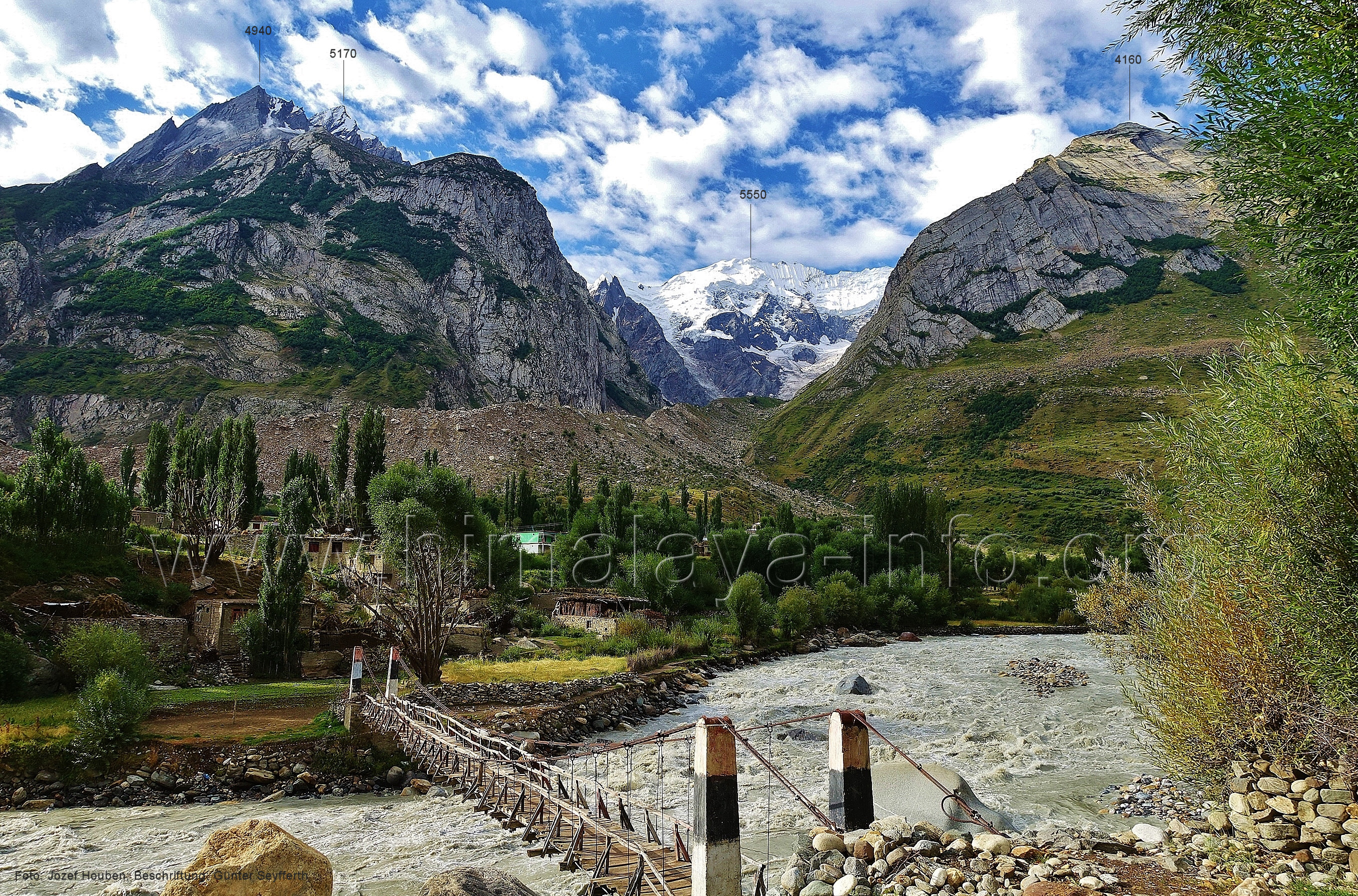Übergang zum Fuß am Westhang des Tales suchen. (221) Blick aus ca. 3650 m Höhe zu dem nach Süd-Südosten gerichteten Abschnitt des Kero Lungma-Tals Hinter den Bergen auf der linken Talseite liegt das Tal des Berelter Nala, dem Abfluss der Gletscher Solu und Sokha. Foto: Jozef Houben, Aug. 2023; Beschriftung: Günter Seyfferth (222) Blick entlang des unteren Abschnitts des Kero Lungma-Tals in Richtung Arandu Im Hintergrund, also jenseits von Arandu, sieht man Gipfel der Berggruppe des Berginsho (5830 m). Foto: Jozef Houben, Aug. 2023; Beschriftung: Günter Seyfferth (223) Rückblick zur Talmündung des Kero Langma in das Tal des Chogolungma-Gletschers bei Arandu Foto: Inna Yagudina (224) Blick von der Brücke über den Basha River bei Arandu nach Süden mit dem Seitental des Tippuri Gans Foto: Jozef Houben, Aug. 2023; Beschriftung: Günter Seyfferth F. Naamur Gans und Tormik La (4950 m)