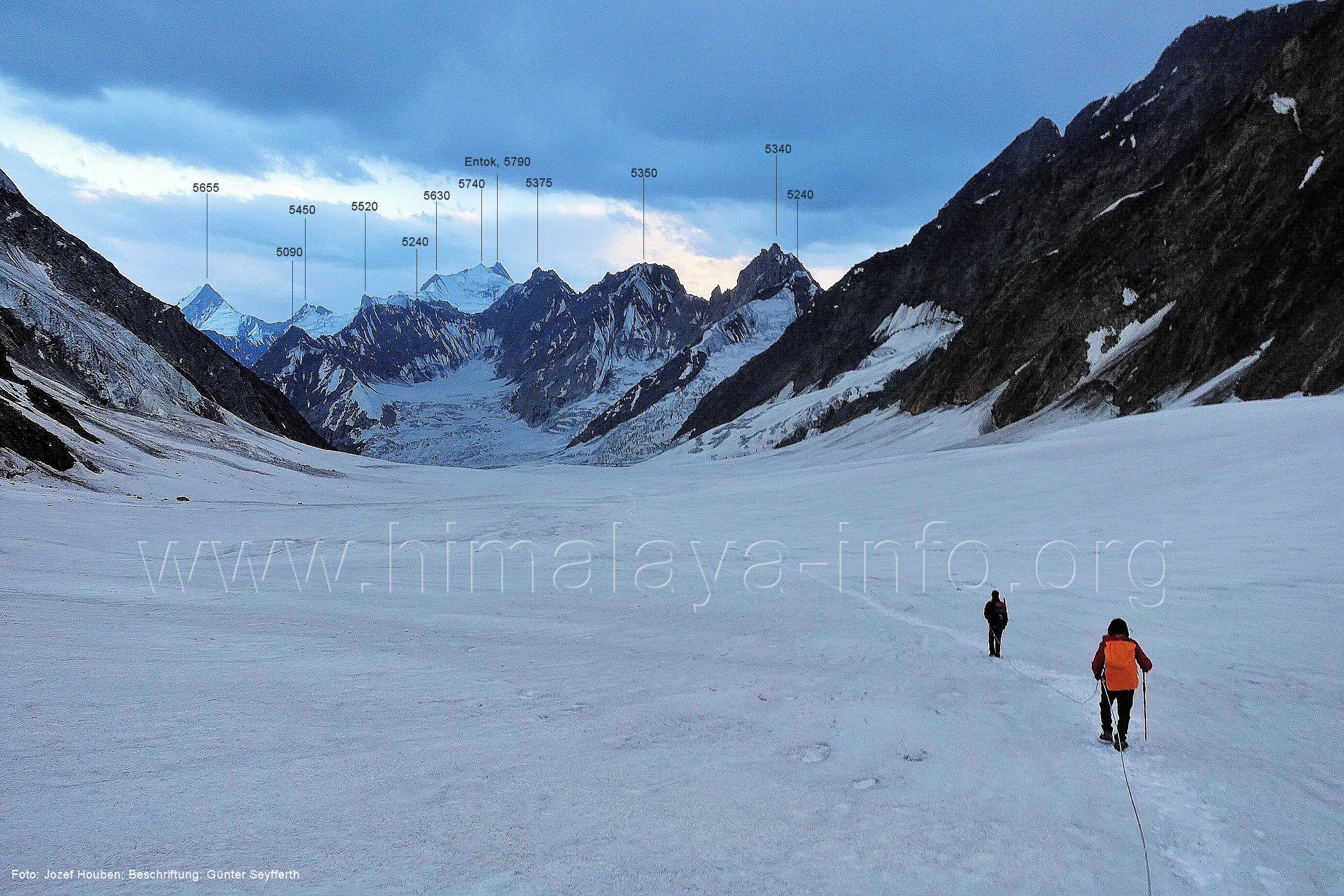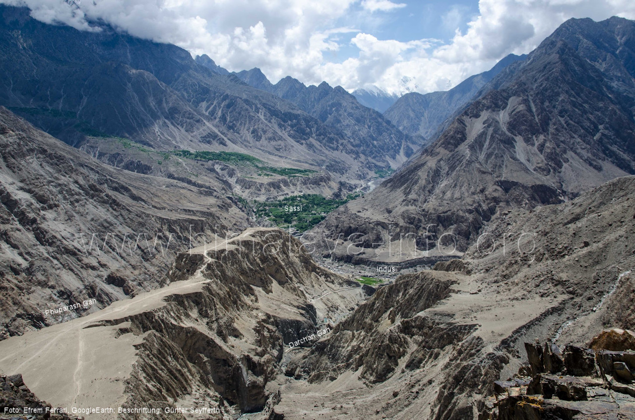 Es ist der Blick talabwärts über den Ort Stak und das Indus-Tal hinweg. Foto: Felix Kugele, Jan. 2017; Beschriftung: Günter Seyfferth (284) Blick von einem Standort am Hang nordöstlich der Zunge des Khotia Lungma-Gletschers nach Südwesten zum Diphungy (5940 m) Weil dieses Foto aus GoogleEarth den Diphungy so herrlich bei Sonnenuntergang zeigt, sei es auch hier gezeigt. Foto: Ephrem Ferrari, GoogleEarth (285) Blick von einem Standort am Hang nordöstlich der Zunge des Khotia Lungma-Gletschers nach Norden zum Goropha-Gletscher