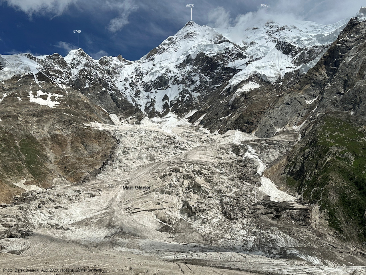 Teil der Berge auf der anderen Seite des Gletschers. Foto: Jozef Houben, Aug. 2023; Beschriftung: Günter Seyfferth (24) Tele-Blick bei 75°13'35" nach Nordwesten zum Spantik (7027 m)