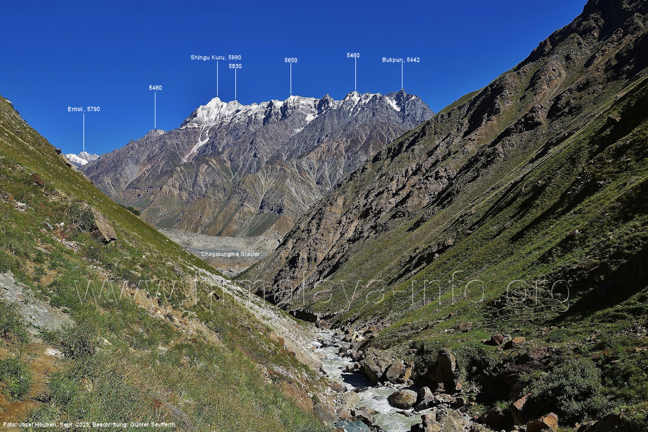Der Shingu Kuru ist der höchste Gipfel über dem unterem Chogolungma-Gletscher. Foto: Jozef Houben, Aug. 2023; Beschriftung: Günter Seyfferth (219) Blick talabwärts zur Mündung des Tals des Hucho Alchori-Gletschers Foto: Jozef Houben, Aug. 2023; Beschriftung: Günter Seyfferth (220) Blick nach Osten ins Tal des Hucho Alchori-Gletschers