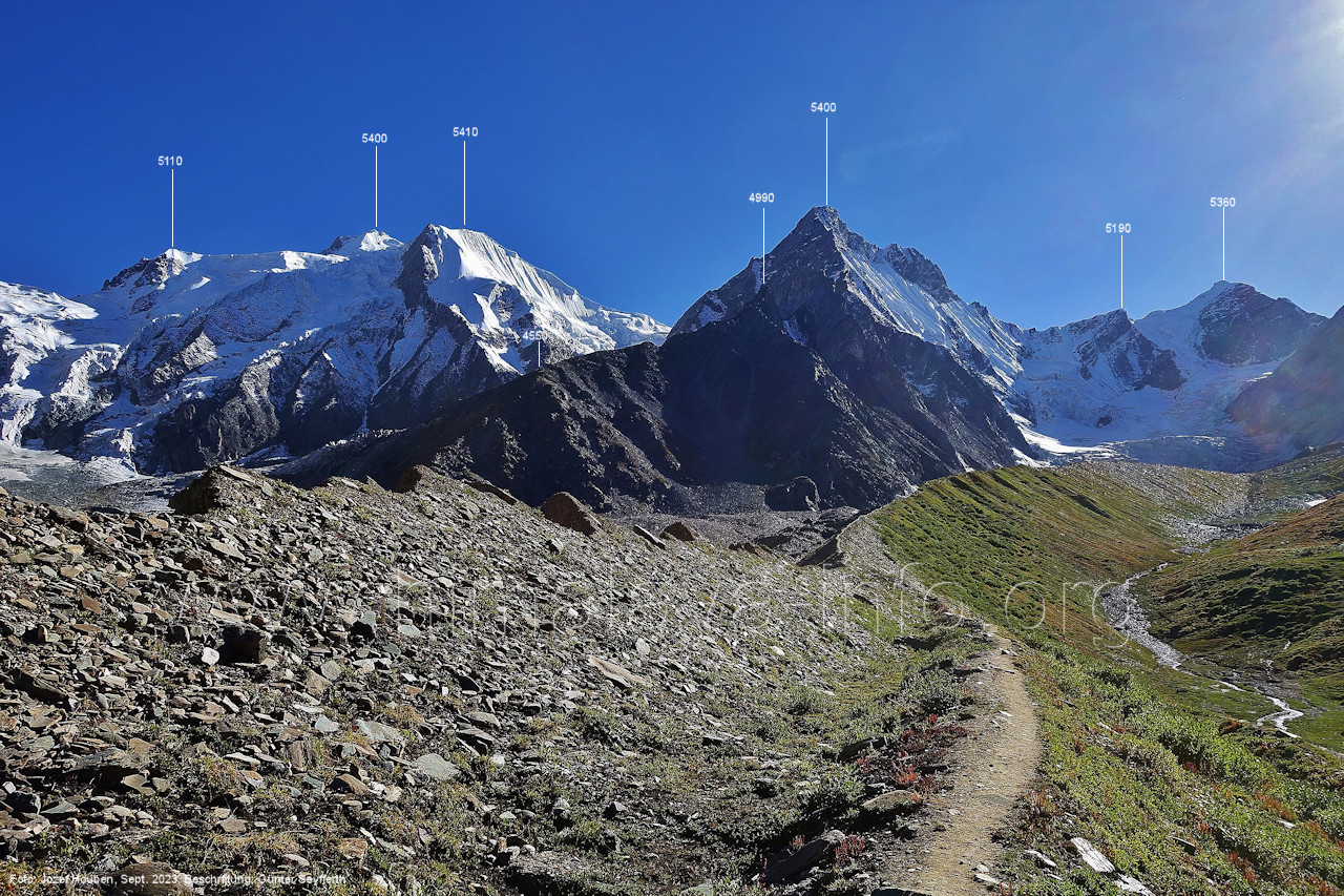 Hinter diesen Gipfeln liegt der obere Bolocho-Gletscher. Foto: Jozef Houben, Aug. 2023; Beschriftung: Günter Seyfferth Das folgende Bild reicht etwas weiter nach links: (213) Blick aus ca. 4670 m Höhe am Nordhang des Kero-Lungma-Tals nach West-Nordwesten Foto: Jozef Houben, Aug. 2023; Beschriftung: Günter Seyfferth (214) Blick aus ca. 4670 m Höhe am Nordhang des Kero-Lungma-Tals nach Südosten Foto: Jozef Houben, Aug. 2023; Beschriftung: Günter Seyfferth (215) Blick aus ca. 4670 m Höhe am Nordhang des Kero-Lungma-Tals nach Nordosten