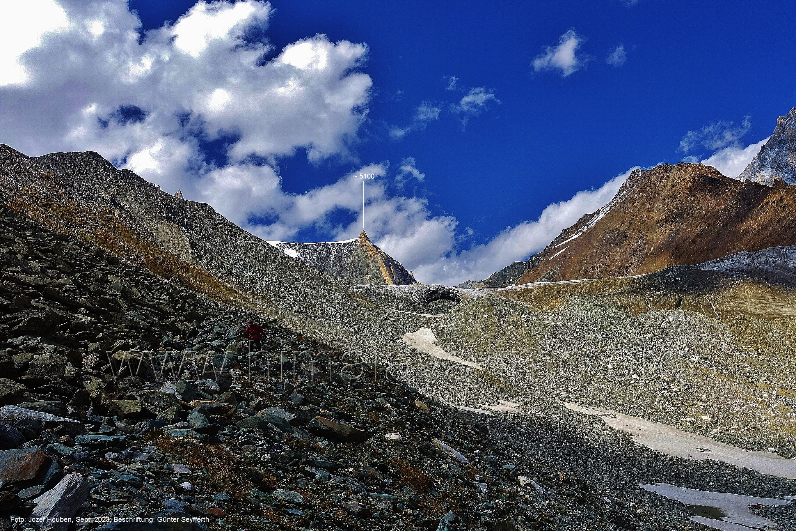 absteigenden Trekkers. Foto: Jozef Houben, Aug. 2023; Beschriftung: Günter Seyfferth (47) Blick bei 75°08'10" (H = 3810 m) nach Südosten