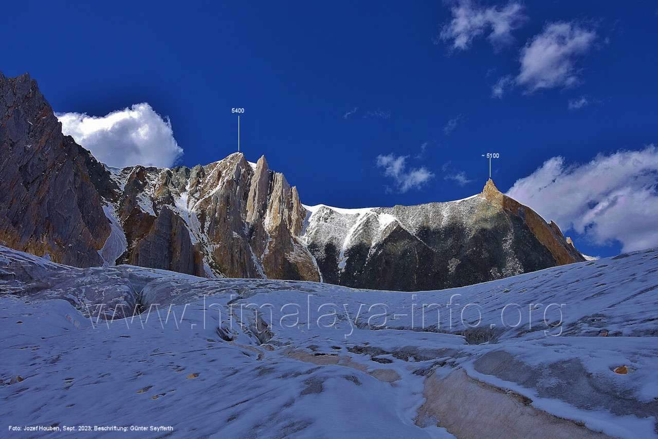 Man sieht einige der Bolocho-Gipfel. Foto: Jozef Houben, Aug. 2023; Beschriftung: Günter Seyfferth (76) Blick bei 75°04'45" in ca. 4000 m Höhe nach Süd-Südosten zum Kapaltang Kun (6237 m) Foto: Jozef Houben, Aug. 2023; Beschriftung: Günter Seyfferth (77) Blick bei 75°04'45" nach Süden mit Kapaltang Kun (6237 m) und Peak 5470 Foto: Jozef Houben, Aug. 2023; Beschriftung: Günter Seyfferth (78) Blick bei 75°04'05" nach Osten mit Bolocho V (5420