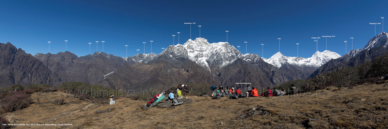 links stehen am West- bzw. Ostrand des Tales des Lapche Khola. Foto: Jamie McGuinness, Nov. 2013, flickr.com; Beschriftung: Günter Seyfferth Das folgende Foto zeigt die rechte Bildhälfte vom Gaurisankar bis zum Tabayabyum: