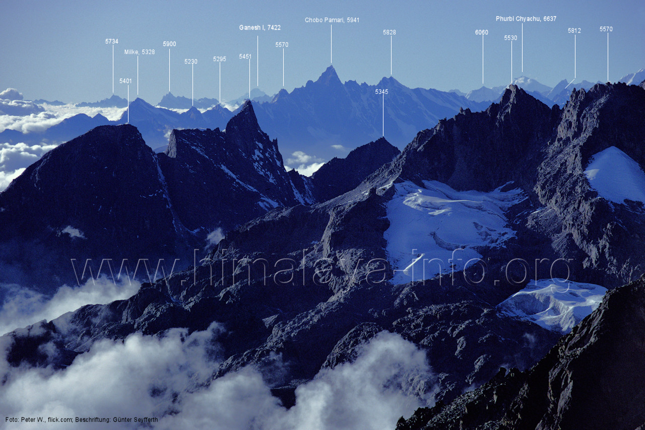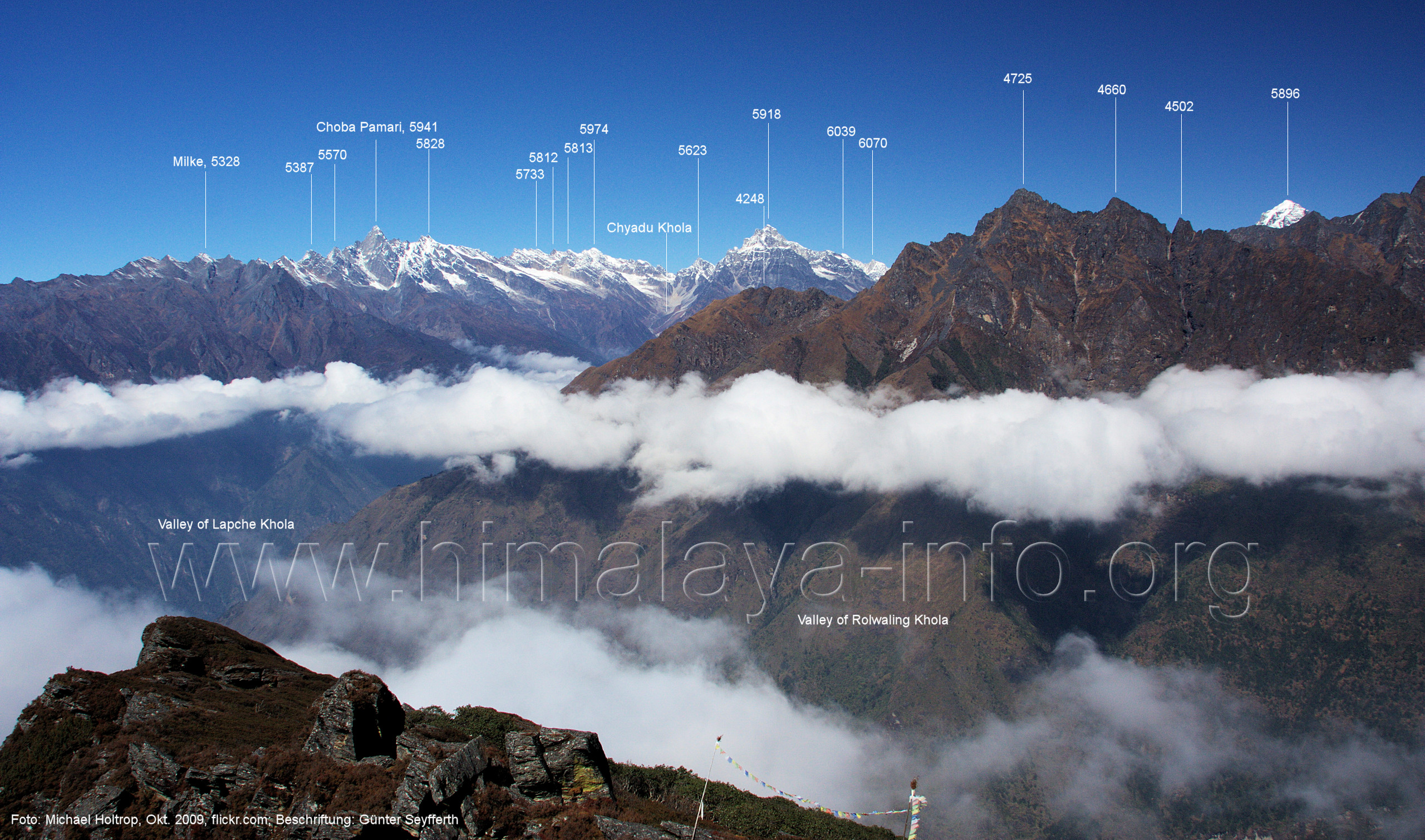 Die schneefreien Berge im Vordergrund stehen mit Ausnhame des Peak 6125 alle am Südrand des Tales des Rolwaling Khola. Foto: Oleg Bartunov, flickr.com; Beschriftung: Günter Seyfferth