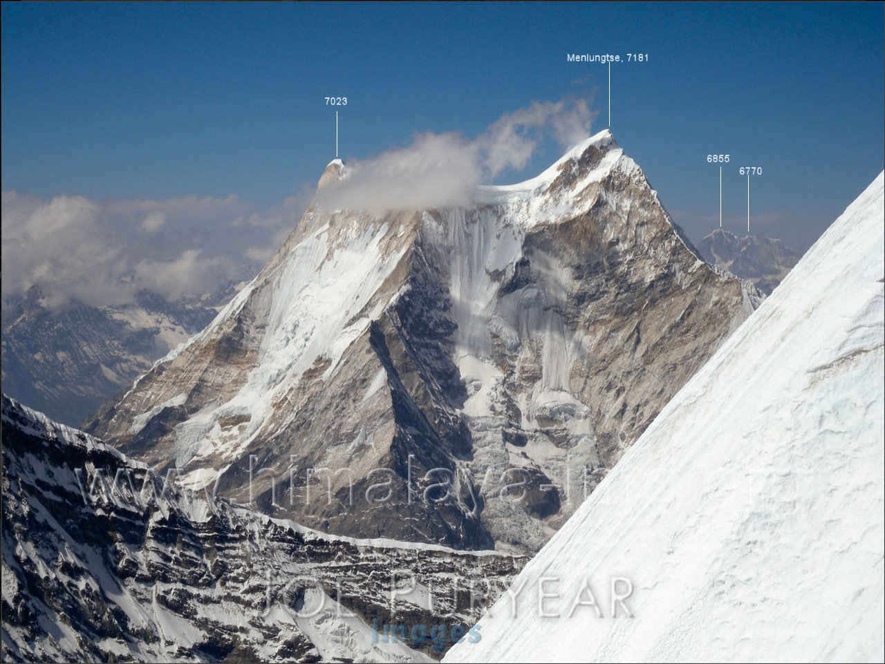 hohen Aussichtspunkt bei Kalinchowk (27°44'32" N, 86°02'07" E) aufgenommen. Foto: Saroy Pandey, commons.wikipedia.org, März 2015; Beschriftung: Günter Seyfferth Das folgende Luftbild zeigt den Menlungtse von Südosten: