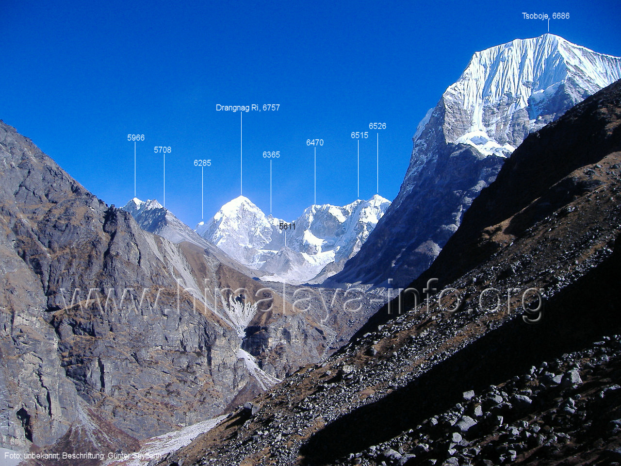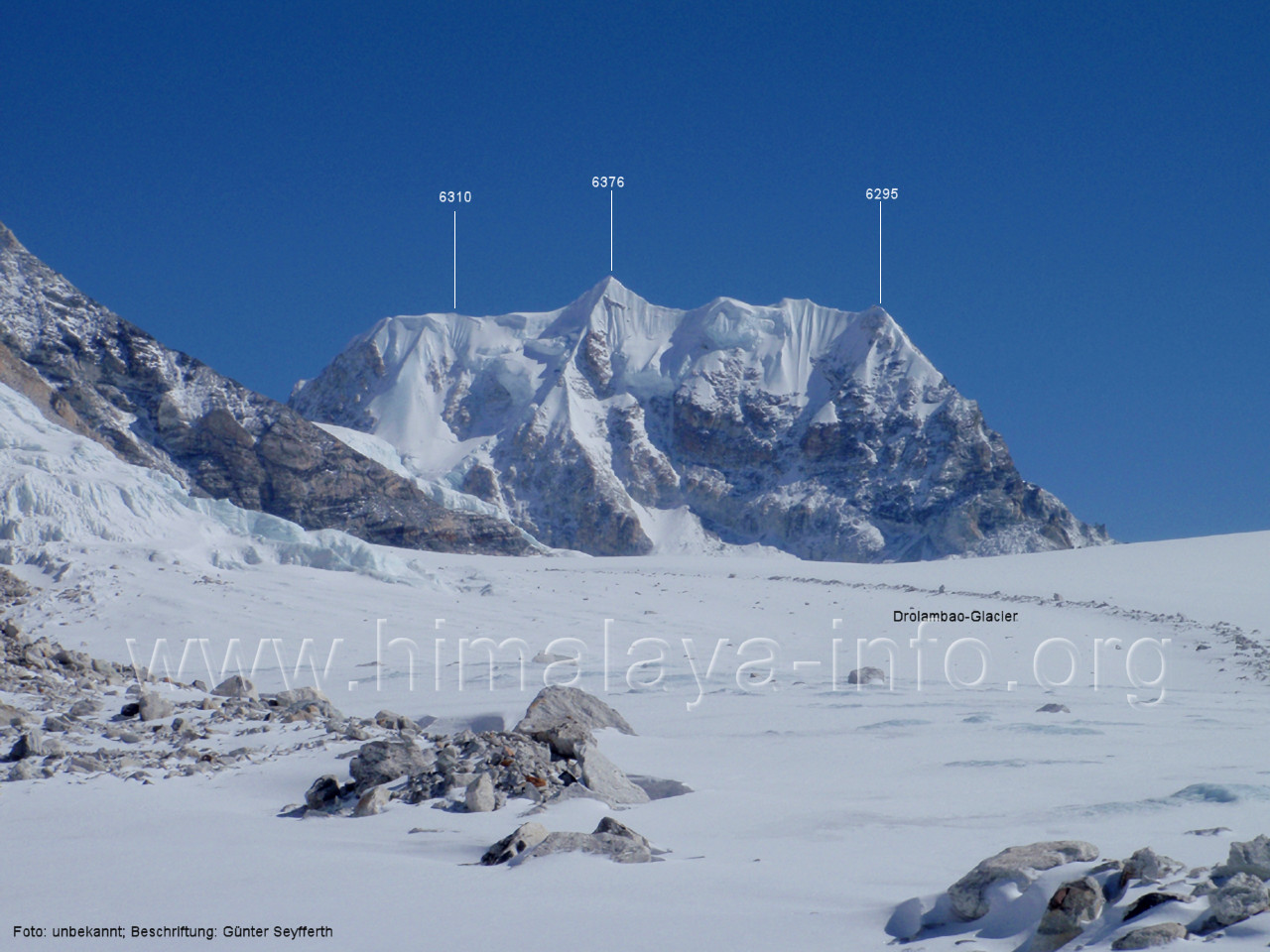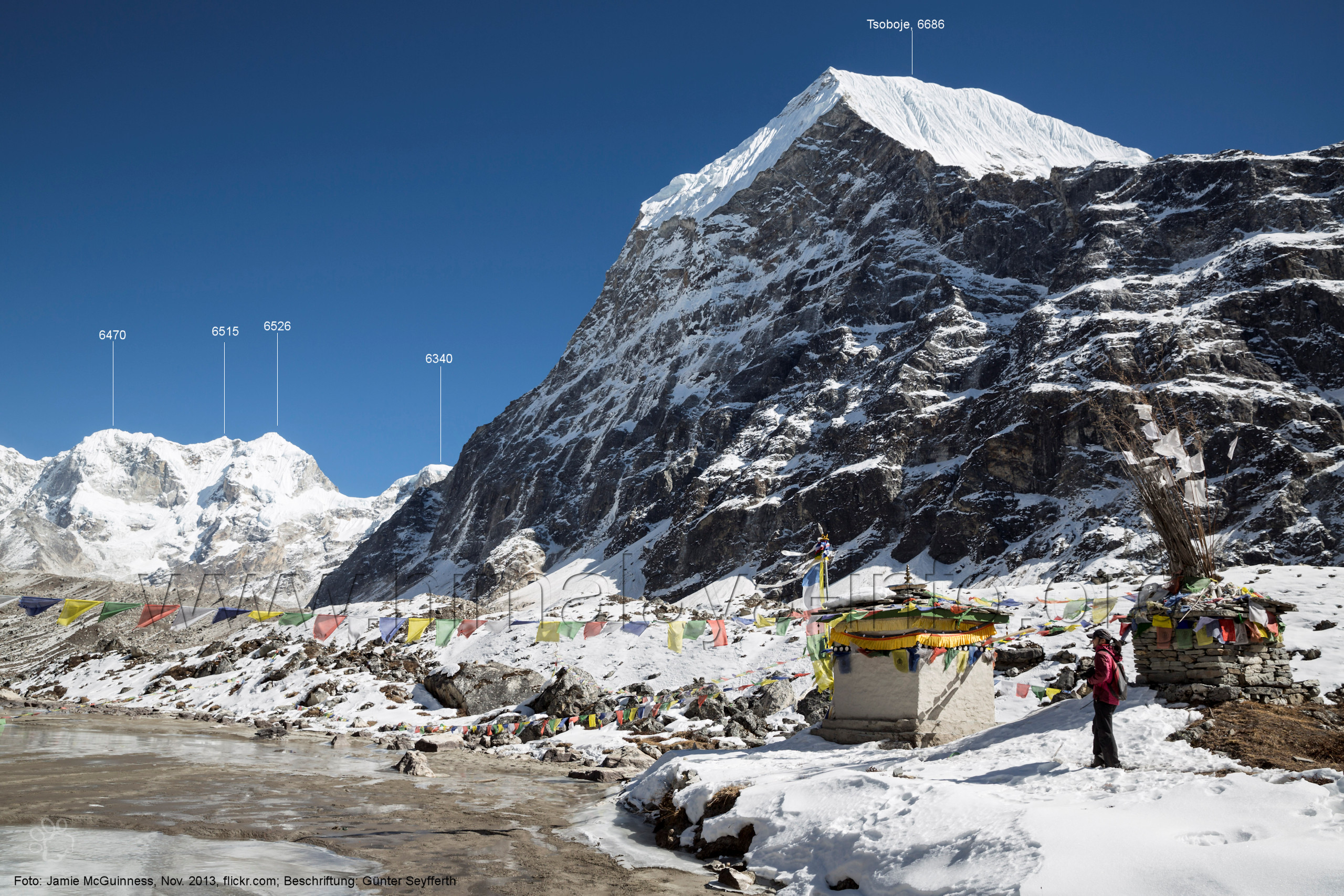 nicht blicken,nur sein nördlicher Vorgipfel. Foto: Michael Holtrop, Okt. 2009, flickr.com; Beschriftung: Günter Seyfferth (29) Blick aus ca. 4200 m Höhe im Tal Rolwaling Khola nach Osten zum Tsoboje (6686 m) Statt "Tsoboje" findet man auch den Namen "Choburtse". Hier sieht man bereits die Moräne des