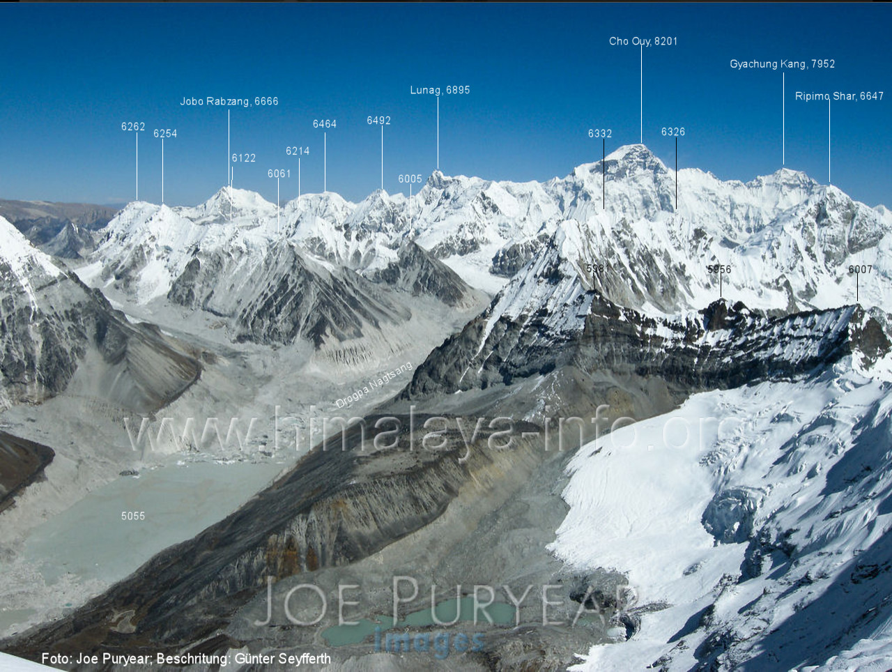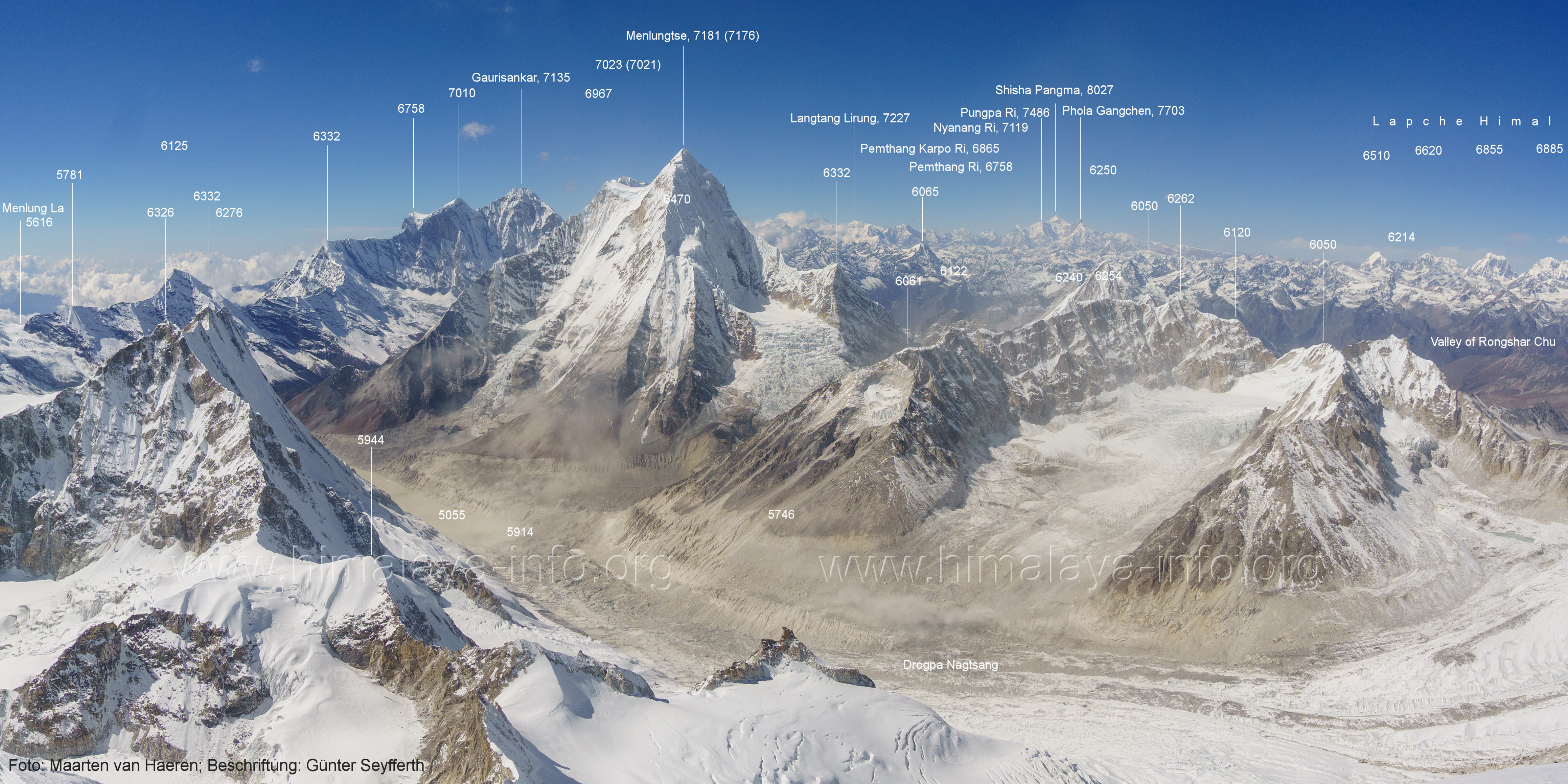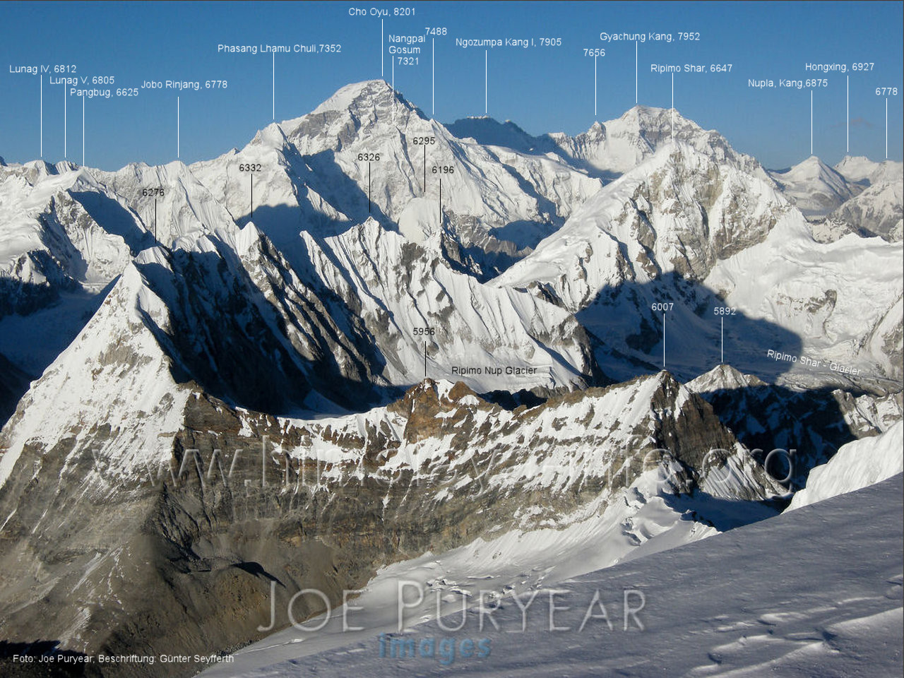 Becken des Drogpa Nagtsang. Foto: Shiningwall.com (nicht mehr online); Beschriftung: Günter Seyfferth (174) Blick vom Gipfel des Menlungtse nach Nordosten bis Osten mit Cho Oyu ( 8201 m), Mount Everest (8848 m) und Lhotse (8 (8516 m)Dieses Foto ist bei der Erstbesteigung des Menlungtse im Jahr 1992 entstanden. Foto: Andrej Stremfelj/Marko Prezelj; Beschriftung: Günter Seyfferth zum Beginn dieses Abschnitts G H. Unter den südlichen Hängen des Rolwaling Himal