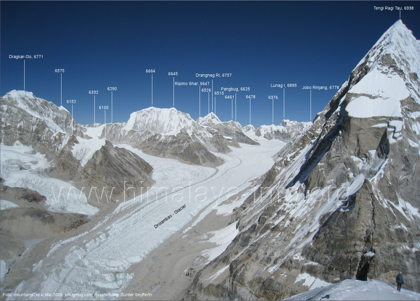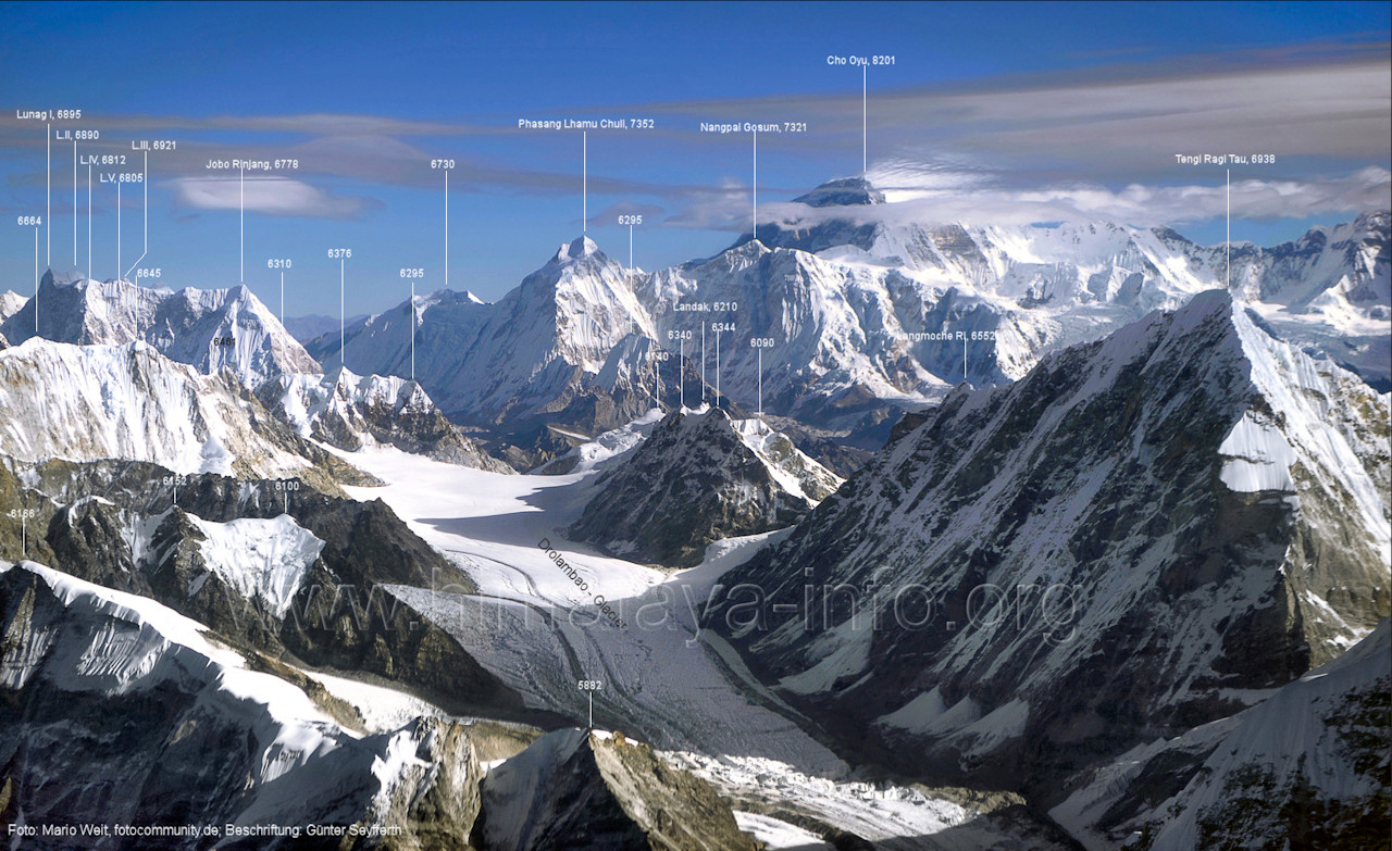 (6895 m), Jobo Rinjang (6778 m) Rechts unten, vor dem Tengi Ragi Tau, beginnt der Schlussanstieg vom Drolambao-Gletscher nach rechts zum Pass Tashi Labtsa. Foto: Mario Weit, fotocommunity.de; Beschriftung: Günter Seyfferth