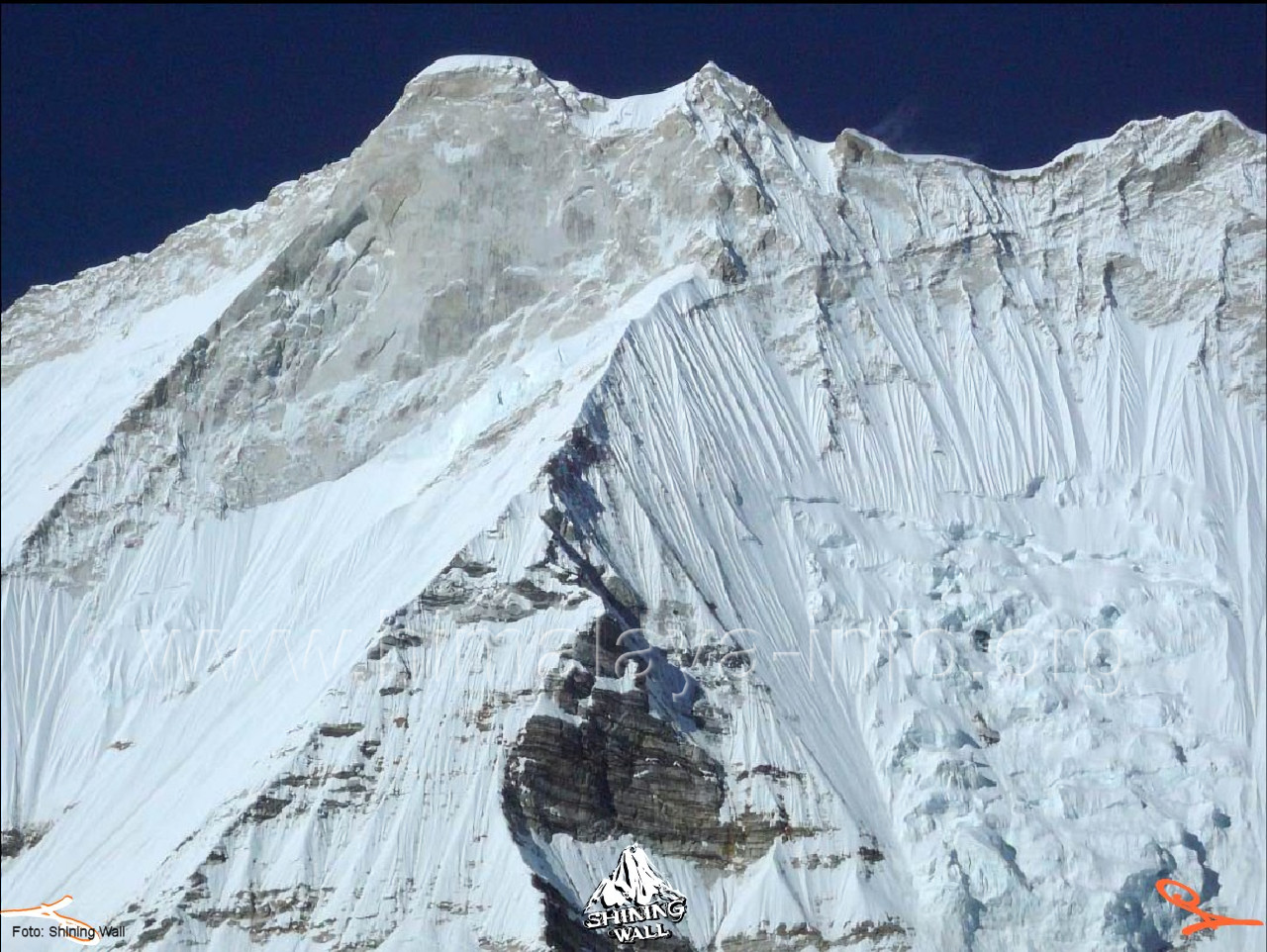 Westflanke des Menlungste mit dem Westgipfel (7023 m) Eine Lawine weckte die Aurmerksamkeit des Fotografen. Foto: Shining Wall (nicht mehr online)
