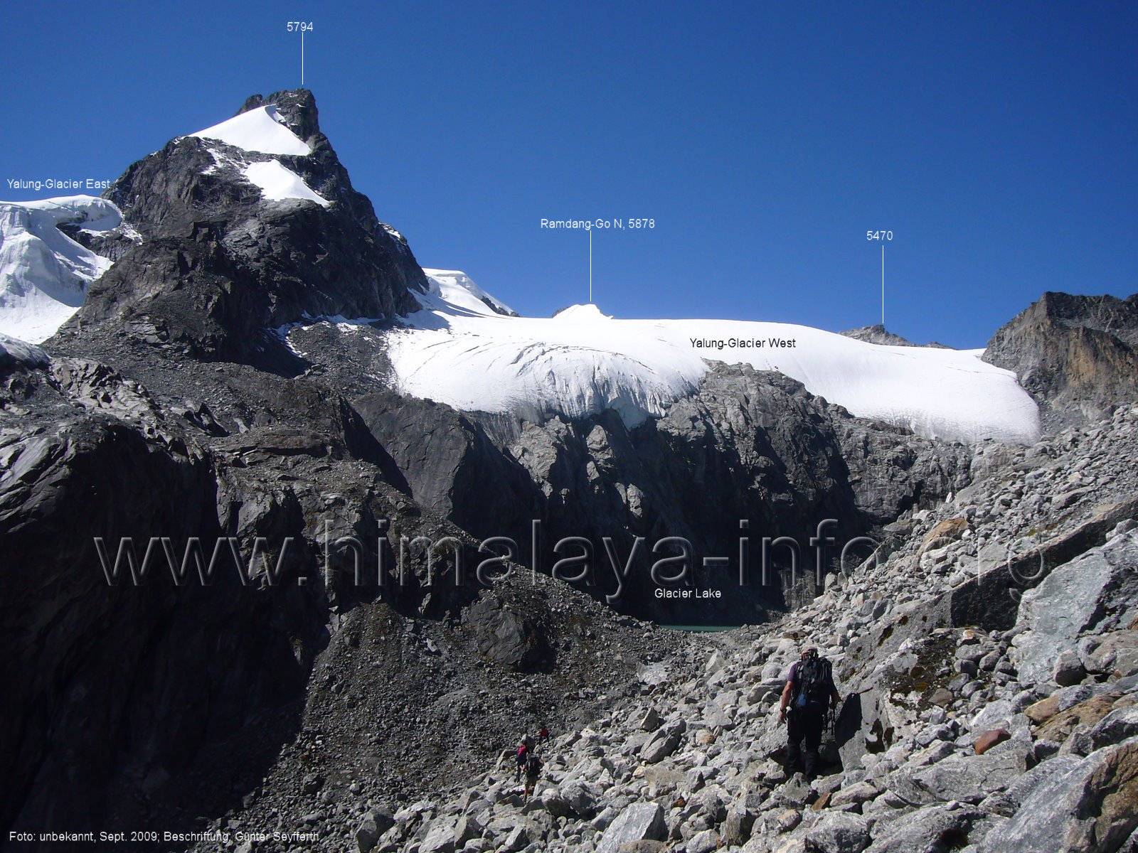 Kamm der alten Moräne. Foto: unbekannt, Sept. 2008; Beschriftung: Günter Seyfferth (43) Tele-Blick vom Yalung-Hochlager nach Südwesten zum Yalung Ri (5647 m) Meistens wird der Yalung Ri über den Schneegrat rechts des Gipfels erstiegen. Foto: Michael Holtrop, Okt. 2009, flickr.com; Beschriftung: Günter Seyfferth