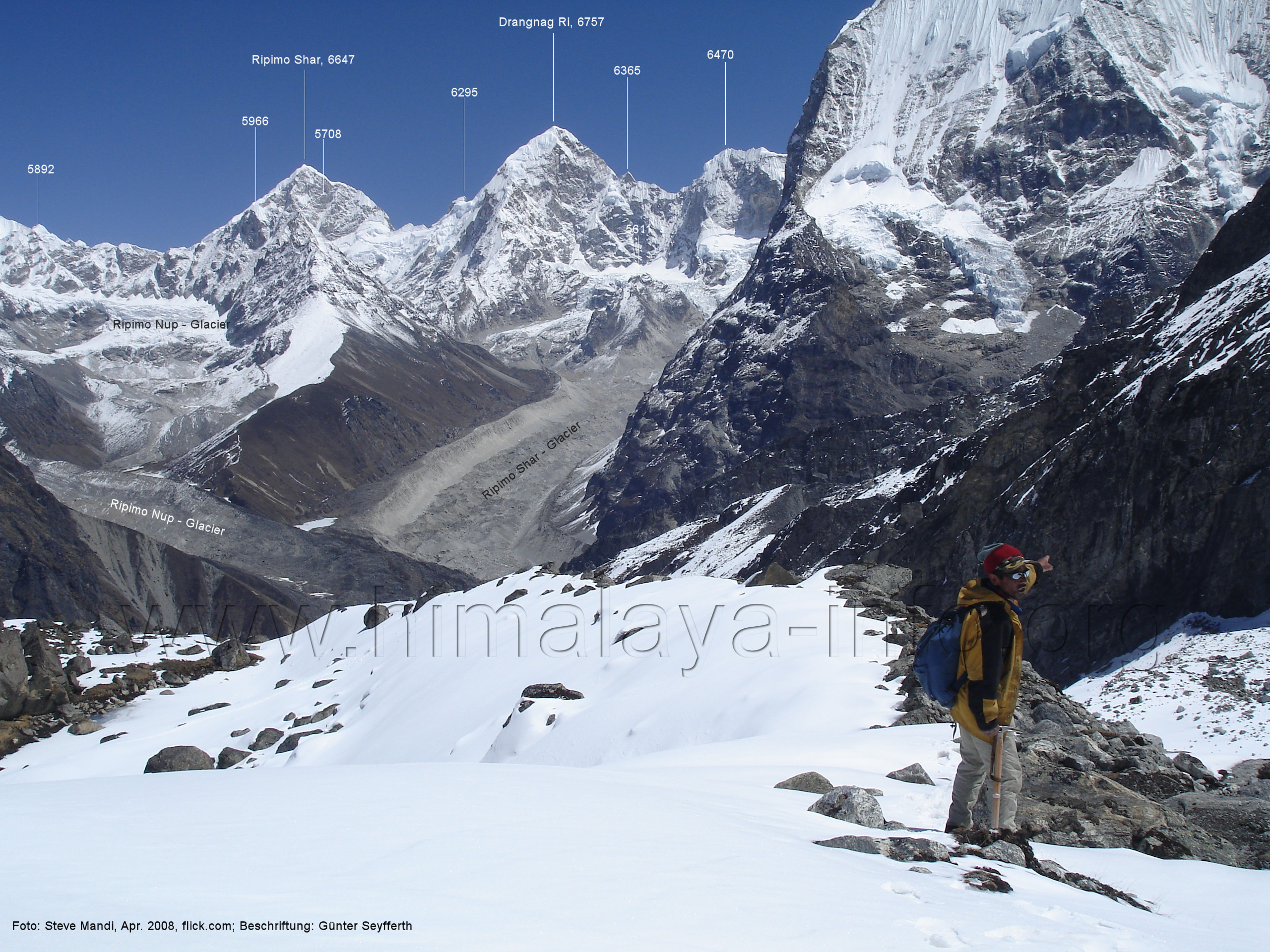ins Seitental der Ripimo-Gletscher Foto: unbekannt; Beschriftung: Günter Seyfferth (35) Blick aus ca. 4700 m Höhe im Aufstieg zum Yalung-Hochlager nach Nordosten mit Drangnag Ri (6757 m) und Tsoboje (6686 m) Foto: unbekannt, Apr. 2010; Beschriftung: Günter Seyfferth