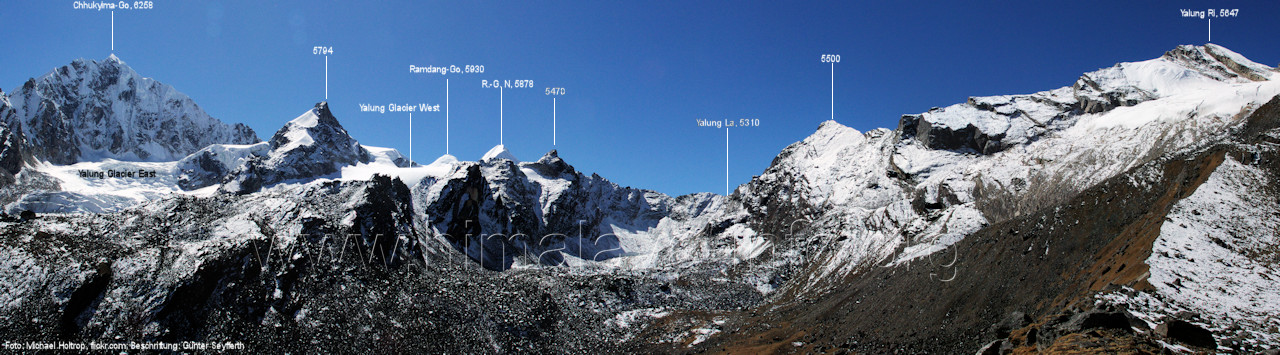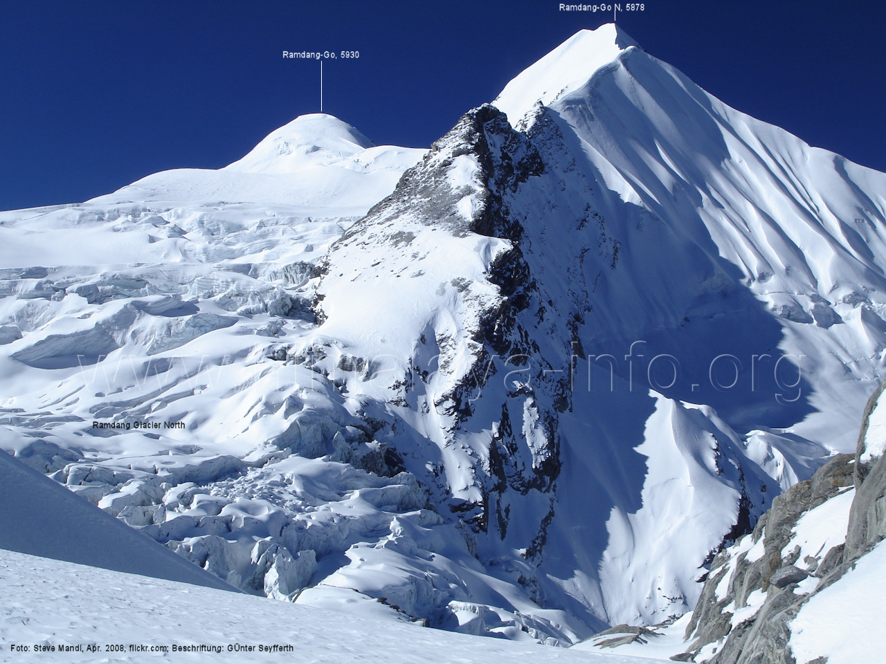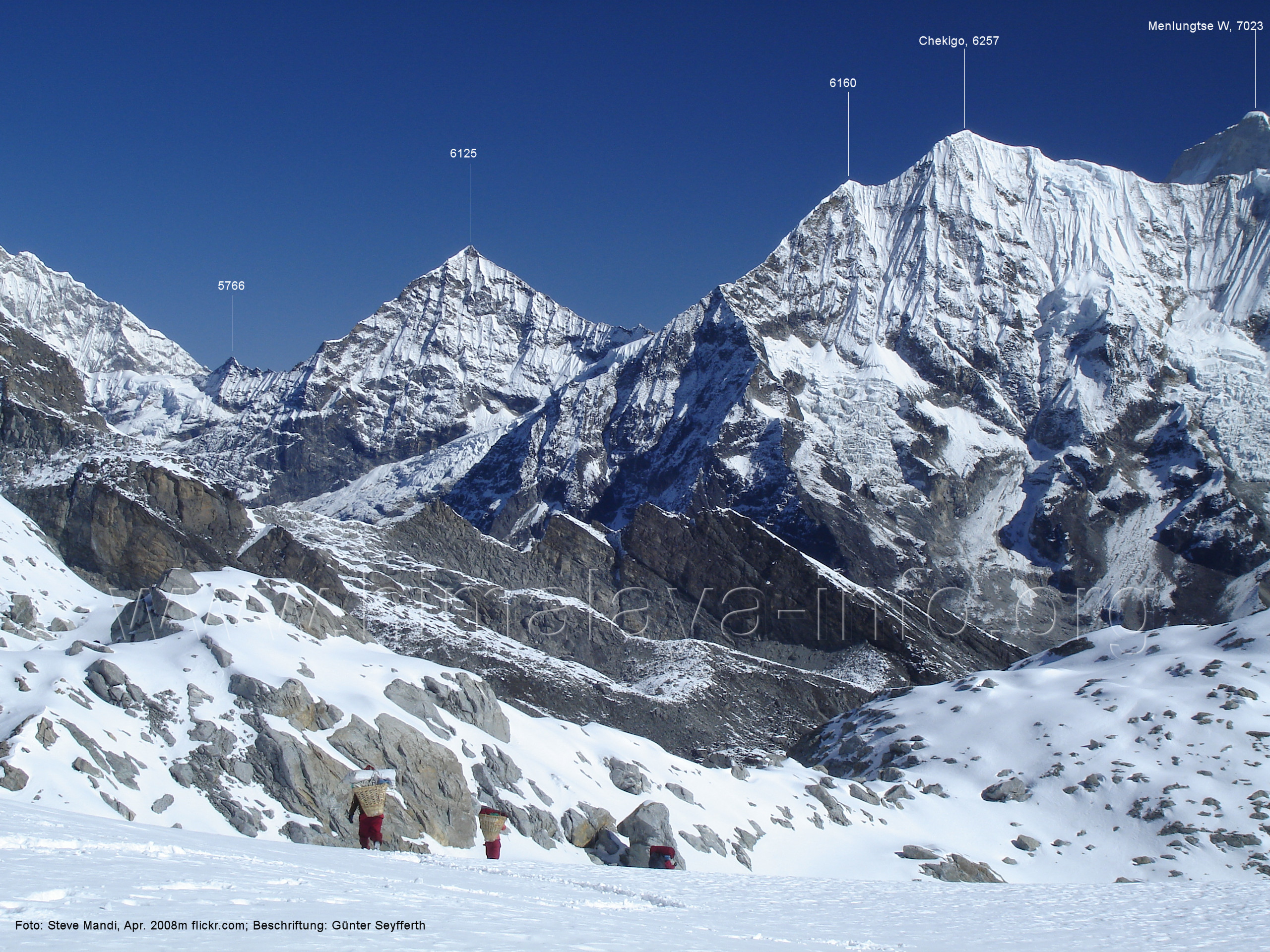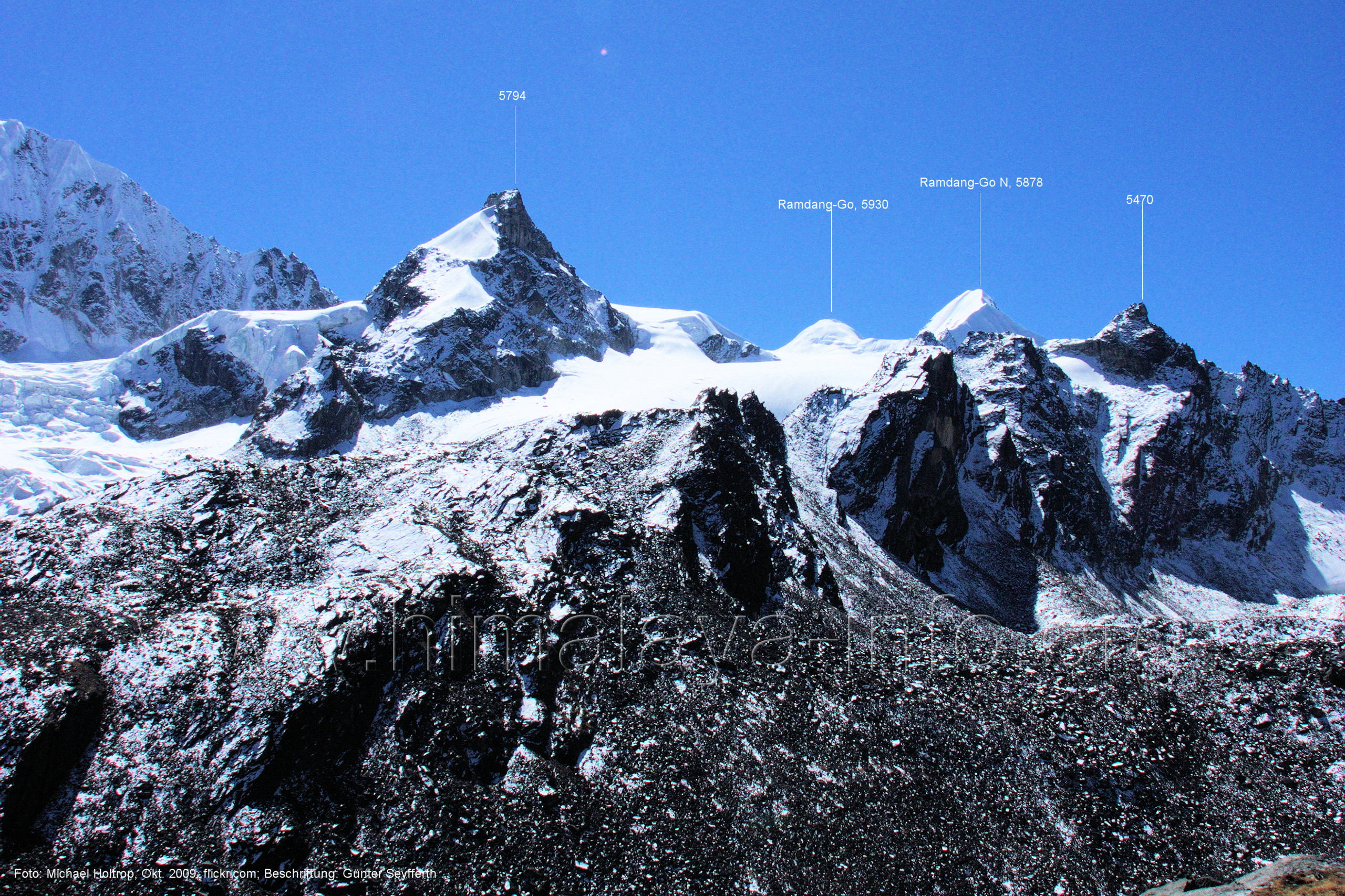 Südwesten Foto: Michael Holtrop, Okt. 2009, flickr.com; Beschriftung: Günter Seyfferth (48) Detail-Blick aus ca. 5100 m Höhe auf der Moräne westlich des Hochlagers nach Süden mit Peak 5794 und Ramdang-Go (5930 m)