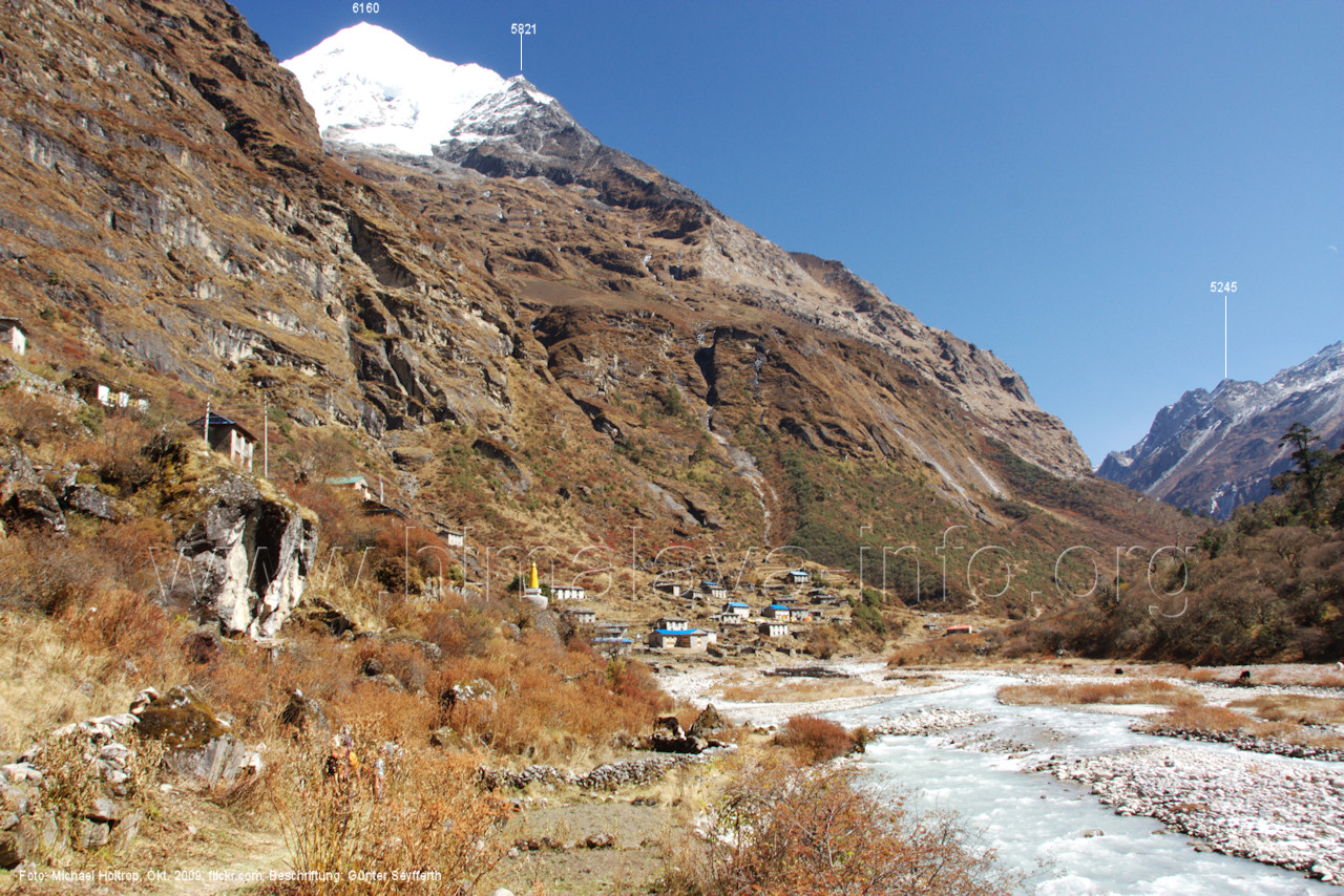 eingeschnitten, (15) Blick vom Talgrund des Rolwaling Khola in 3200 m Höhe nach Osten zum Peak 6125 und zum Chekigo (6257 m) Foto: Michael Holtrop, Okt. 2009, flickr.com; Beschriftung: Günter Seyfferth (16) Blick aus ca. 3680 m Höhe am Rolwaling Khola flussaufwärts zum Vorgipfel (6160 m) des Chekigo (6257 m) Foto: Michael Holtrop, Okt. 2009, flickr.com; Beschriftung: Günter Seyfferth (17) Blick aus ca. 3680 m Höhe am Rolwaling Khola flussaufwärts zum Dorf Beding Der rechts sichtbare Peak 5634 steht unmittelbar nördlich des Yalung Ri (5647 m) über dem Dorf Na. Foto: Michael Holtrop, Okt. 2009, flickr.com; Beschriftung: Günter Seyfferth (18) Blick von Beding (3700 m) talauswärts