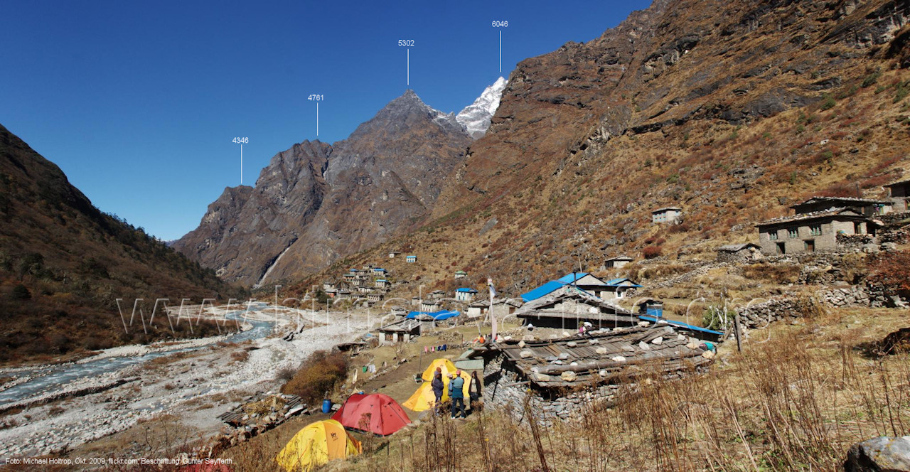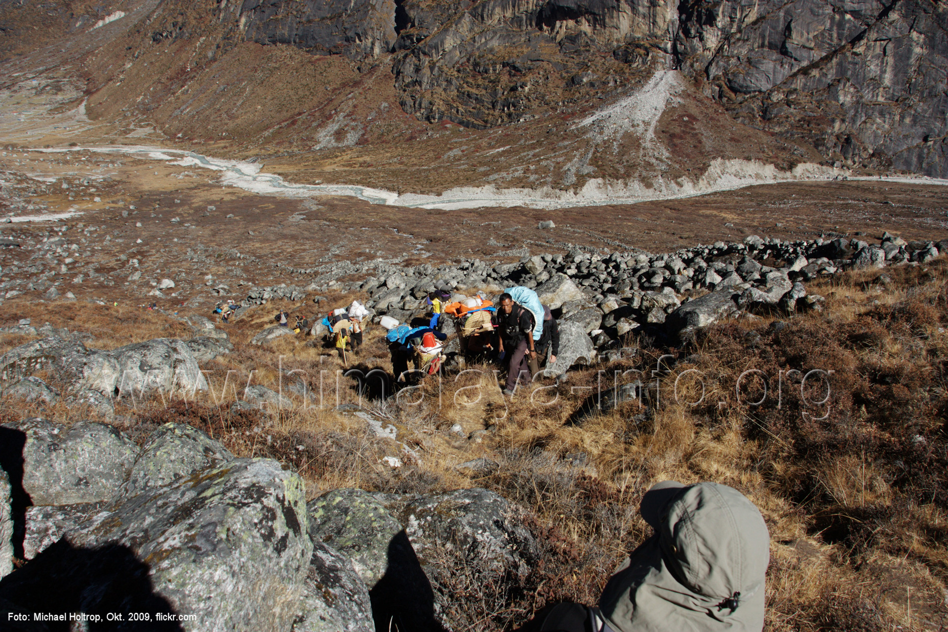 im Tal des Rolwling Khola. Foto: Michael Holtrop, Okt. 2009, flickr.com; Beschriftung: Günter Seyfferth Im Abstieg ins Tal des Rolwaling Khola finden sich aussichtsreiche Rast- oder Lagerplätze: