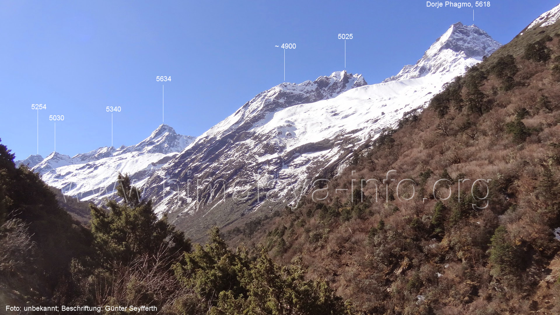 Ramdang-Go (5930 m) und Chukyima-Go (6258 m) Foto: Pierre Martin (www.martinpierre.fr); Beschriftung: Günter Seyfferth (182) Blick vom Gyajo La (4877 m) nach Osten zum Numbur (6958 m) Foto: Pierre Martin (www.martinpierre.fr); Beschriftung: Günter Seyfferth