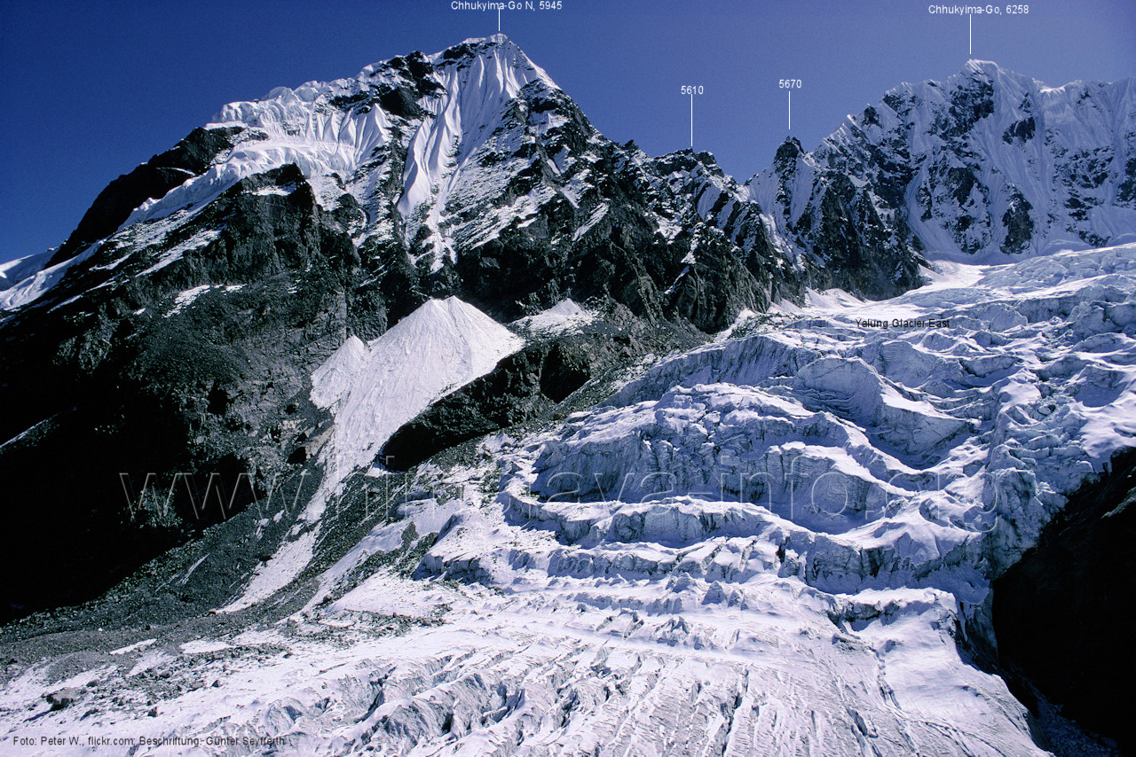 Trakarding-Gletschers, die den See Tsho Rolpa aufstaut. Foto: Mongoose Travel, Okr. 2011, flickr.com;; Beschriftung: Günter Seyfferth (30) Tele-Blick zum Gipfel des Tsoboje (6686 m, Choburtse) mit dem interessanteen Muster aus Riffelfirn Foto: Mongoose Travel, Okr. 2011, flickr.com; Beschriftung: Günter Seyfferth C. Yalung-Hochlager (5000 m), Yalung Ri (5647 m) und Ramdang-Go (5930 m)
