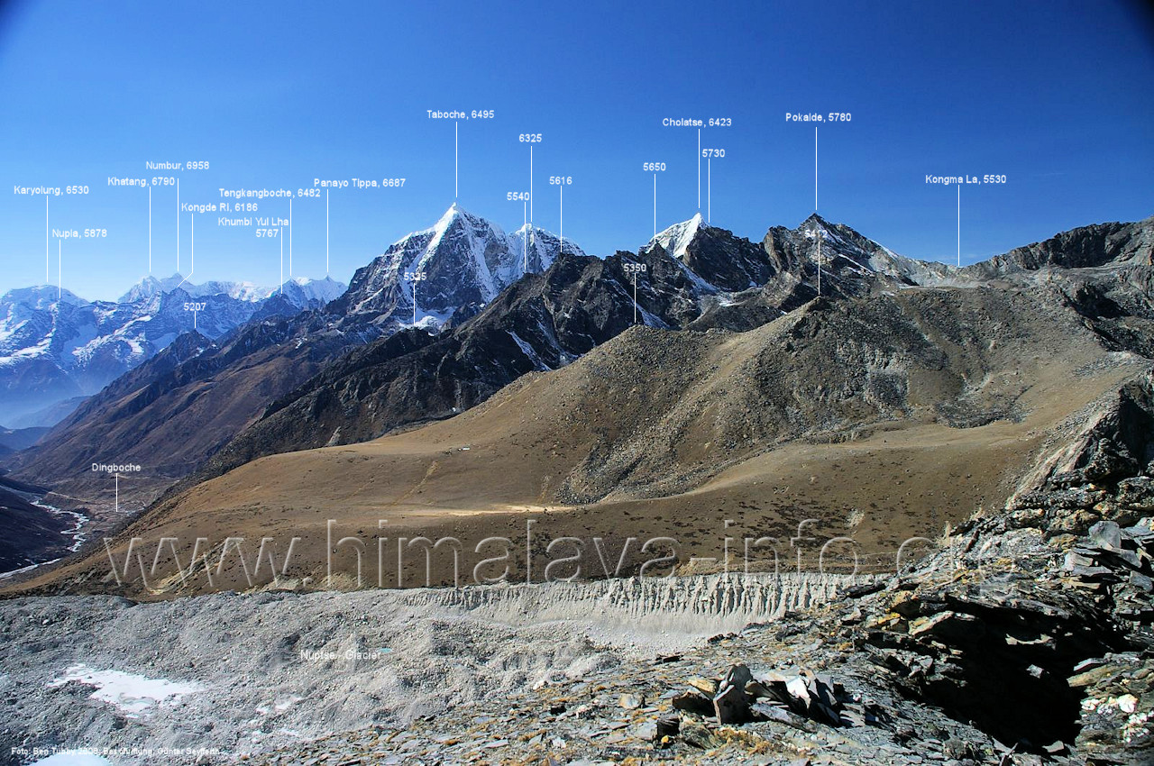 nach Westen mit Cholatse (6423 m), Pokalde (5780 m), Drangang Ri (6757 m),