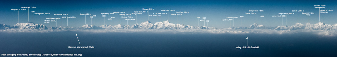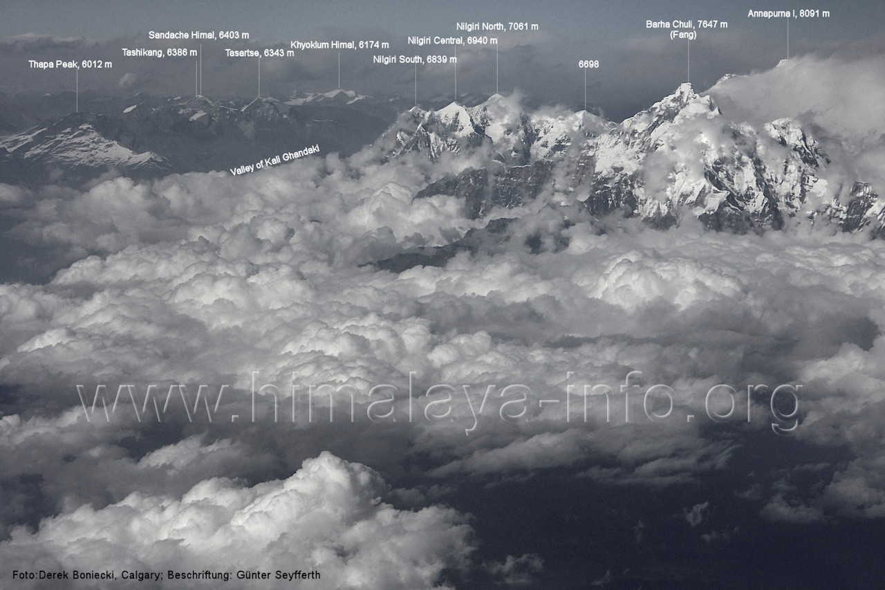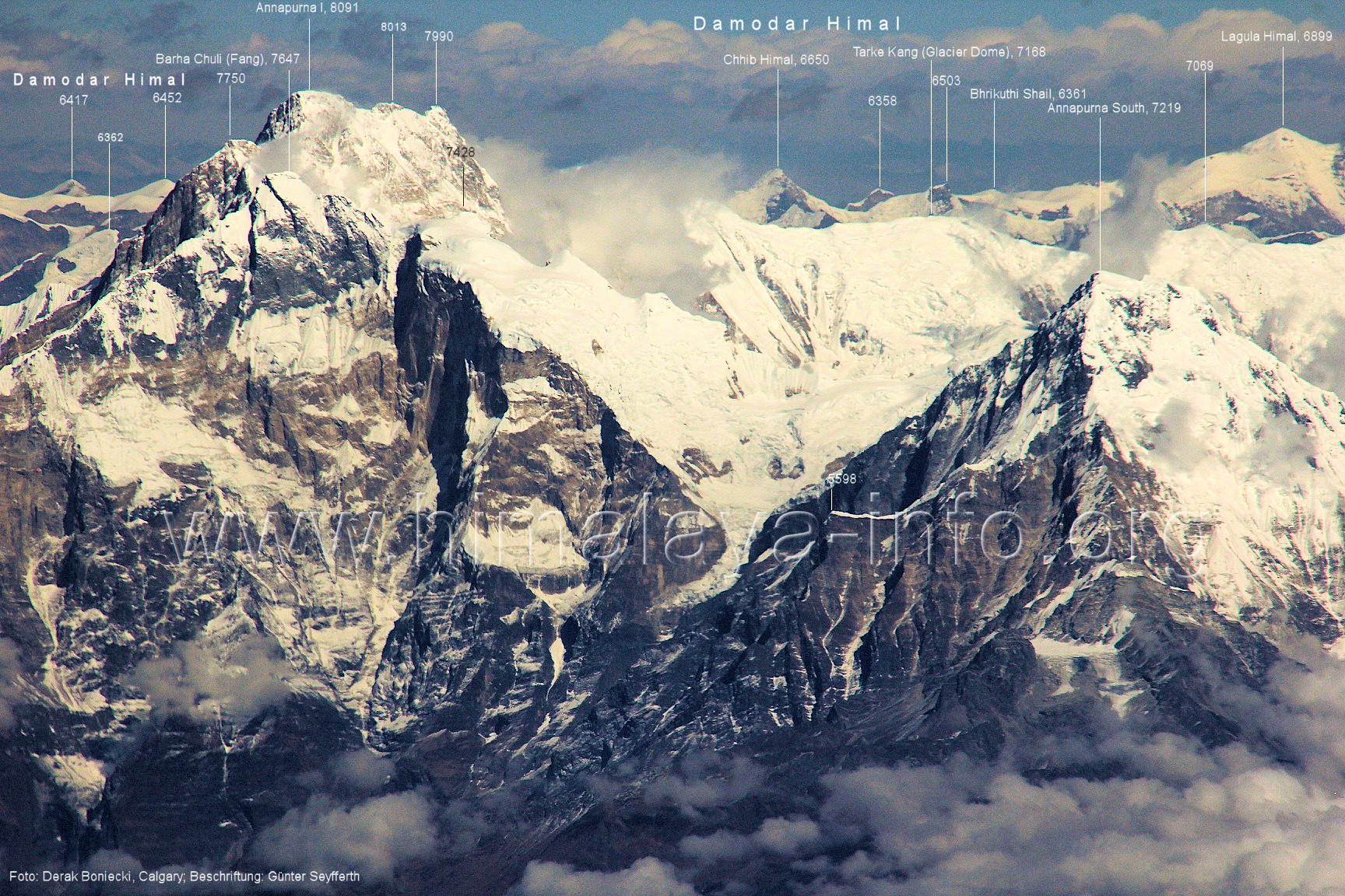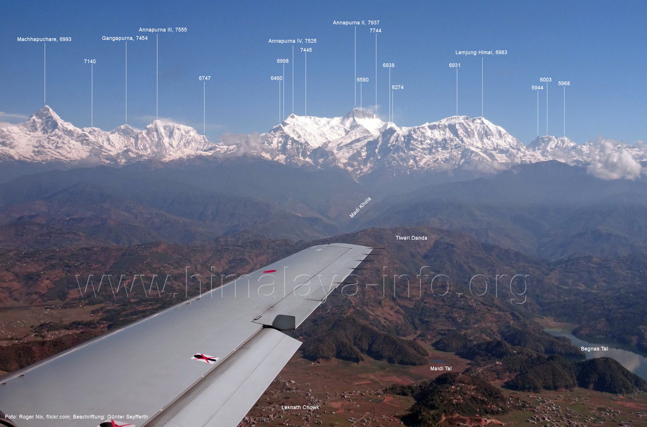 den Gipfeln des Myabasa Danda Das Foto wurde kurz nach dem Start in Pokhara in Richtung Westen aufgenommen Foto: Roger Nix, flickr.com; Beschriftung: Günter Seyfferth (41) Annapurna Himal von Annapurna I (8091 m) bis Annapurna II (7937 m) von Süd-Südosten Foto: Joachim Gründler; Beschriftung: Günter Seyfferth