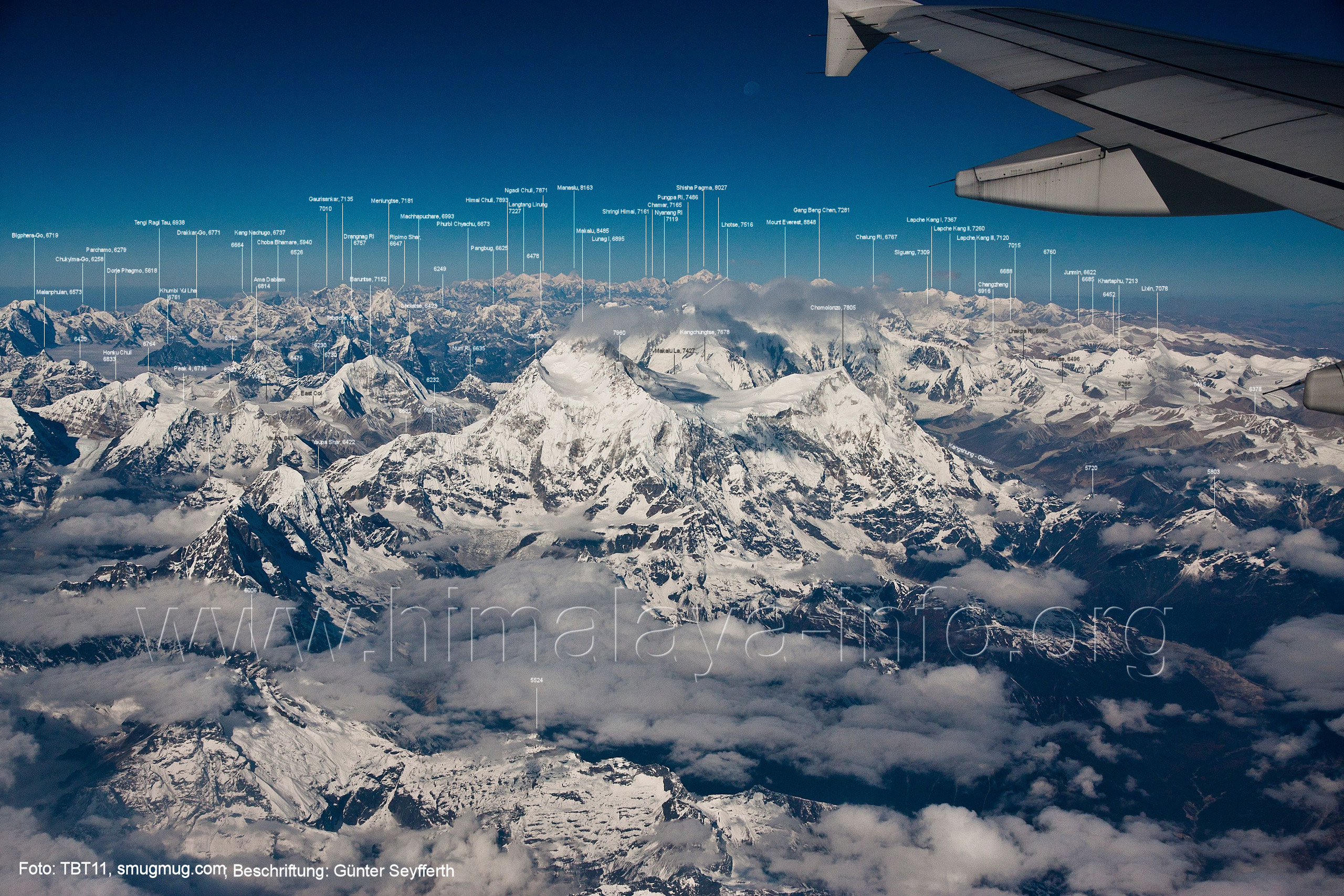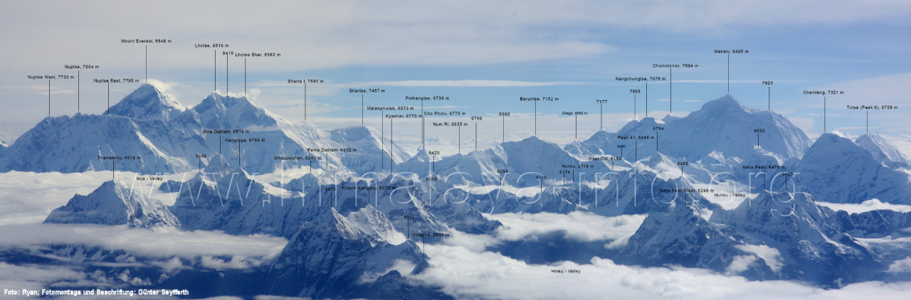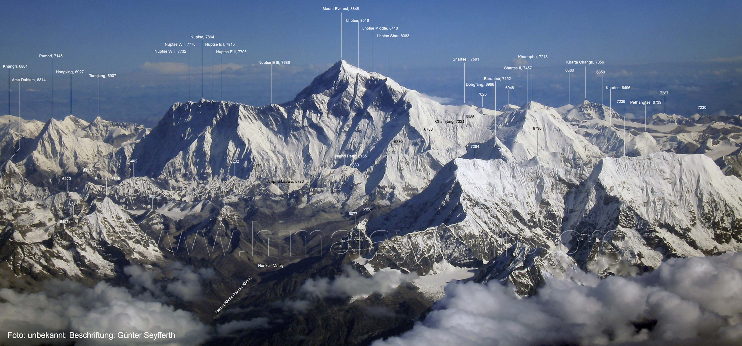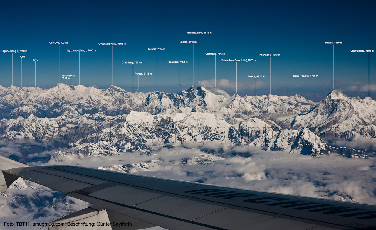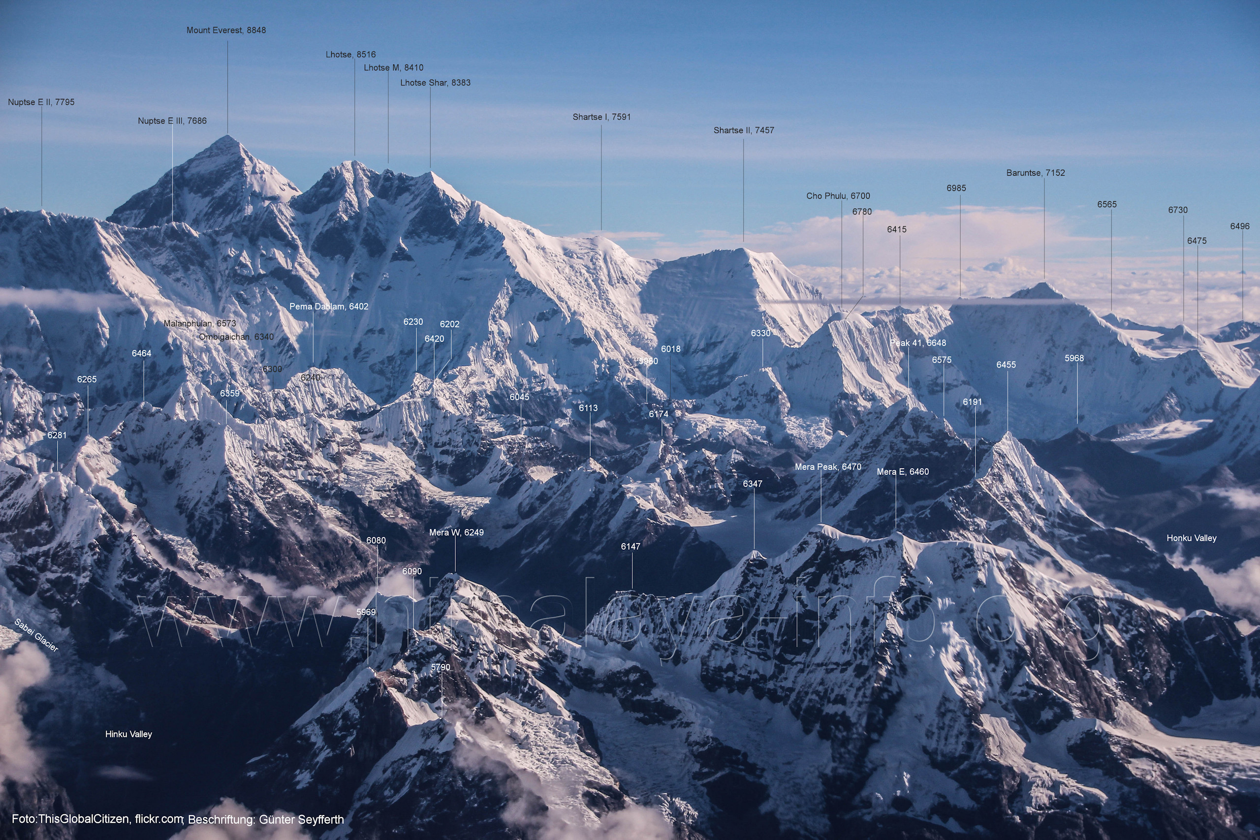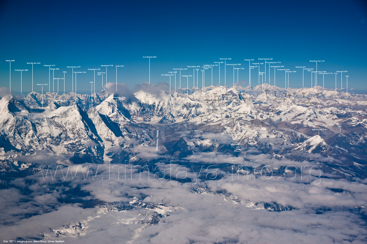 Pangma und Manaslu. Foto: bugswong, smugmug.com; Beschriftung: Günter Seyfferth (144) Makalu (8485 m), Lhotse (8516 m), Shisha Pangma (8027 m), Mount Everest (8848 m) und Cho Oyu (8201 m) von Osten
