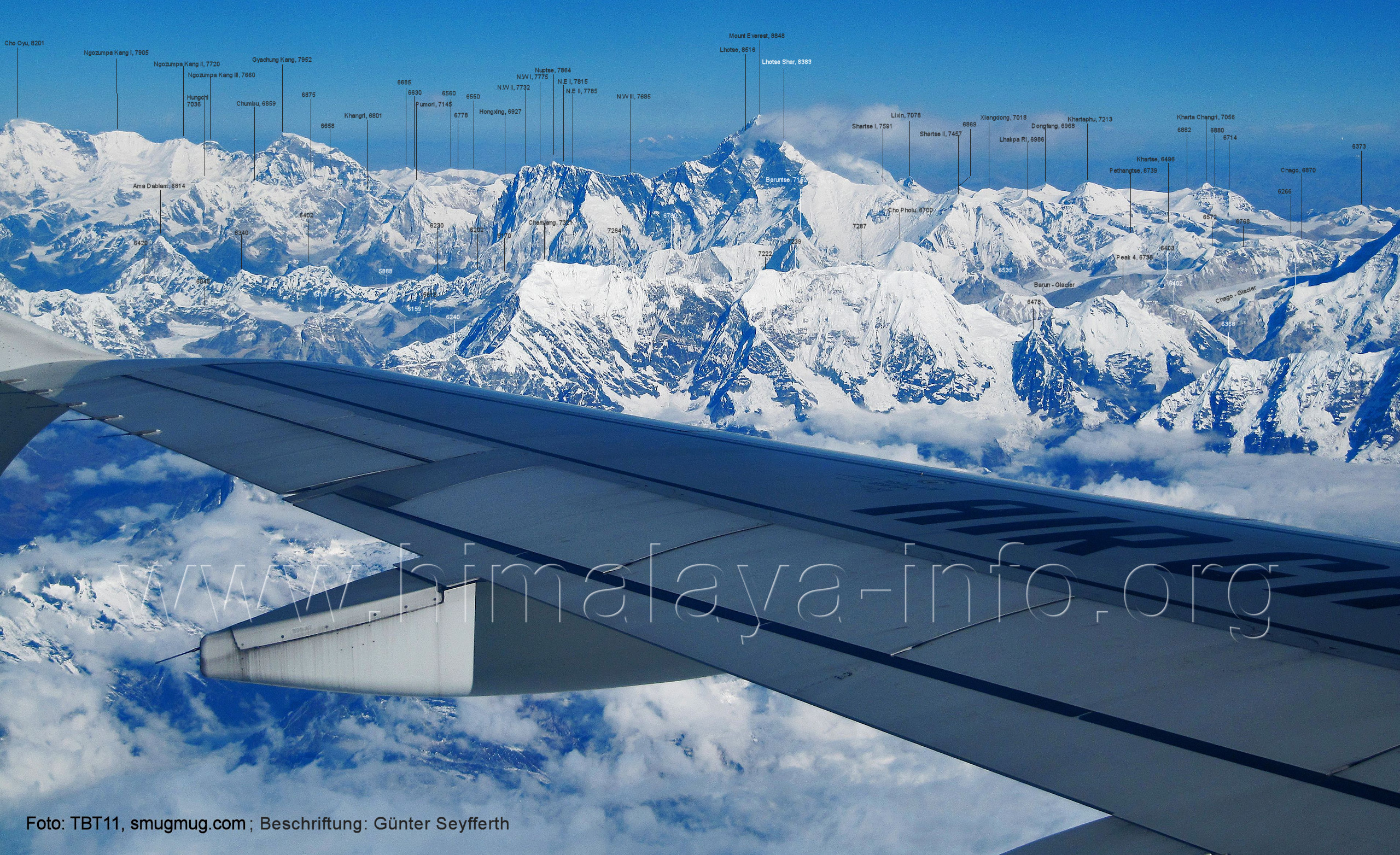 abbricht. Foto: Konrad Stumpf; Beschriftung: Günter Seyfferth (147) Tibet im Bereich von Makalu, Mount Everest und Cho Oyu von Osten Die Gipfel von Lhotse und Everest sind von Wolken verhüllt. Foto: bugswong, smugmug.com; Beschriftung: Günter Seyfferth An dieser Stelle muss die Beschreibung auf die Bildfolgen von zwei getrennten Flugrouten aufgeteilt werden: