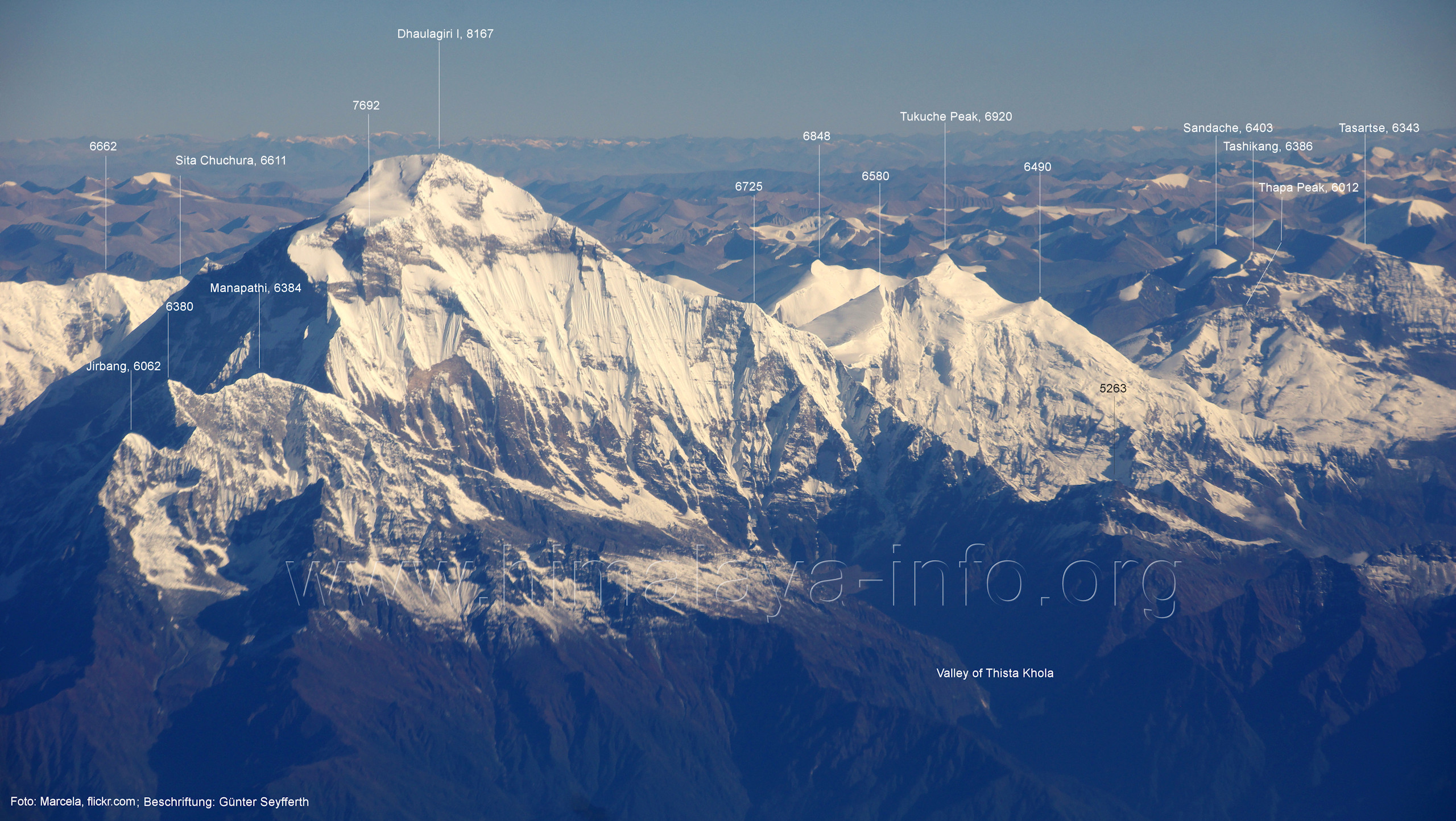 über 7000 m. Foto: Derek Boniecki, Calgary; Beschriftung: Günter Seyfferth (27) Dhaulagiri Himal von Süden Foto: Roger Nix, flickr.com; Beschriftung: Günter Seyfferth (28) Dhaulagiri I (8167 m) und Tukuche Peak (6920 m) von Süden Foto: Marcela, flickr.com; Beschriftung: Günter Seyfferth (29) Die Gipfel des östlichen Dhaulagiri Himal von Süden